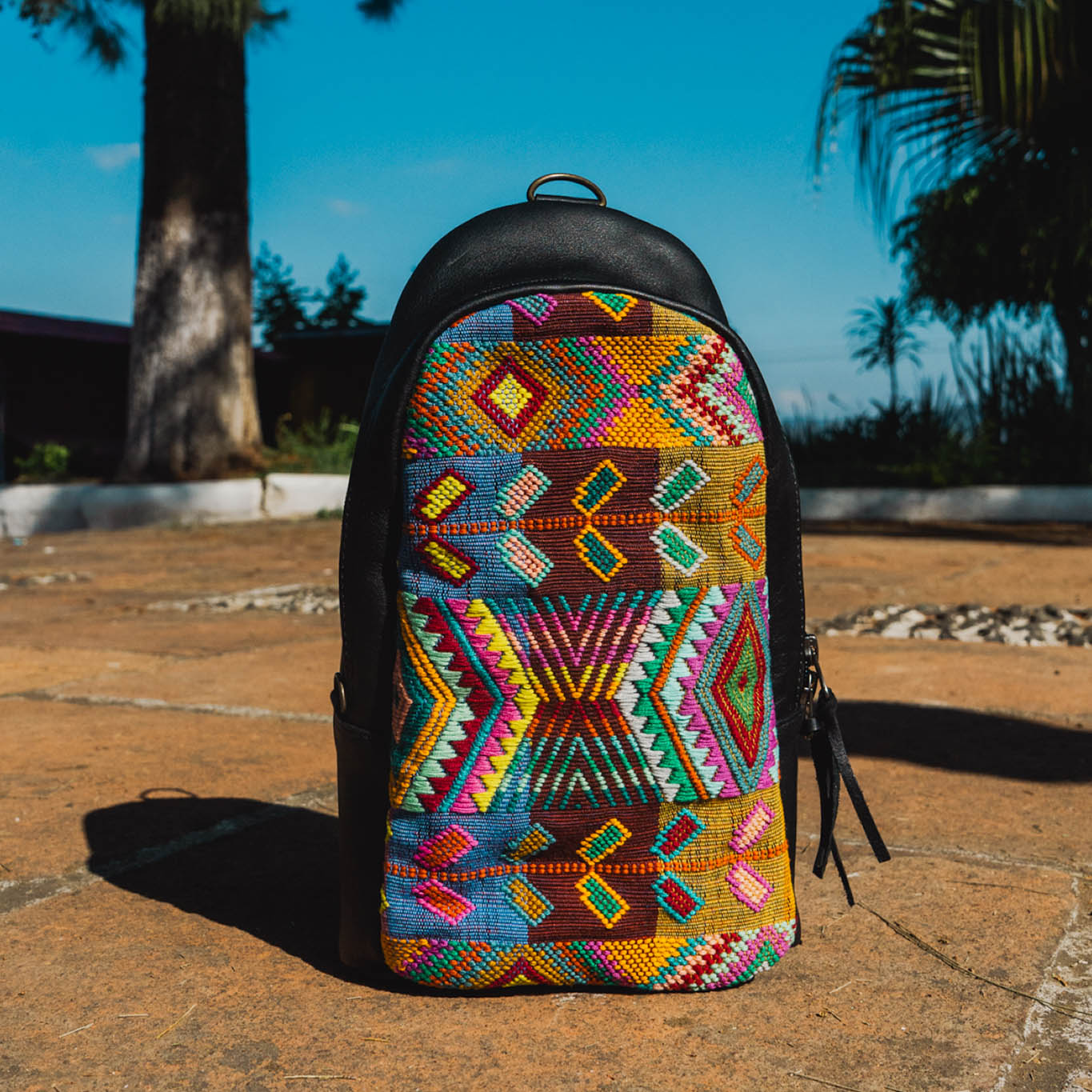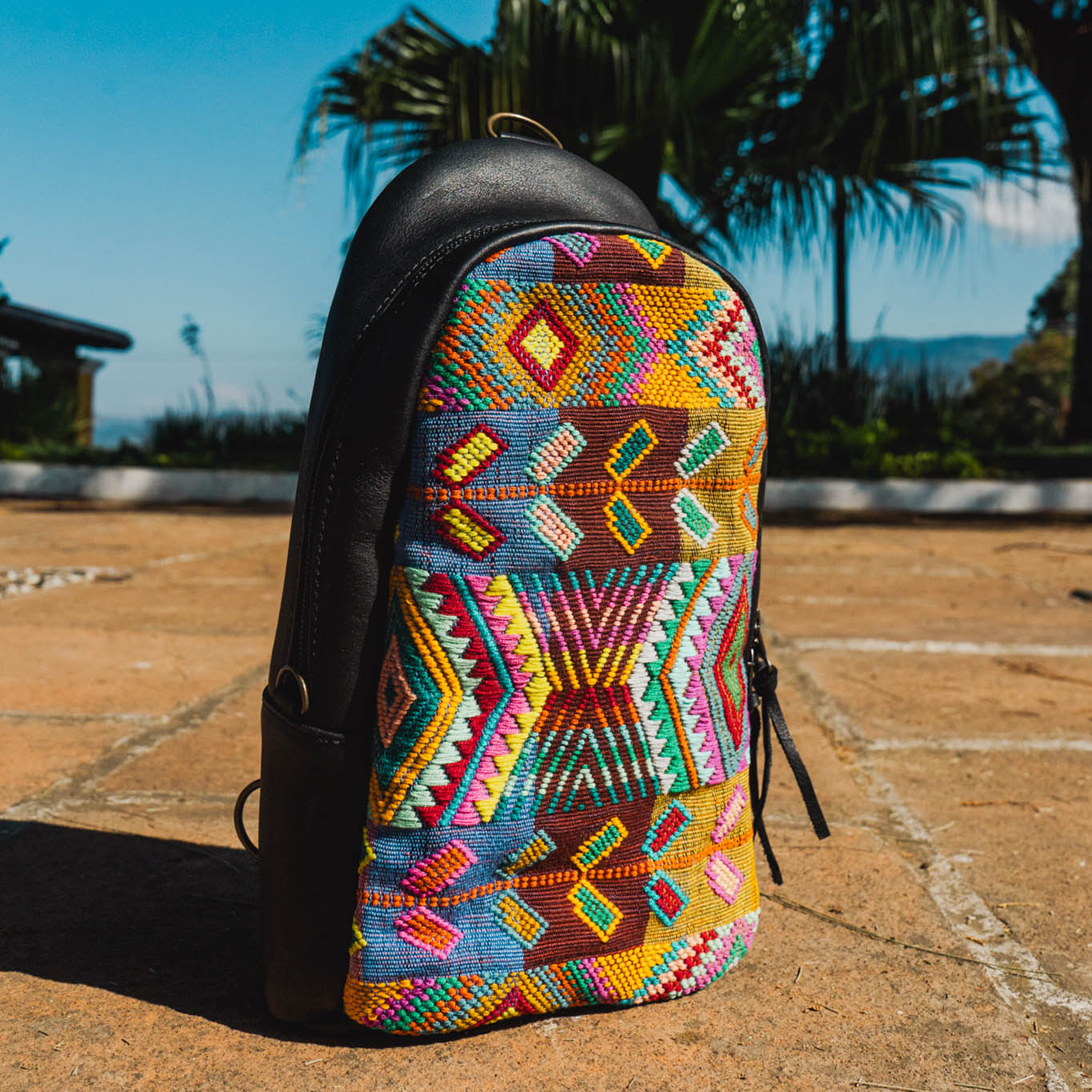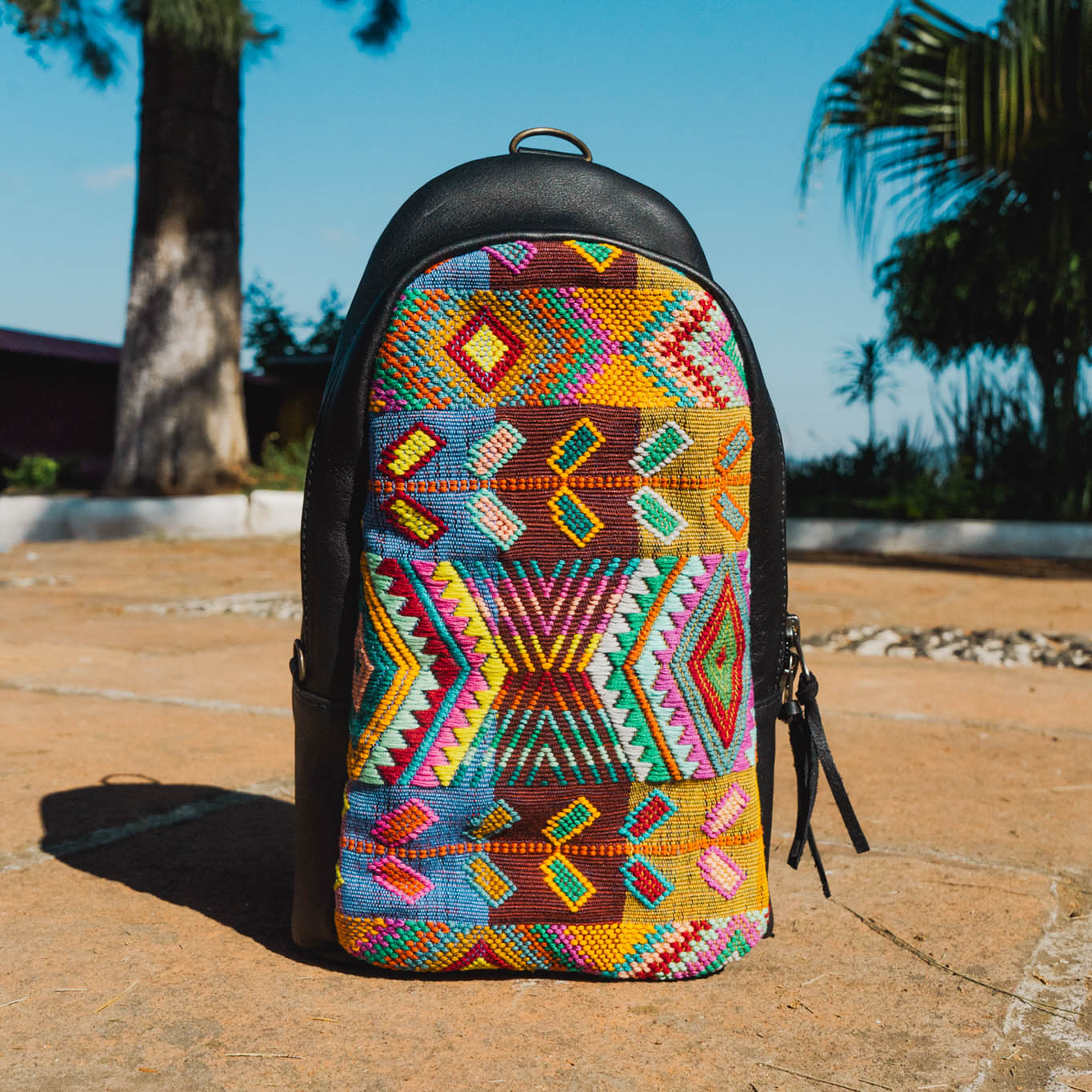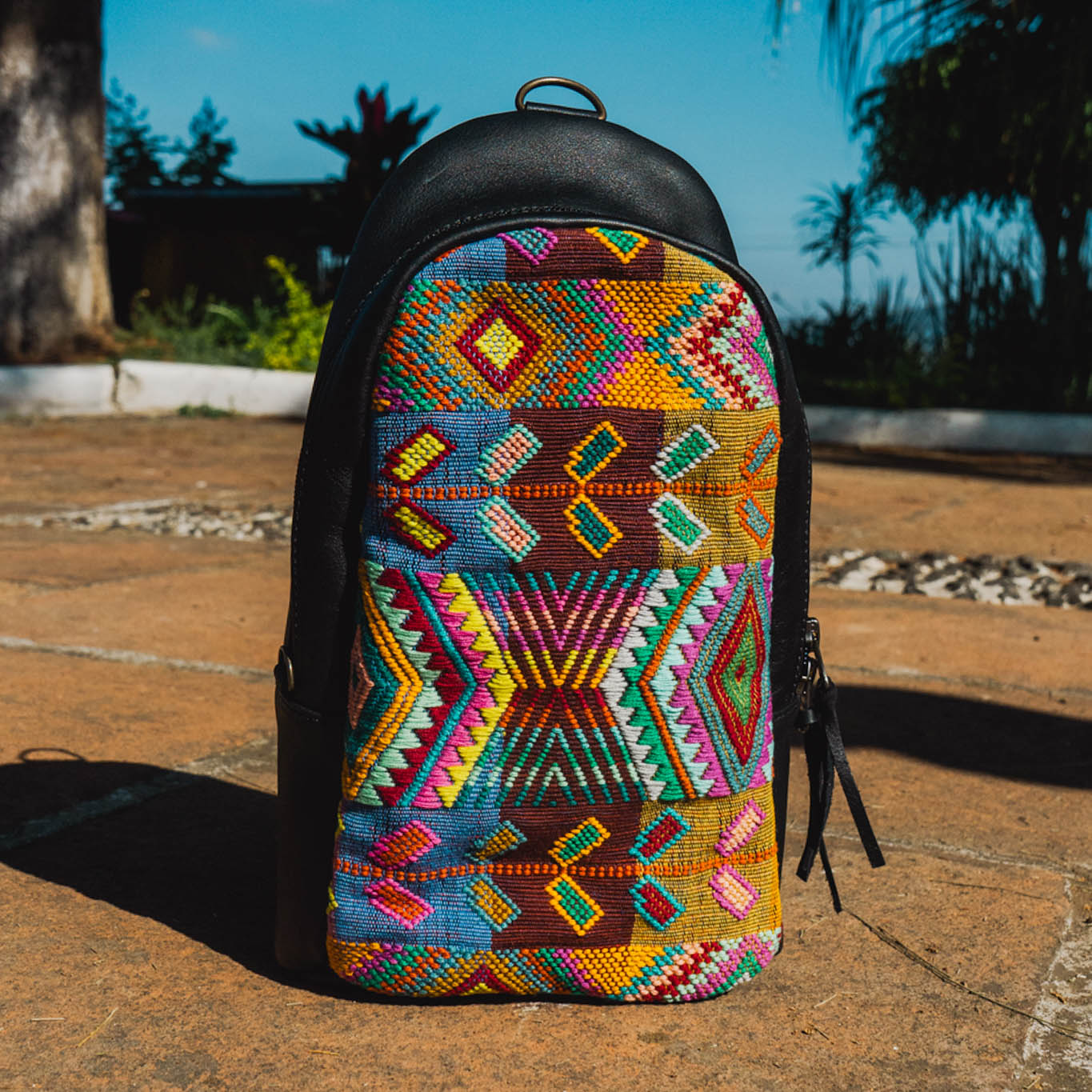 Many unique Maya symbols can be found in our One of a Kind Collection. The fabric we use for this collection is made from upcycled vintage huipiles (traditional attire worn by women in Guatemala) that were handwoven by Artisans up to 10 years ago, and they have lived a full life before being incorporated into your leather bag!