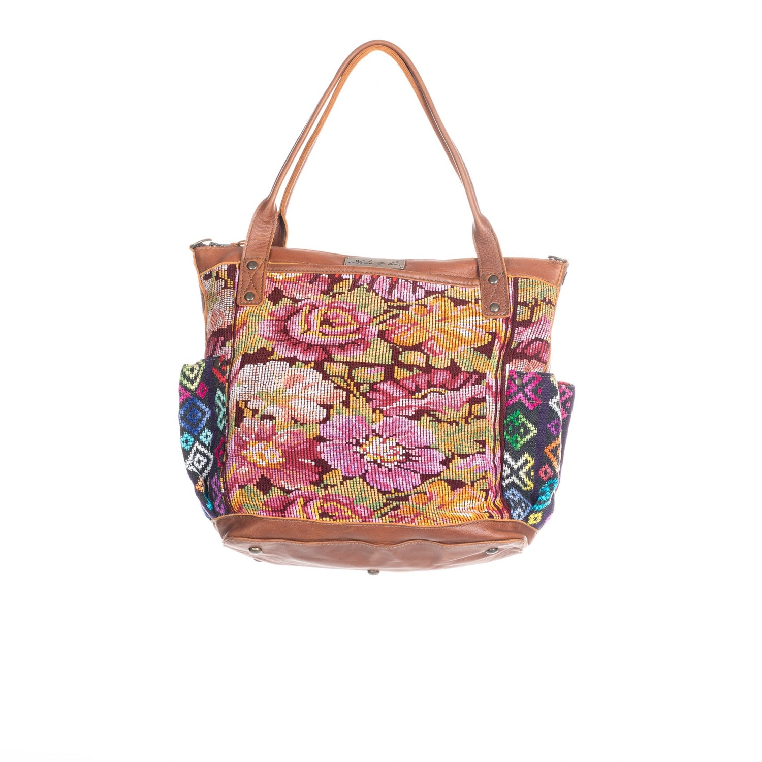 Many unique Maya symbols can be found in our One of a Kind Collection. The fabric we use for this collection is made from upcycled vintage huipiles (traditional attire worn by women in Guatemala) that were handwoven by Artisans up to 10 years ago, and they have lived a full life before being incorporated into your leather bag!