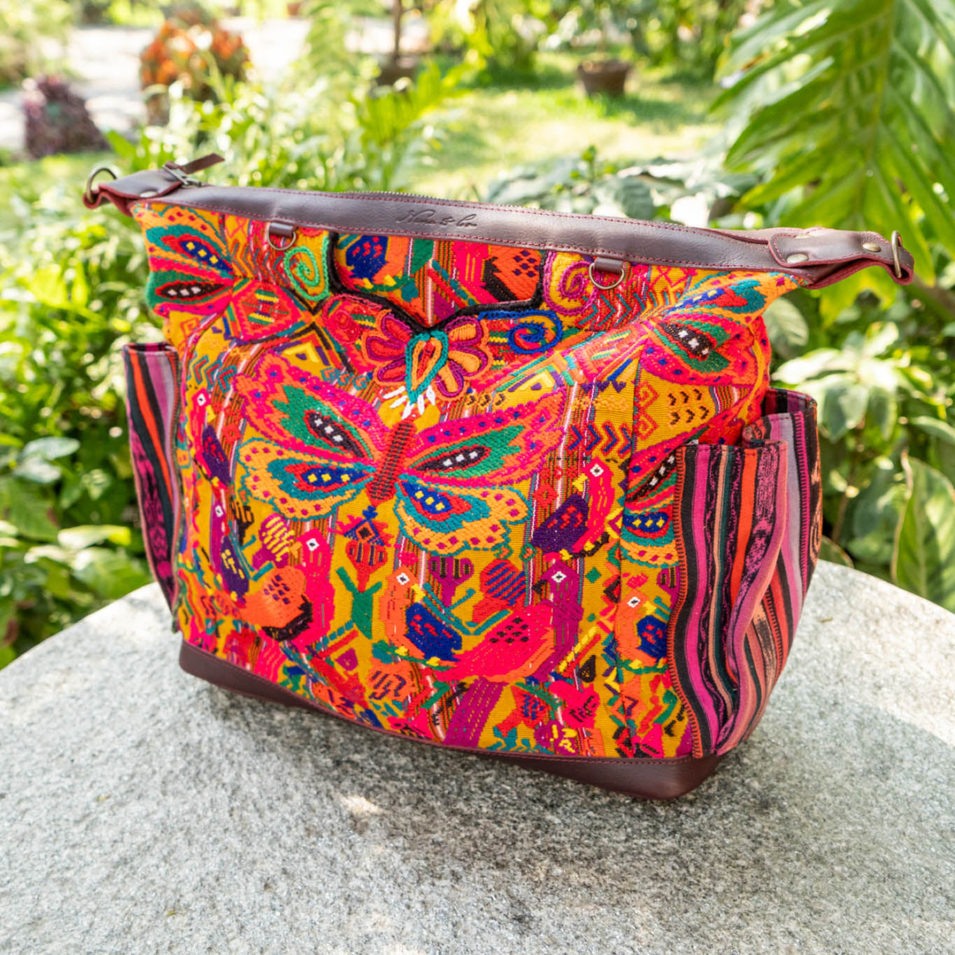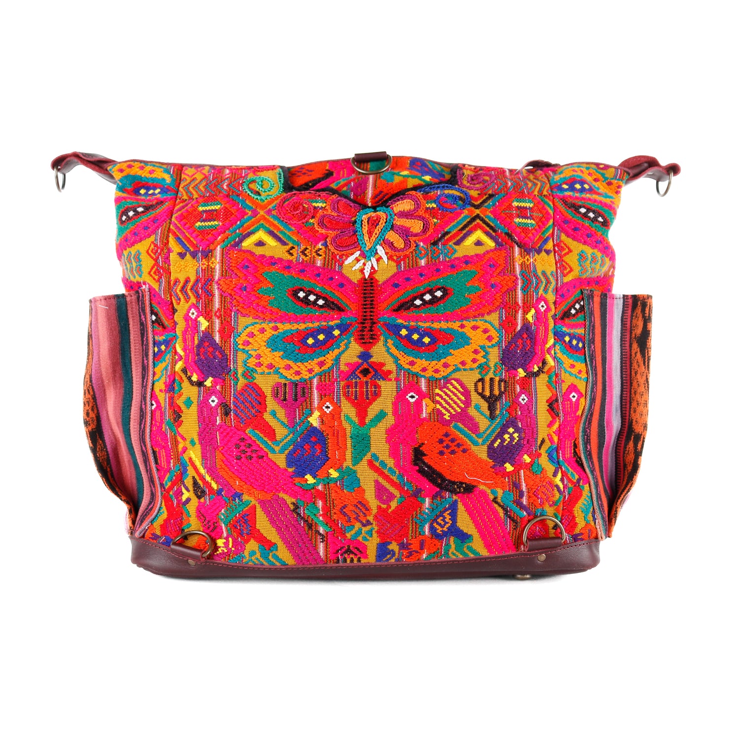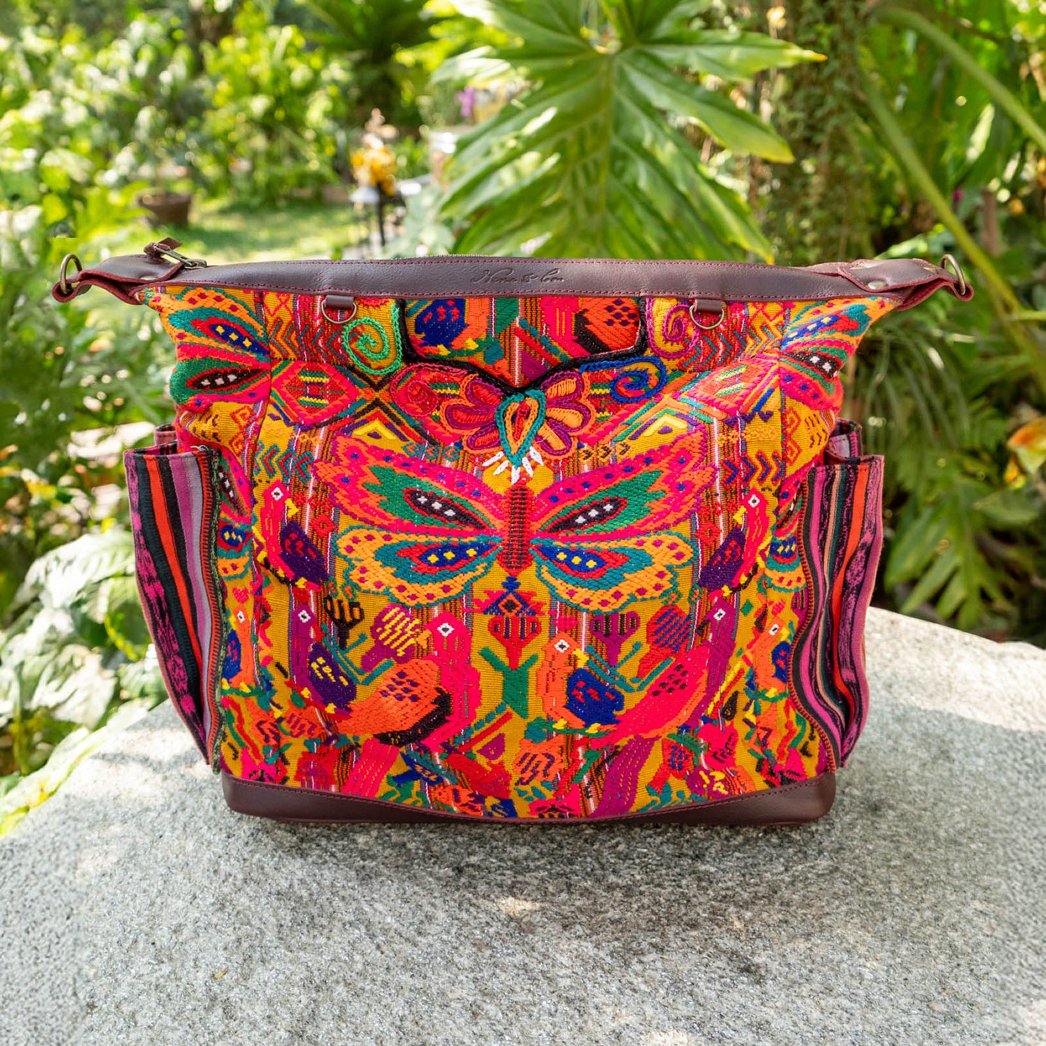 Many unique Maya symbols can be found in our One of a Kind Collection. The fabric we use for this collection is made from upcycled vintage huipiles (traditional attire worn by women in Guatemala) that were handwoven by Artisans up to 10 years ago, and they have lived a full life before being incorporated into your leather bag!