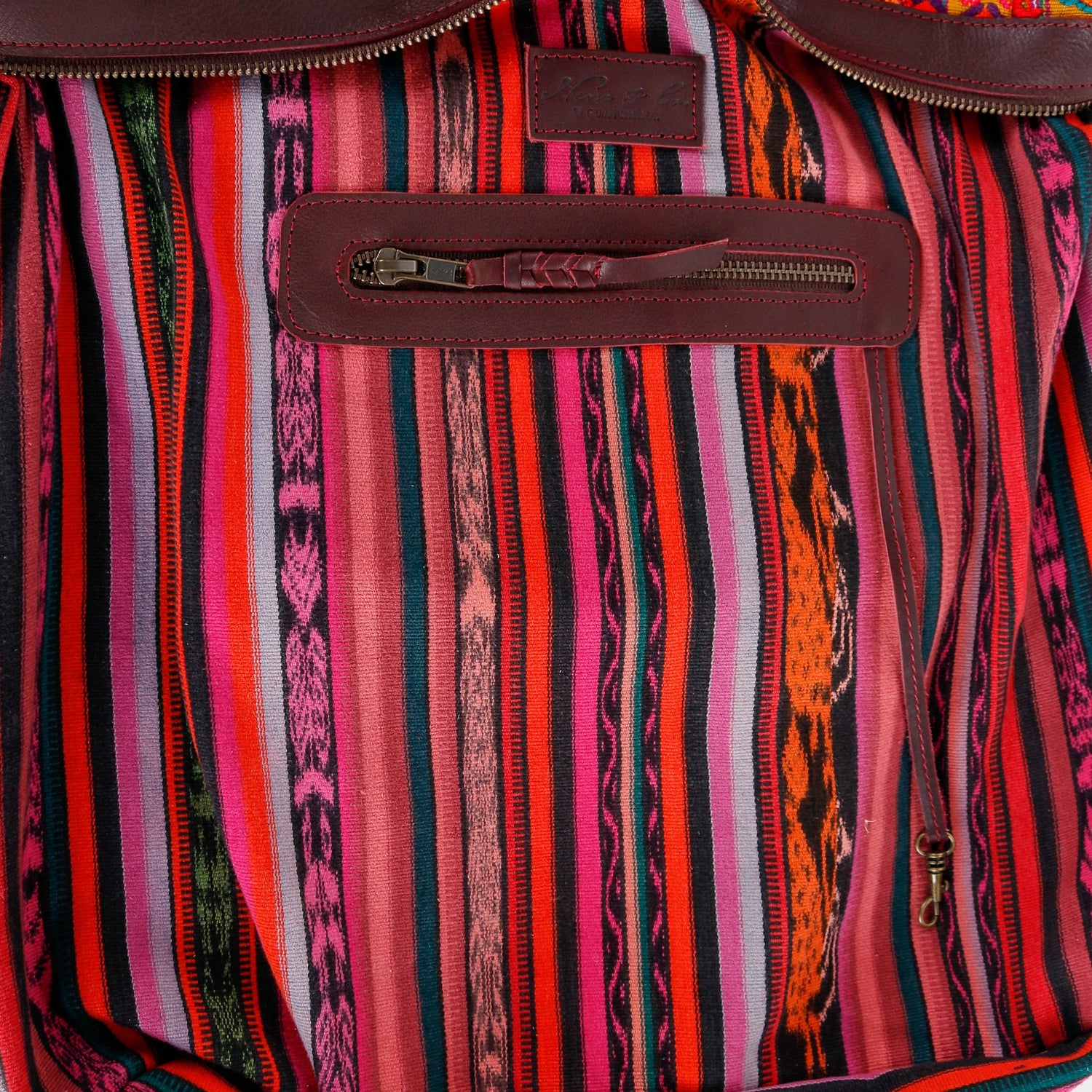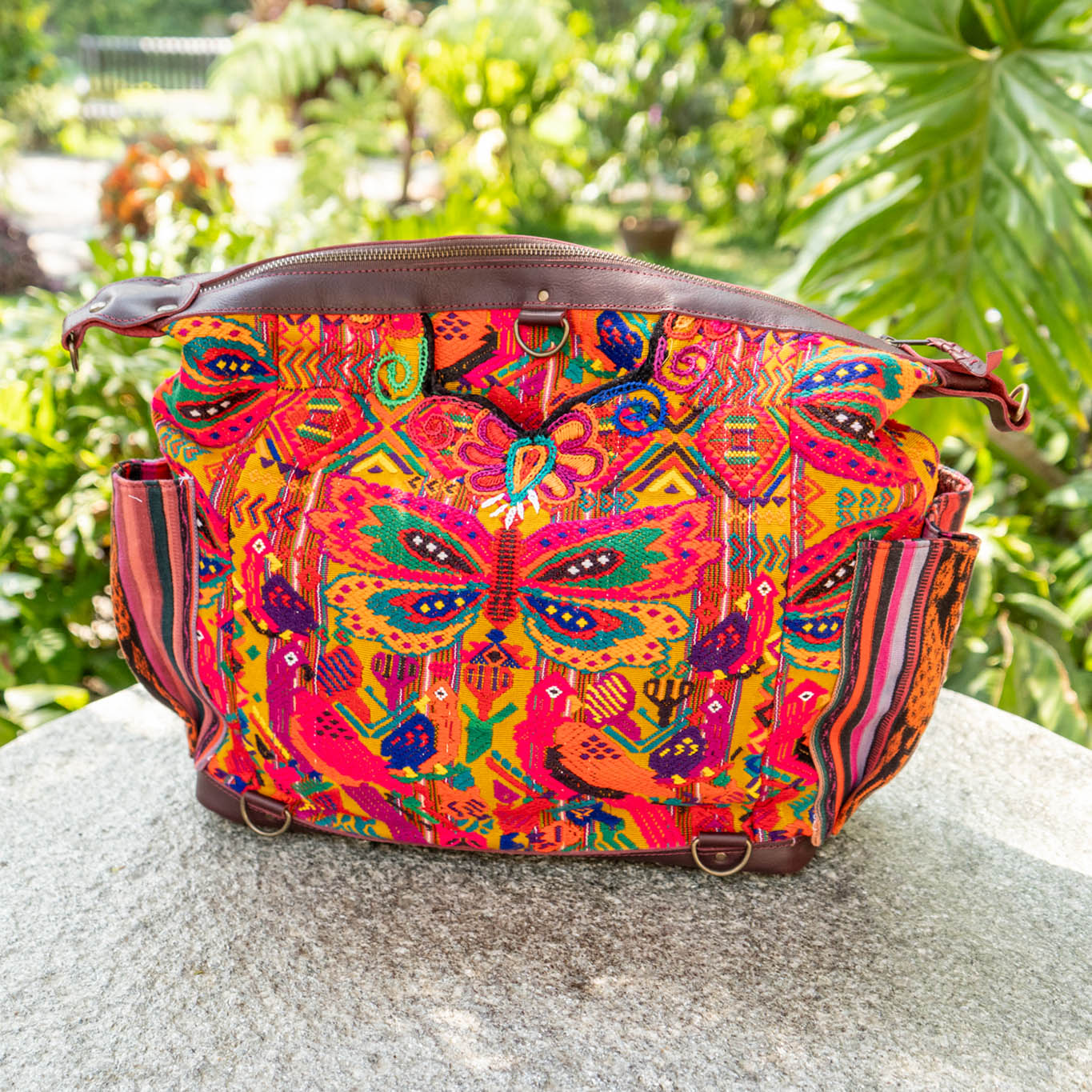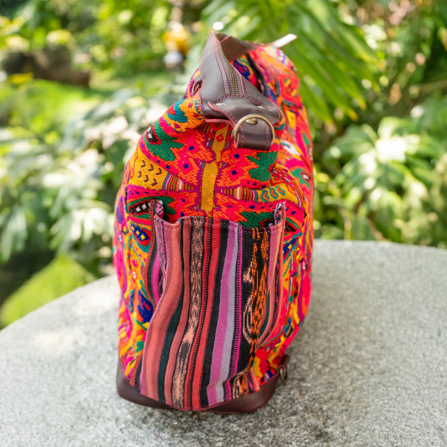Many unique Maya symbols can be found in our One of a Kind Collection. The fabric we use for this collection is made from upcycled vintage huipiles (traditional attire worn by women in Guatemala) that were handwoven by Artisans up to 10 years ago, and they have lived a full life before being incorporated into your leather bag!