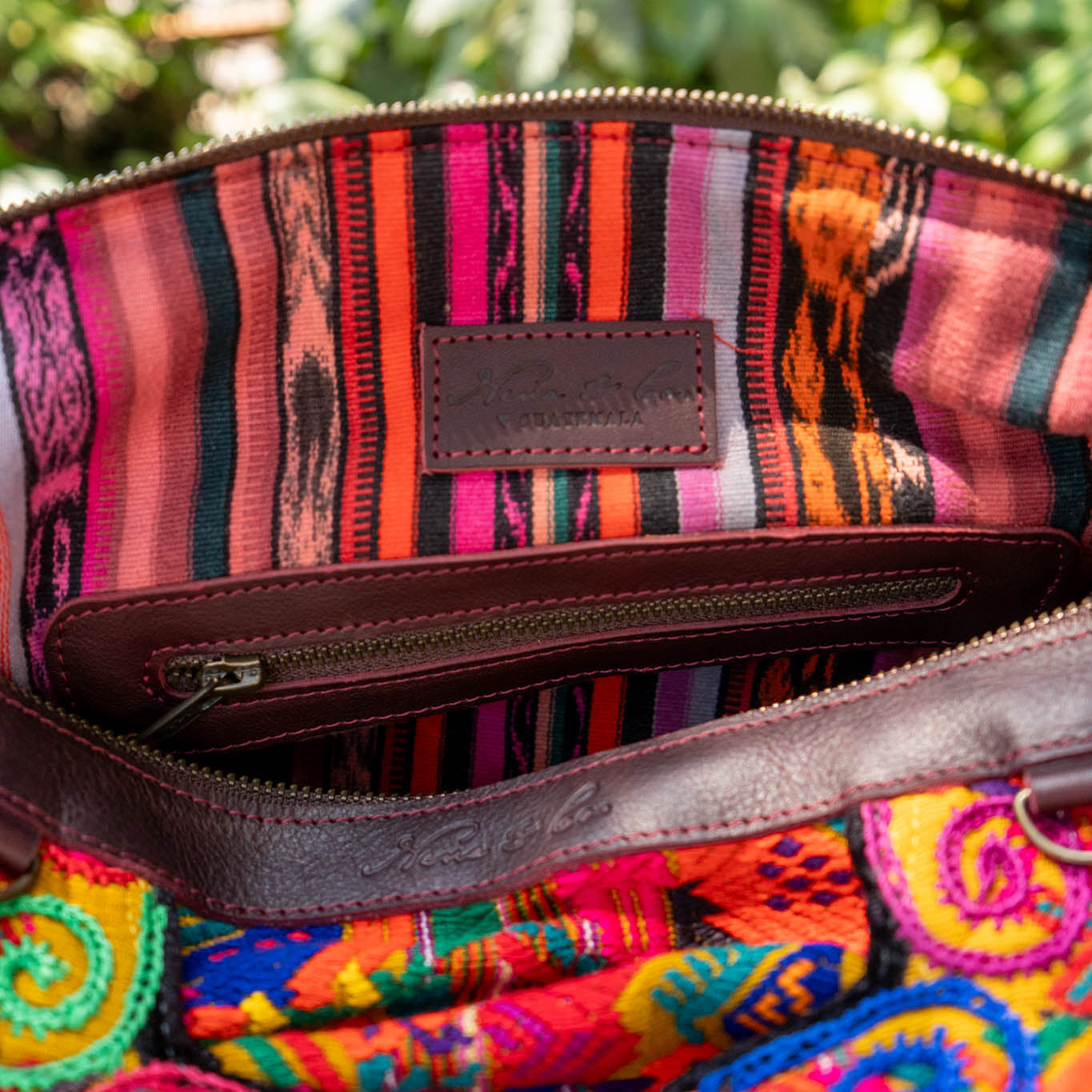 We make every effort to provide our customers with the best-handcrafted and high-quality bags. Please note that all our processes to make the bags are done by hand, from curing, cutting, and treating the leather to using up-cycled huipils. Our bags have natural characteristics and qualities that should not be considered as flaws or as damage because they do not interfere with the functionality of the bag. We up-cycle vintage Maya clothing to make beautiful one-of-a-kind products. Many times you will find snags in the pattern. This is normal. Should your patterned huipil snag you can snip the loose threads with scissors. Do not pull them.
