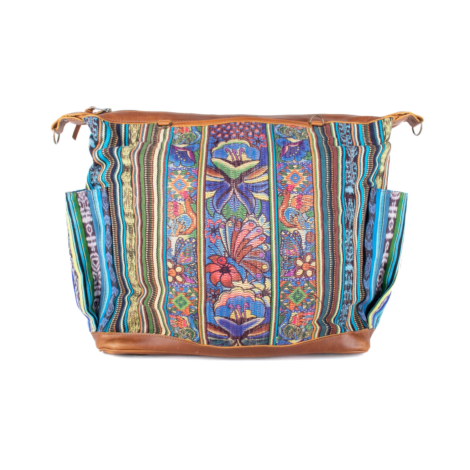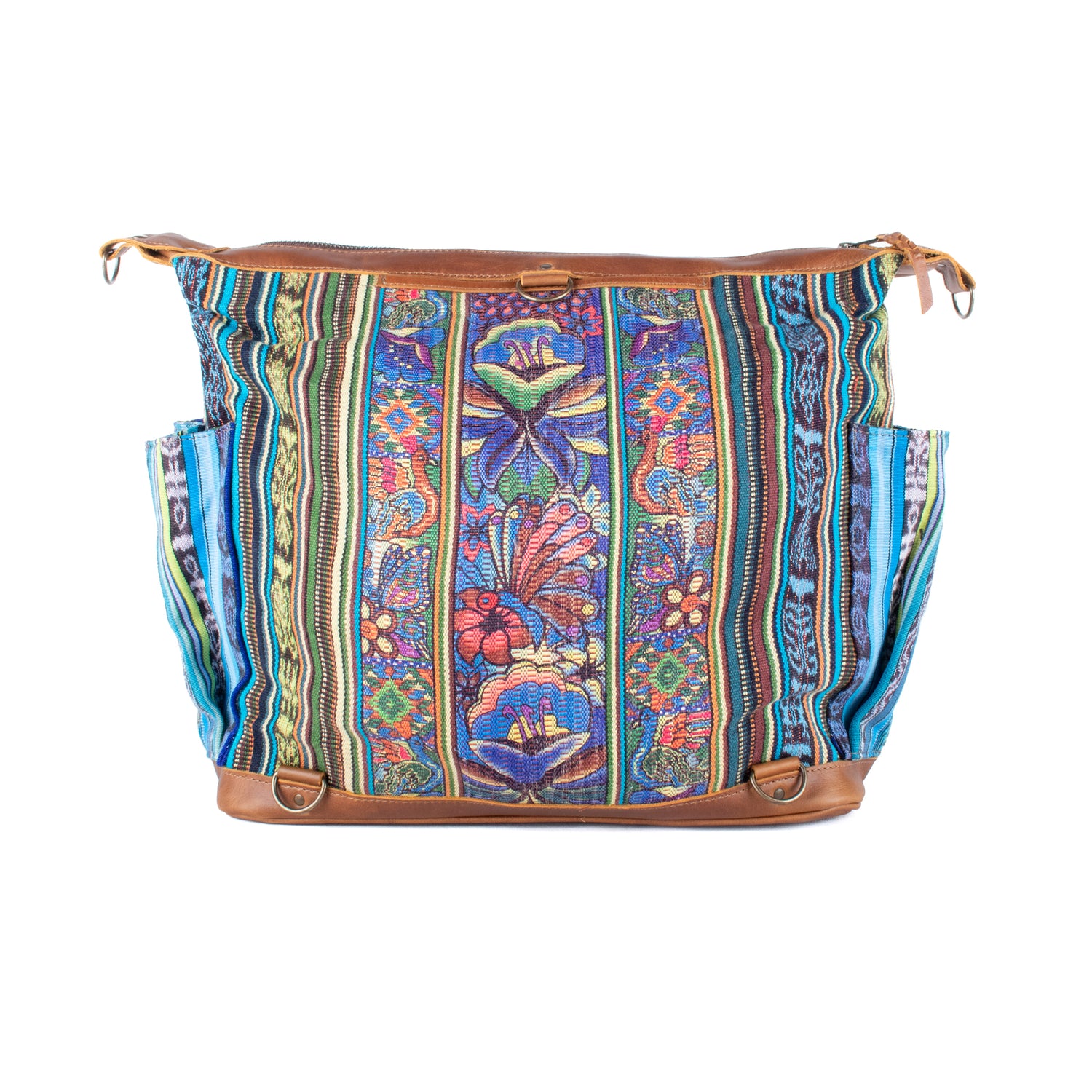 Many unique Maya symbols can be found in our One of a Kind Collection. The fabric we use for this collection is made from upcycled vintage huipiles (traditional attire worn by women in Guatemala) that were handwoven by Artisans up to 10 years ago, and they have lived a full life before being incorporated into your leather bag!