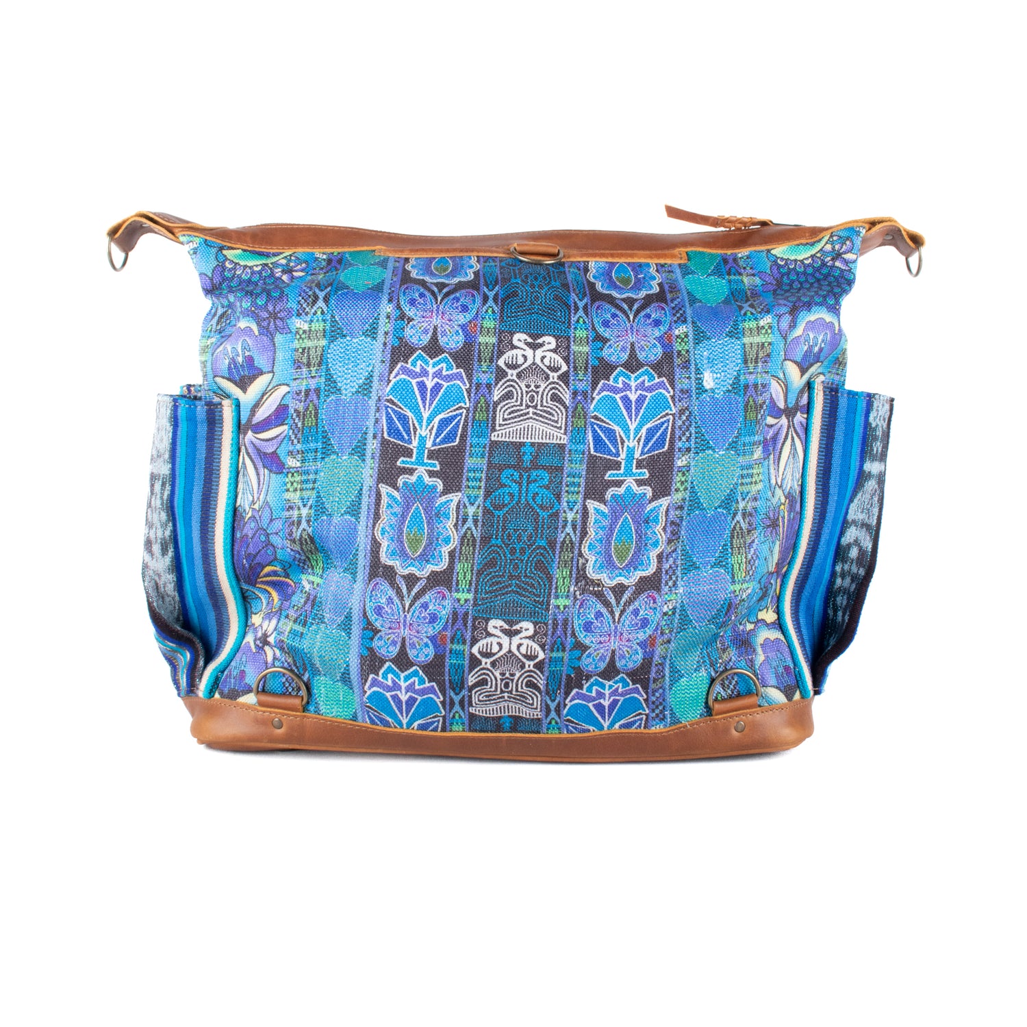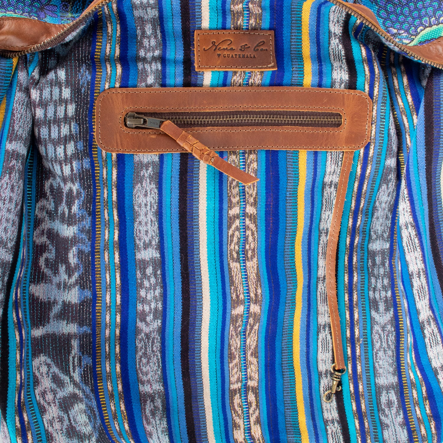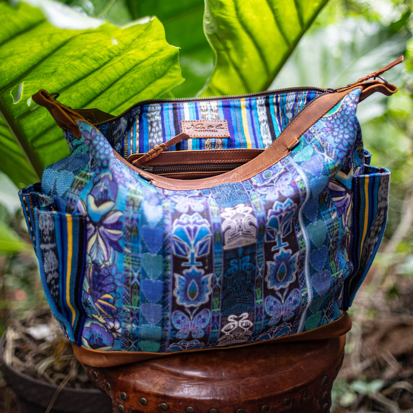 Many unique Maya symbols can be found in our One of a Kind Collection. The fabric we use for this collection is made from upcycled vintage huipiles (traditional attire worn by women in Guatemala) that were handwoven by Artisans up to 10 years ago, and they have lived a full life before being incorporated into your leather bag!