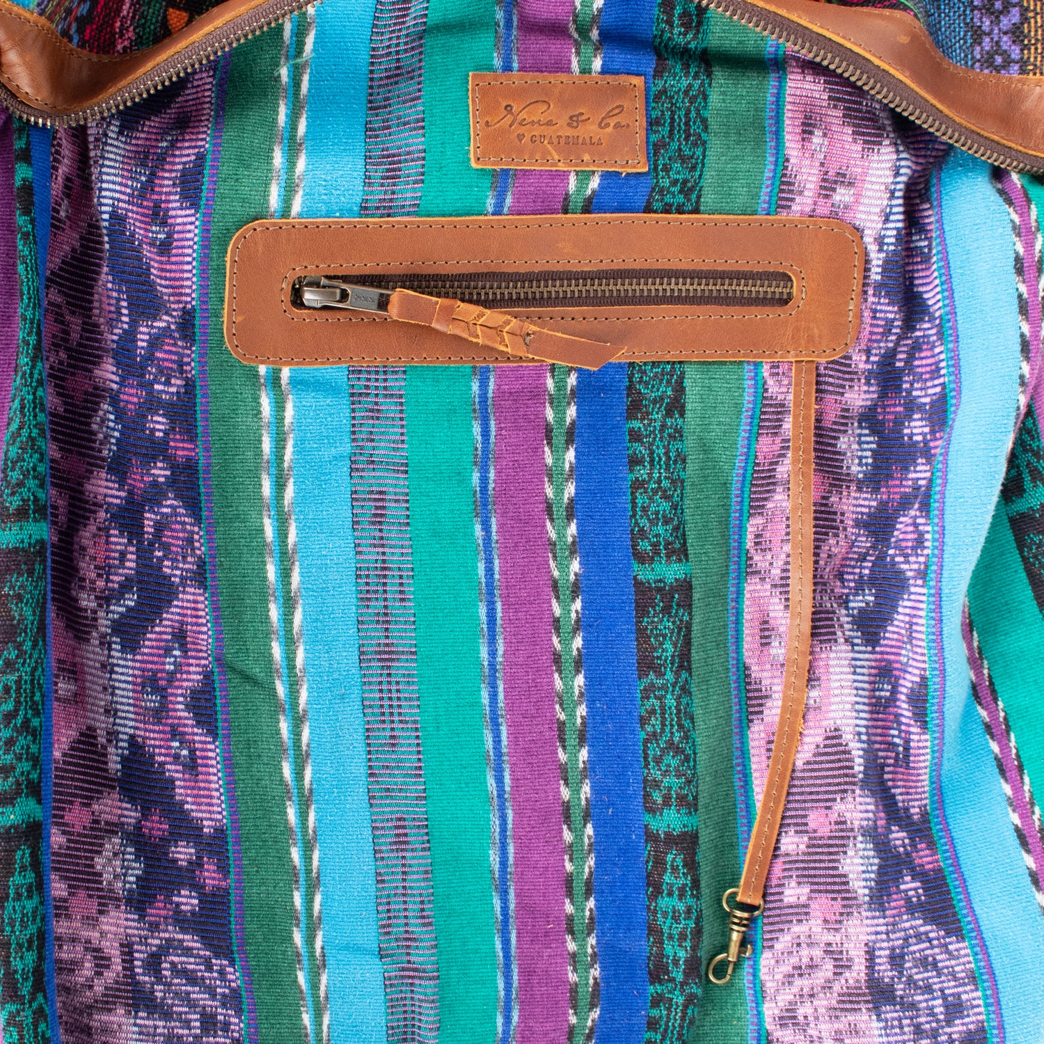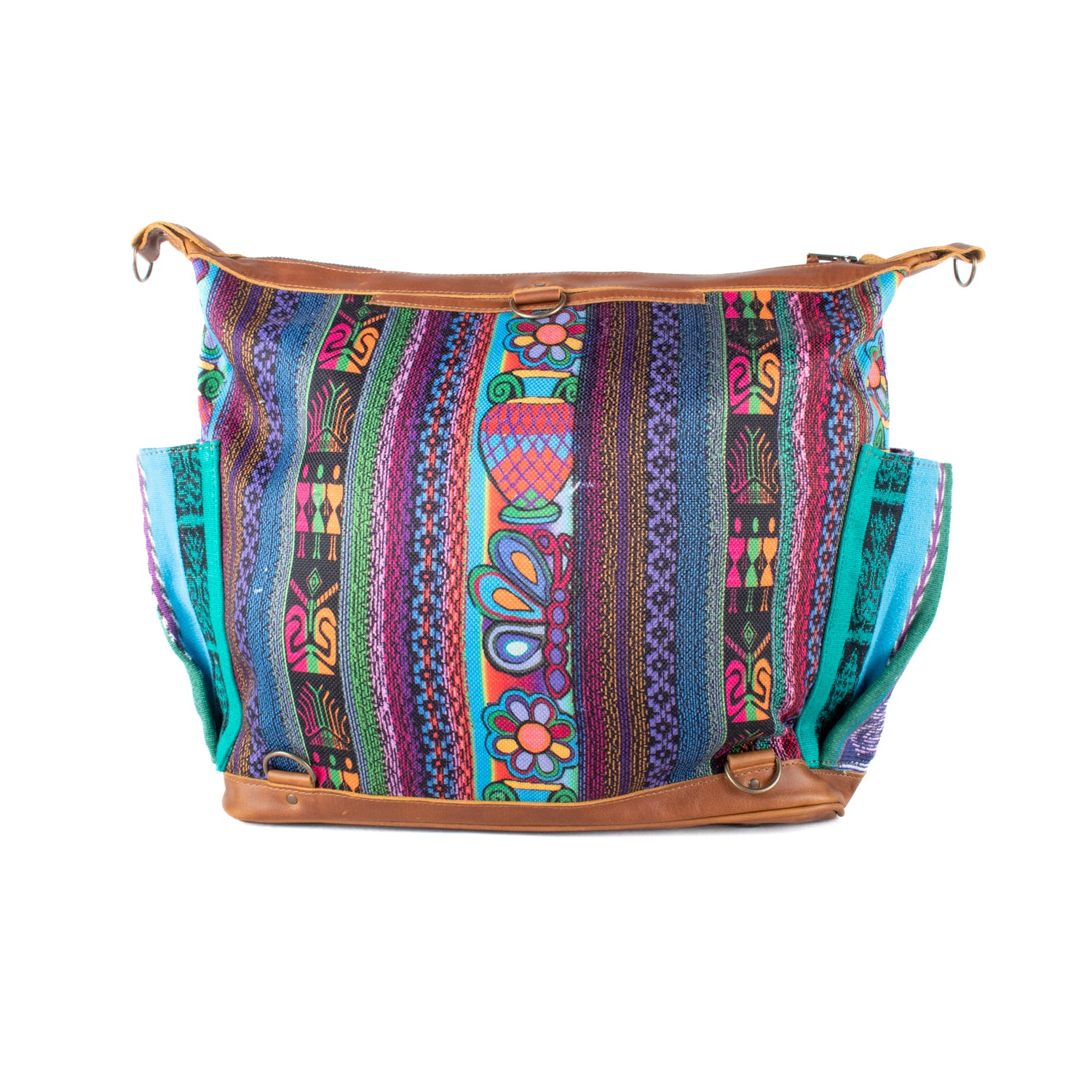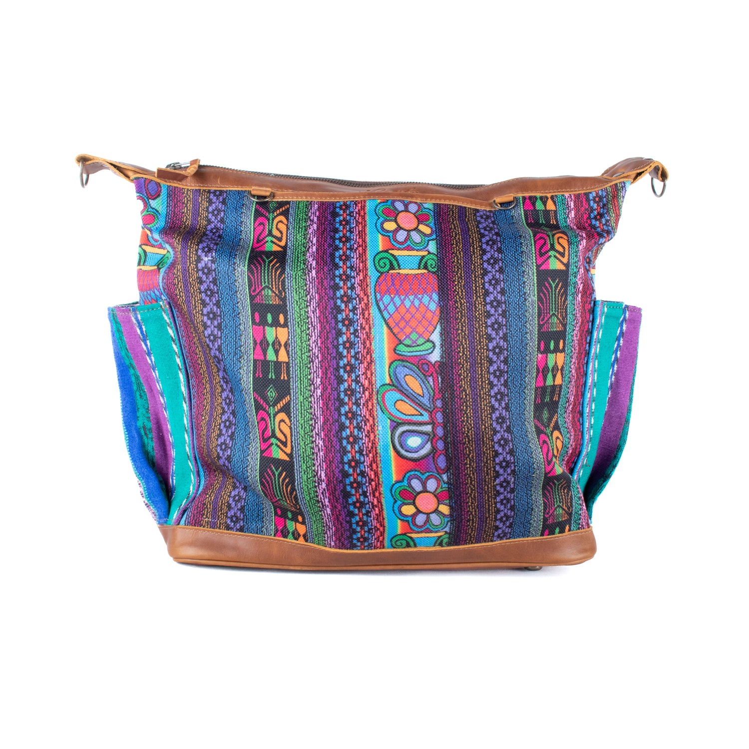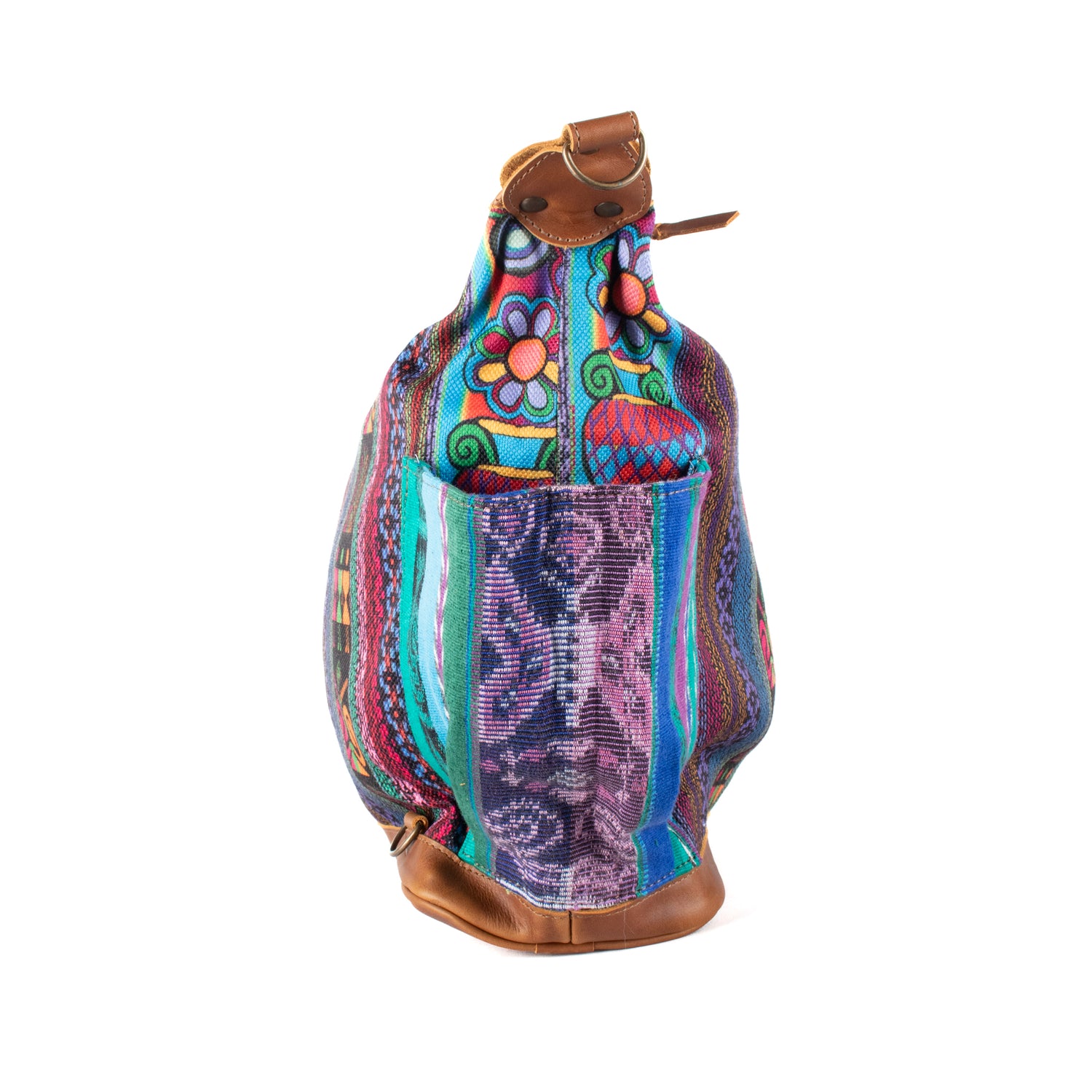 Many unique Maya symbols can be found in our One of a Kind Collection. The fabric we use for this collection is made from upcycled vintage huipiles (traditional attire worn by women in Guatemala) that were handwoven by Artisans up to 10 years ago, and they have lived a full life before being incorporated into your leather bag!