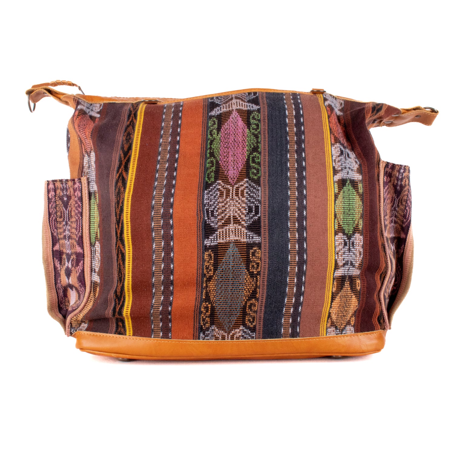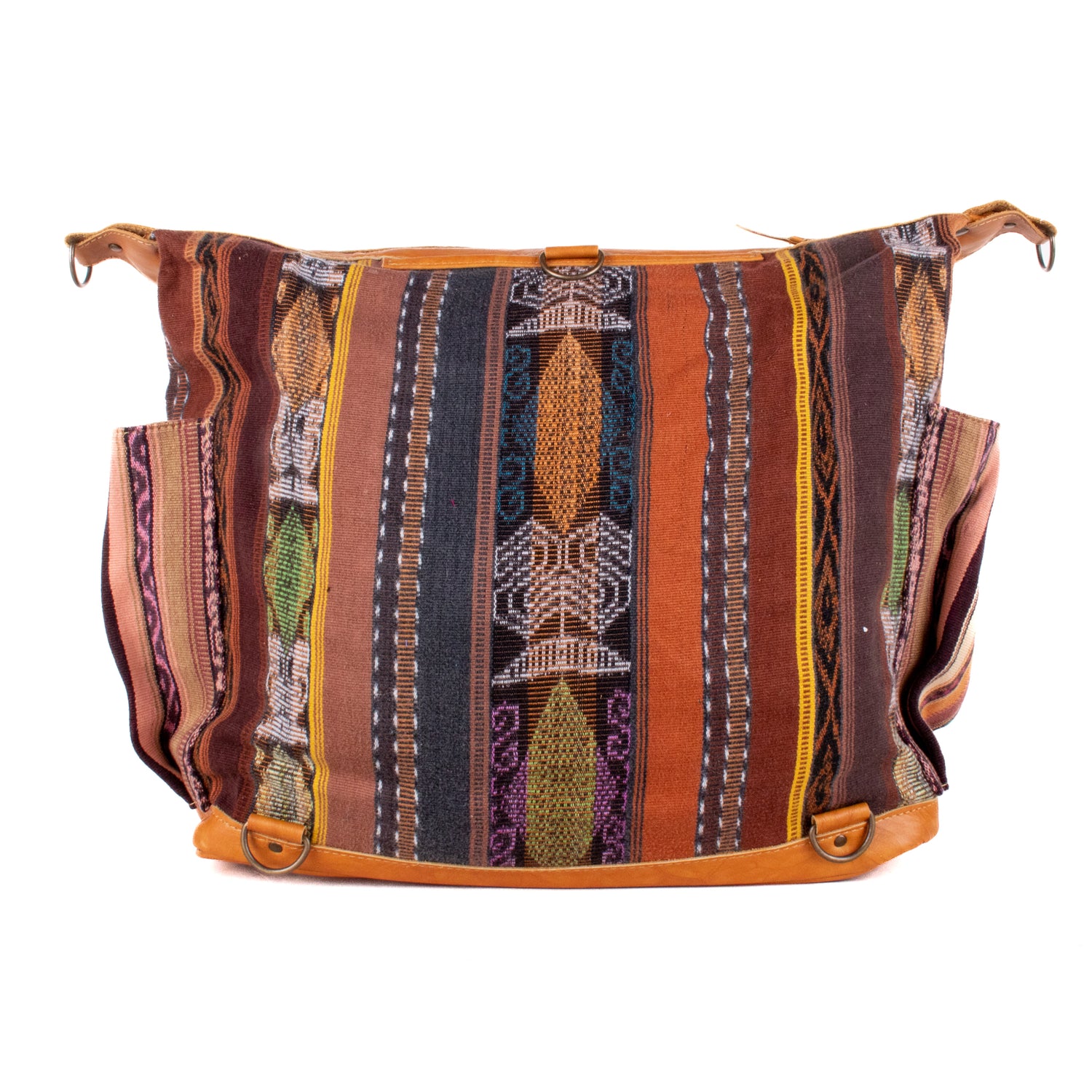 Many unique Maya symbols can be found in our One of a Kind Collection. The fabric we use for this collection is made from upcycled vintage huipiles (traditional attire worn by women in Guatemala) that were handwoven by Artisans up to 10 years ago, and they have lived a full life before being incorporated into your leather bag!
