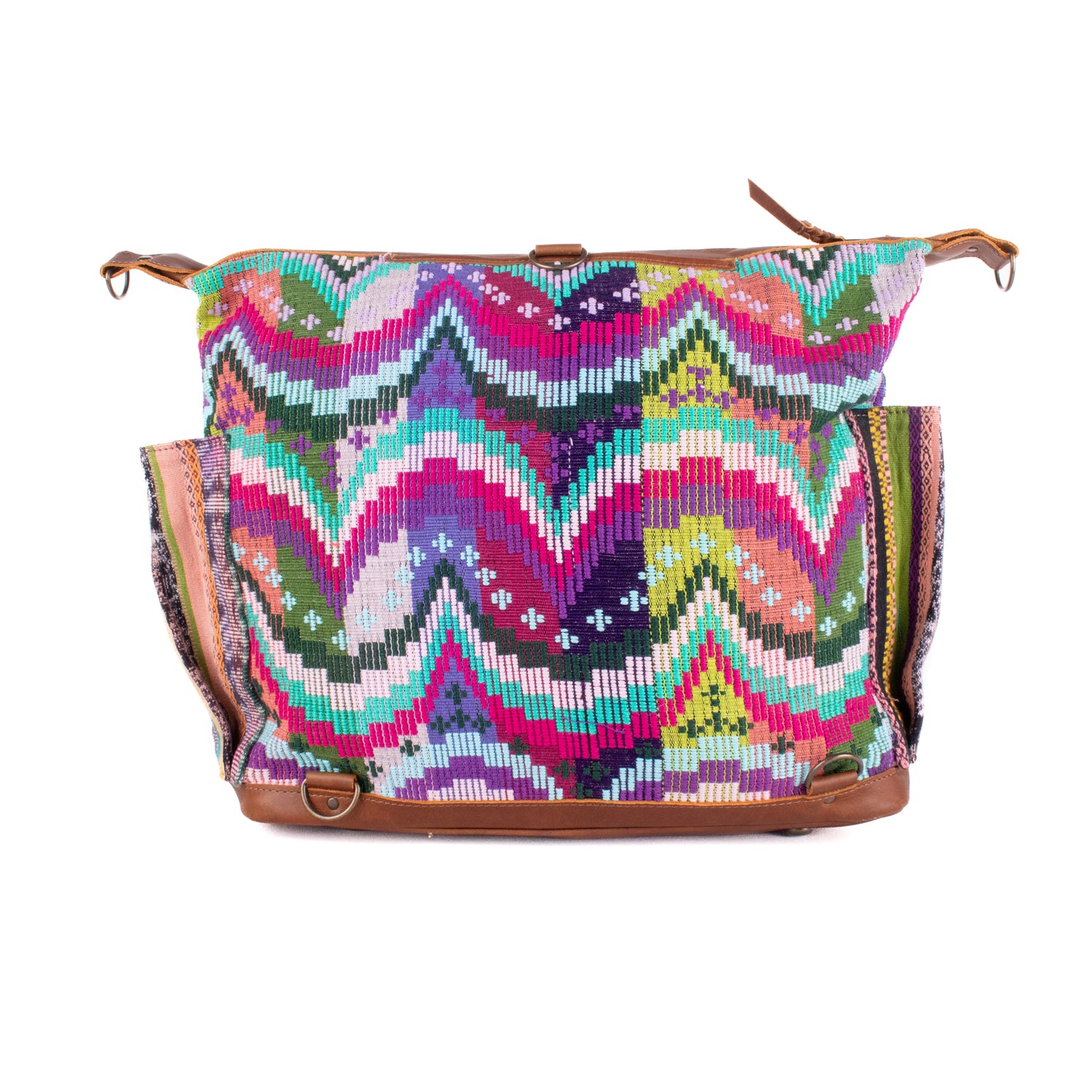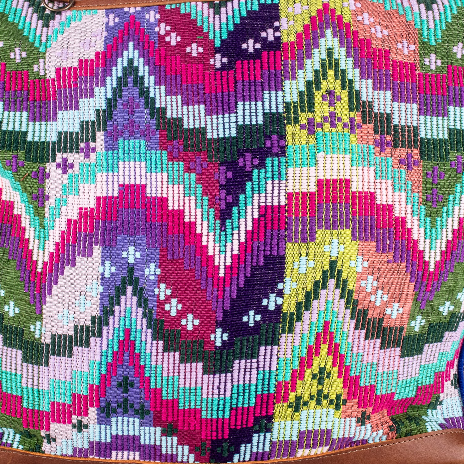 Many unique Maya symbols can be found in our One of a Kind Collection. The fabric we use for this collection is made from upcycled vintage huipiles (traditional attire worn by women in Guatemala) that were handwoven by Artisans up to 10 years ago, and they have lived a full life before being incorporated into your leather bag!