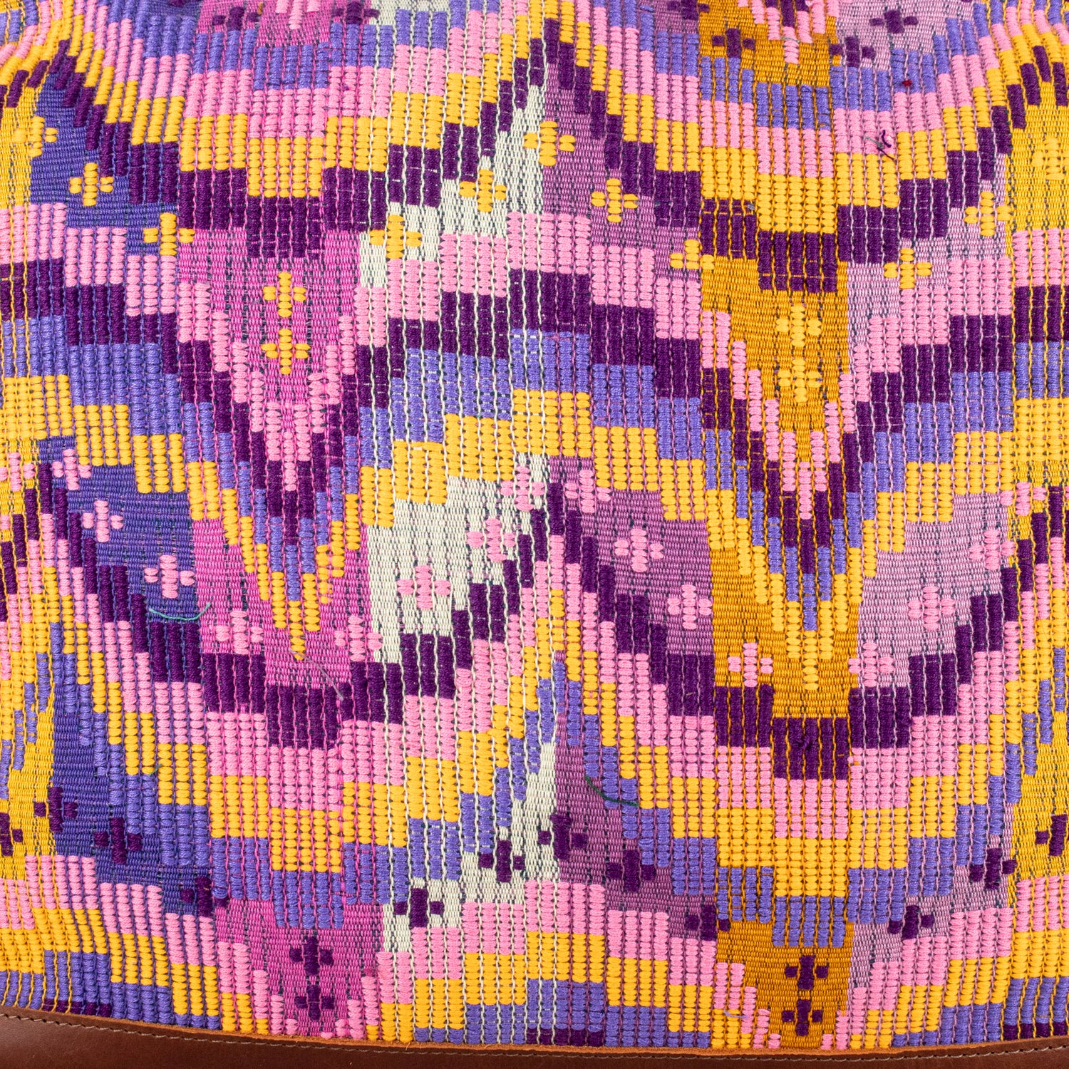 Many unique Maya symbols can be found in our One of a Kind Collection. The fabric we use for this collection is made from upcycled vintage huipiles (traditional attire worn by women in Guatemala) that were handwoven by Artisans up to 10 years ago, and they have lived a full life before being incorporated into your leather bag!