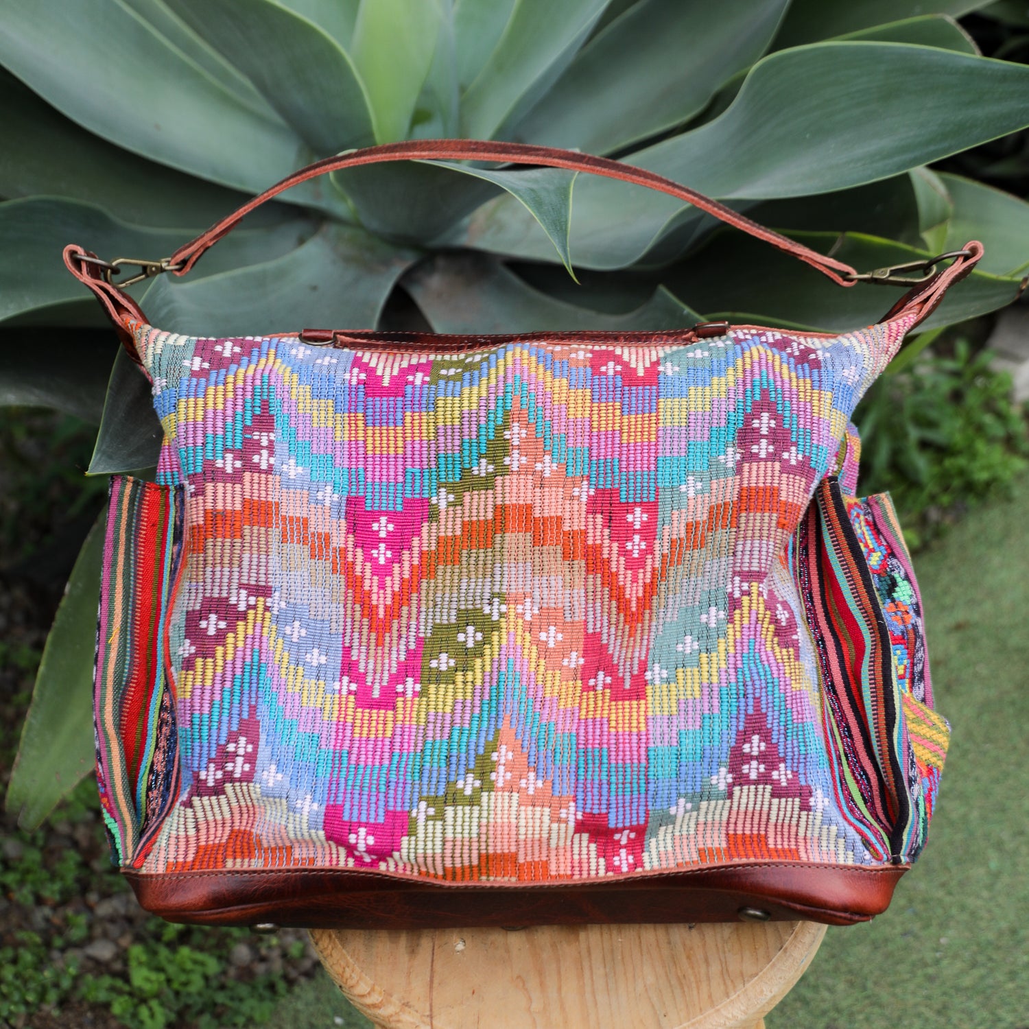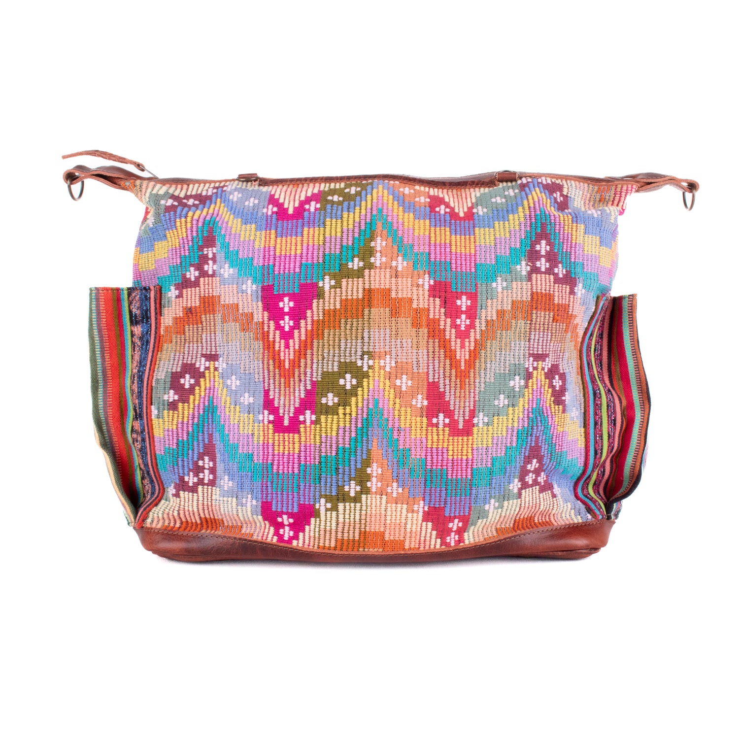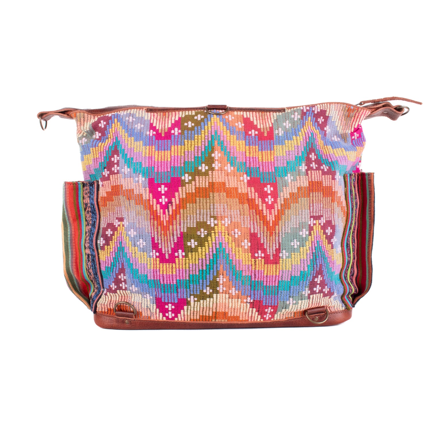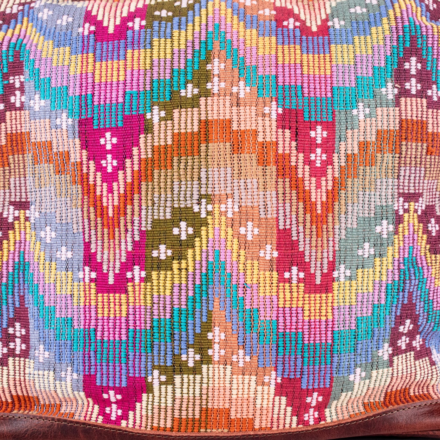 Many unique Maya symbols can be found in our One of a Kind Collection. The fabric we use for this collection is made from upcycled vintage huipiles (traditional attire worn by women in Guatemala) that were handwoven by Artisans up to 10 years ago, and they have lived a full life before being incorporated into your leather bag!