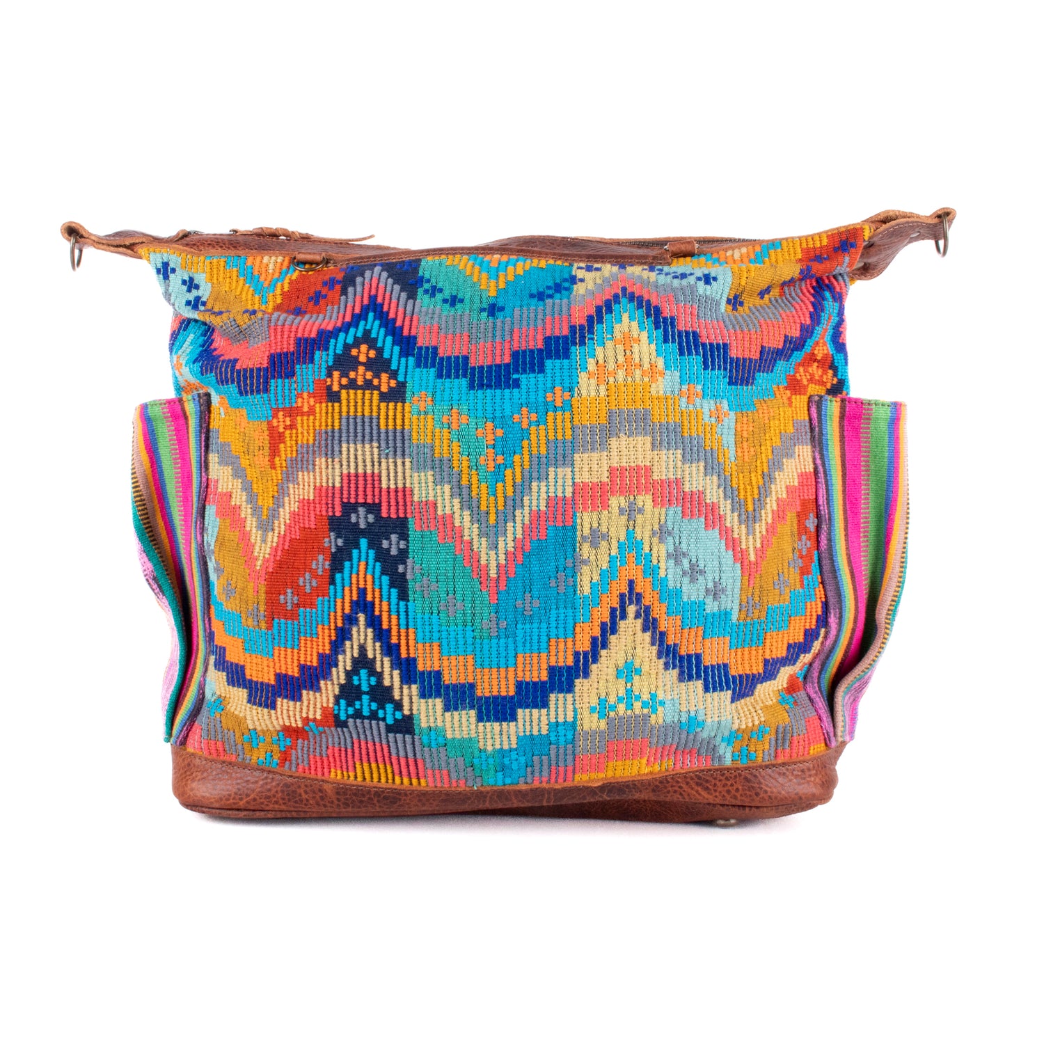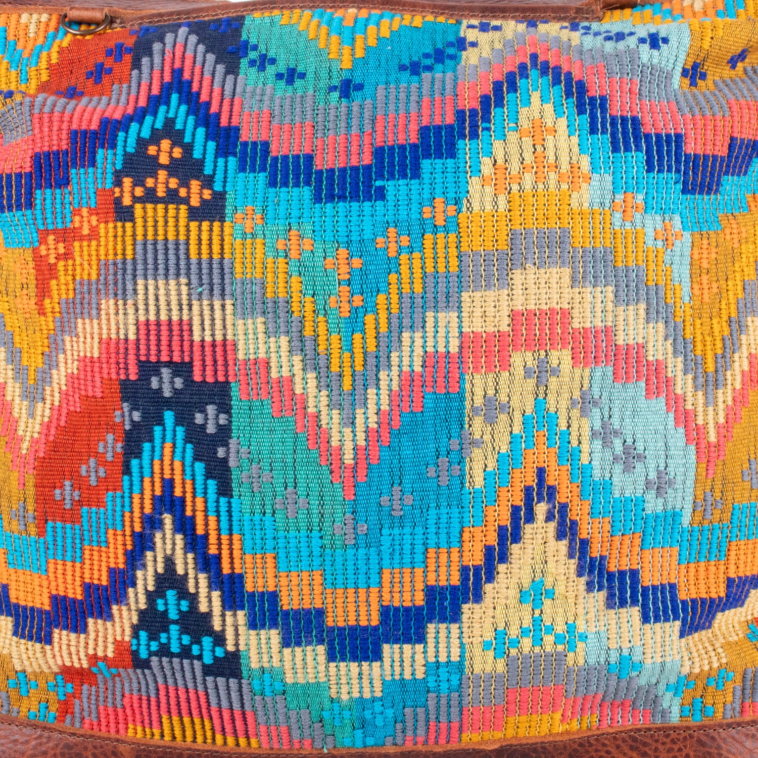 Many unique Maya symbols can be found in our One of a Kind Collection. The fabric we use for this collection is made from upcycled vintage huipiles (traditional attire worn by women in Guatemala) that were handwoven by Artisans up to 10 years ago, and they have lived a full life before being incorporated into your leather bag!