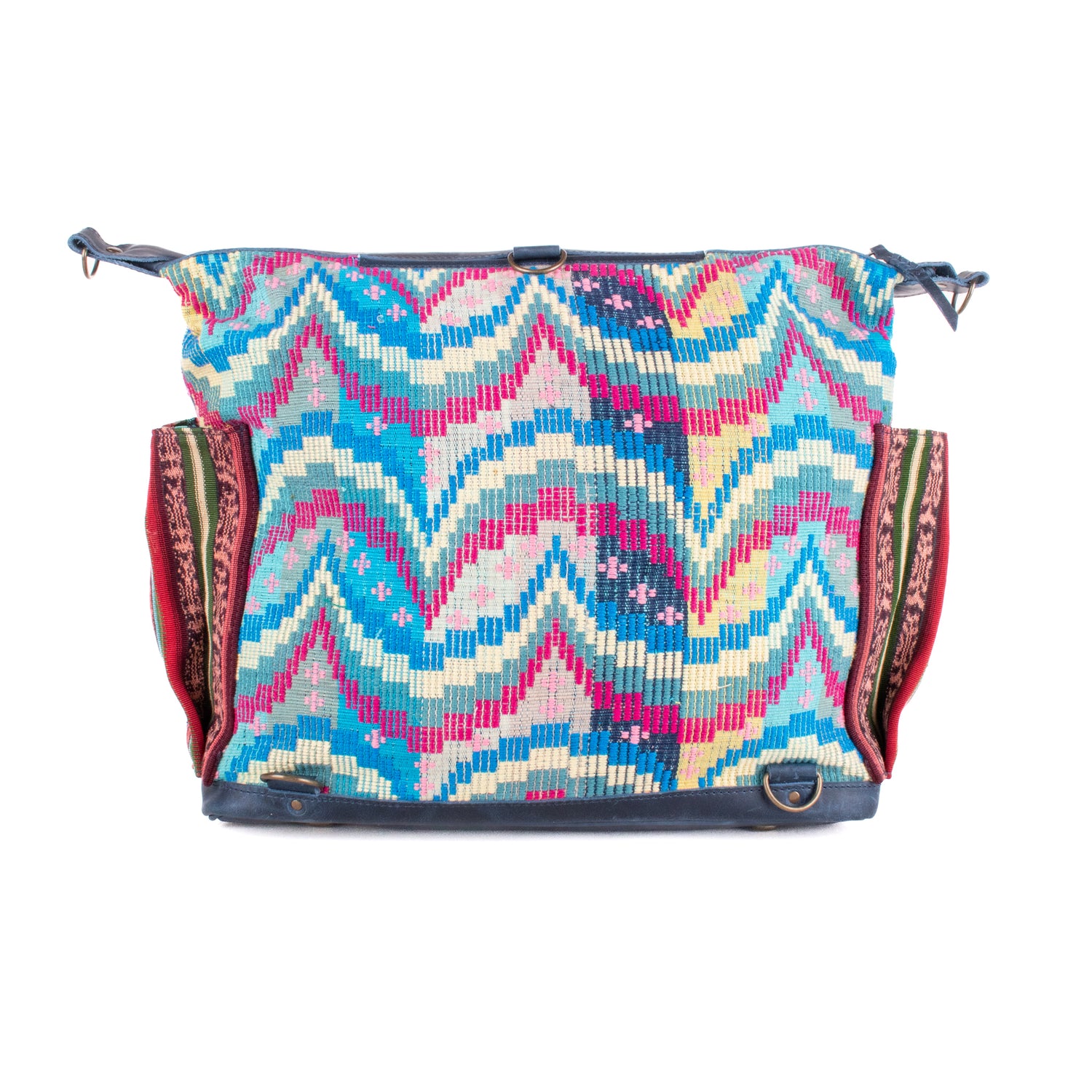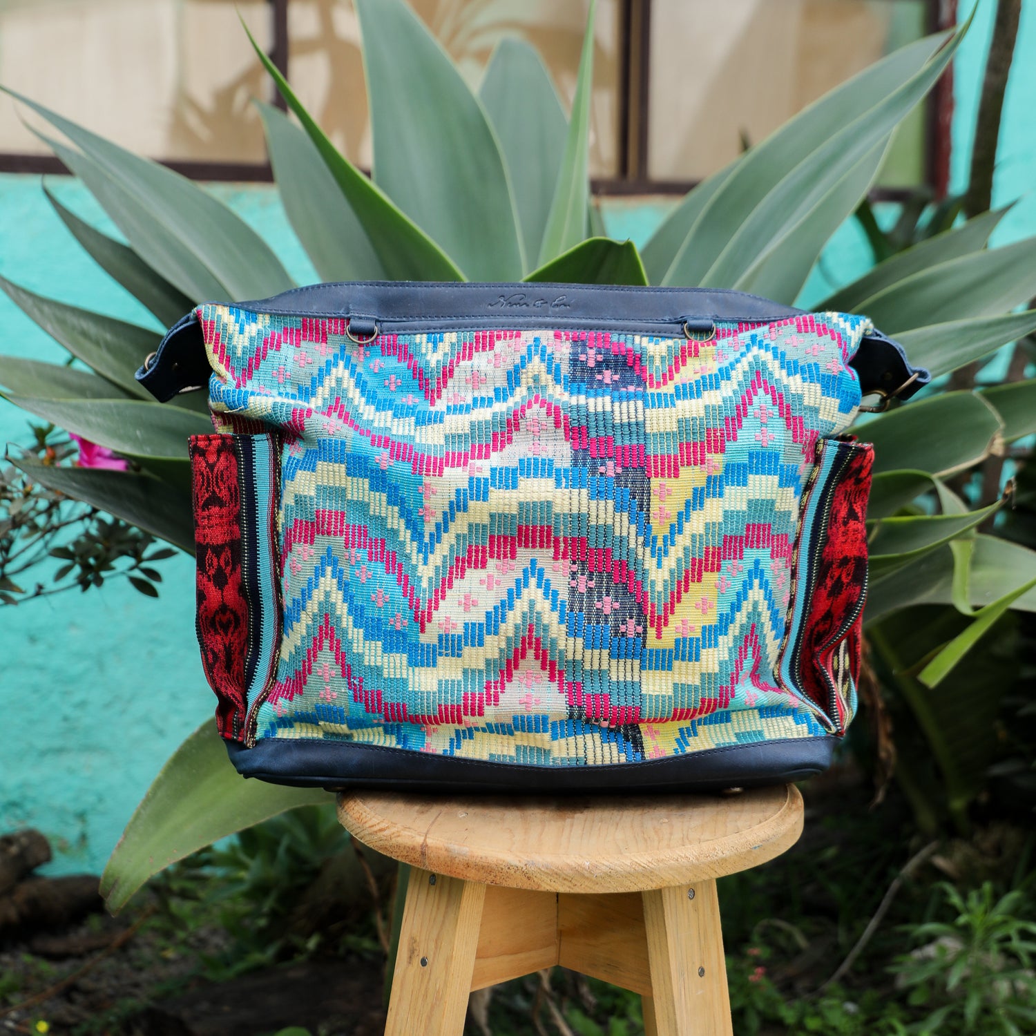 Many unique Maya symbols can be found in our One of a Kind Collection. The fabric we use for this collection is made from upcycled vintage huipiles (traditional attire worn by women in Guatemala) that were handwoven by Artisans up to 10 years ago, and they have lived a full life before being incorporated into your leather bag!