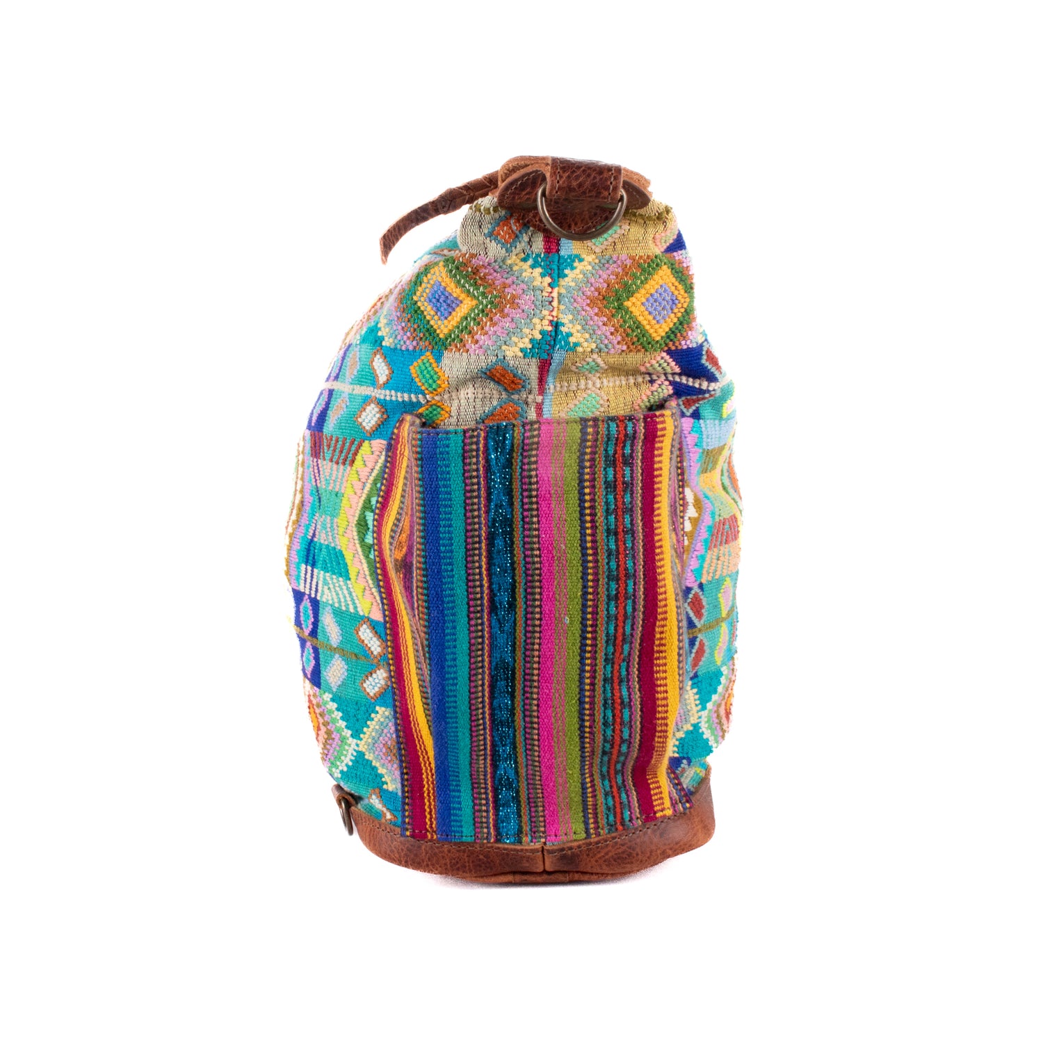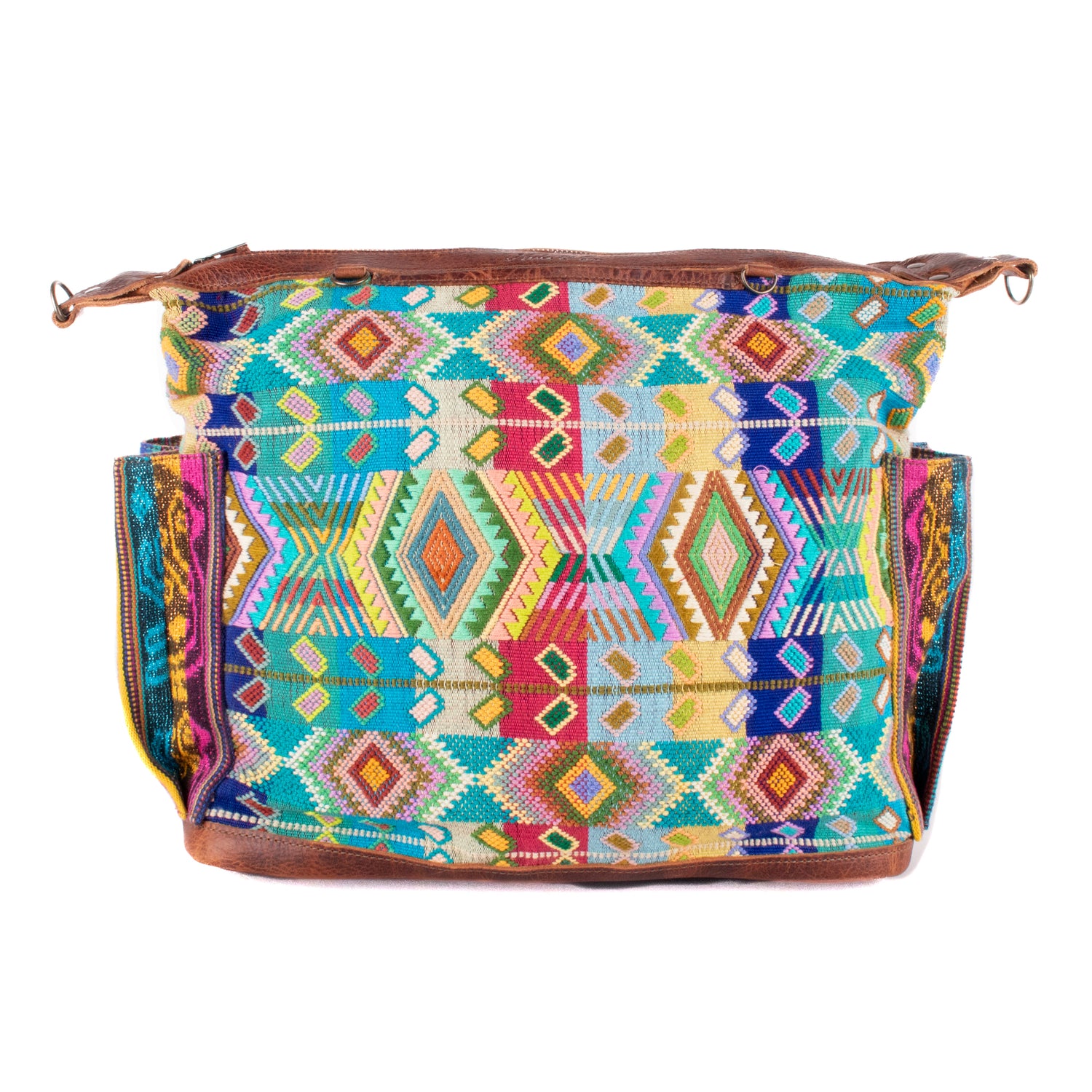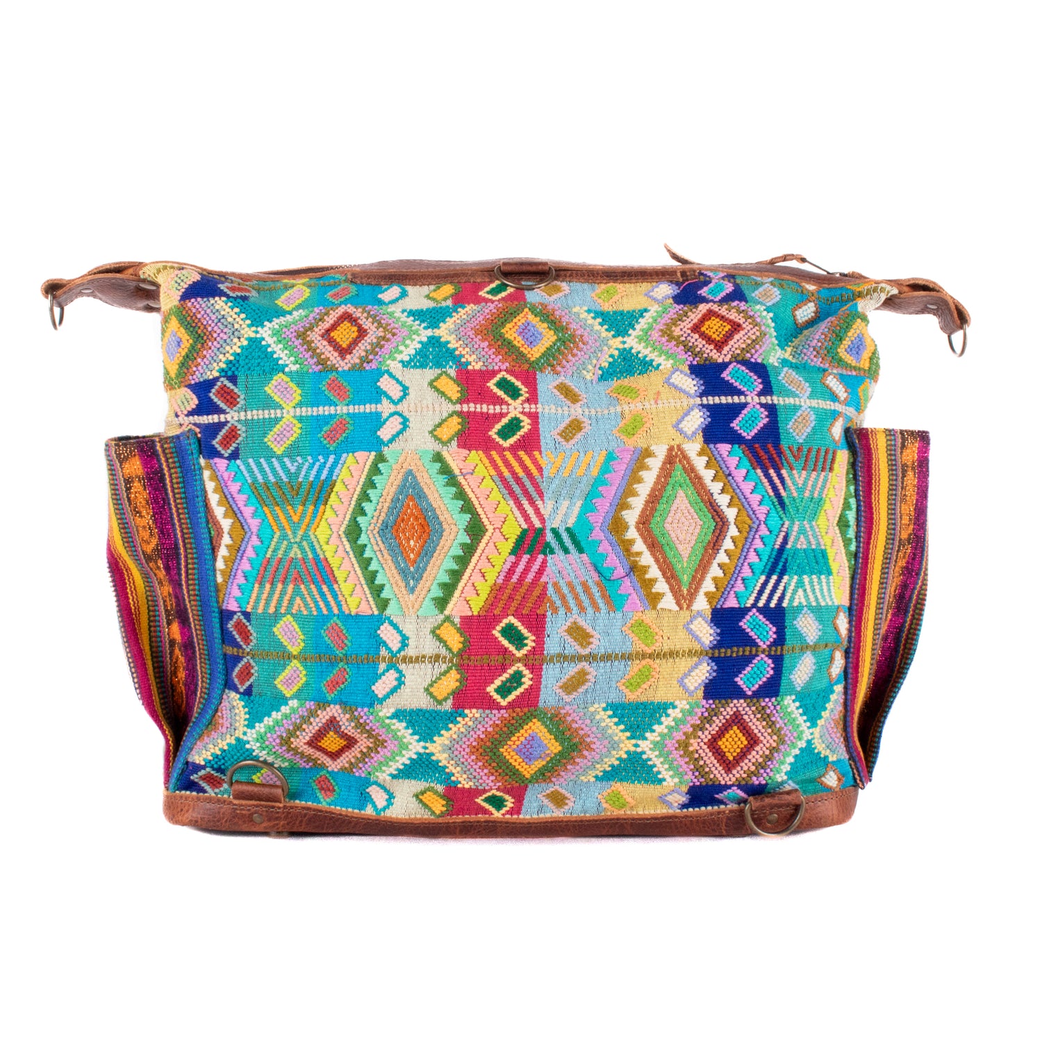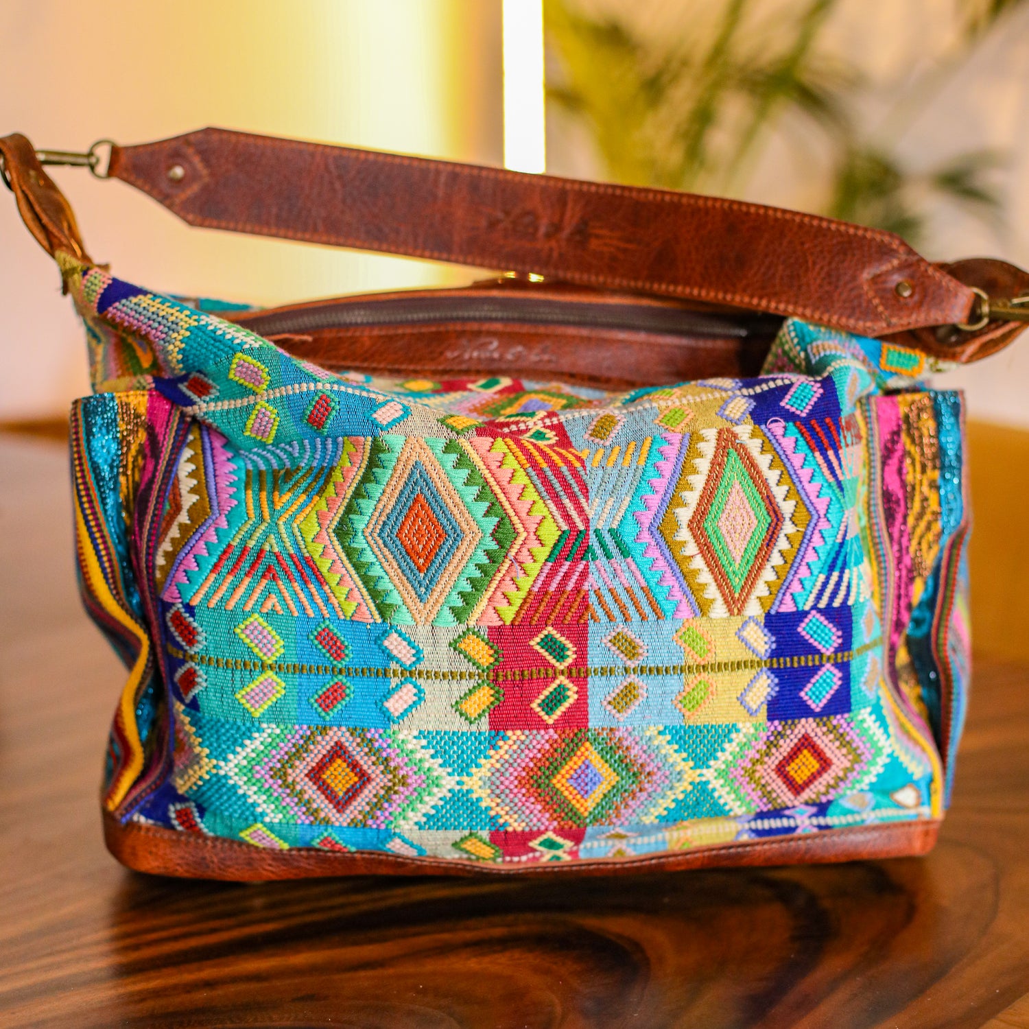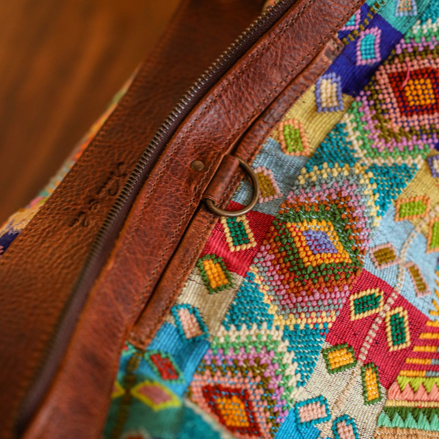 Many unique Maya symbols can be found in our One of a Kind Collection. The fabric we use for this collection is made from upcycled vintage huipiles (traditional attire worn by women in Guatemala) that were handwoven by Artisans up to 10 years ago, and they have lived a full life before being incorporated into your leather bag!