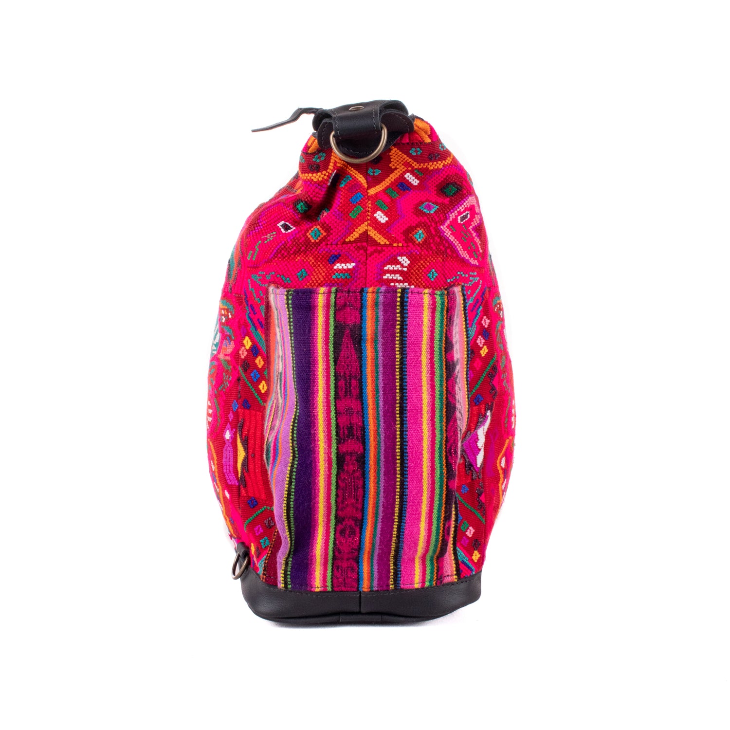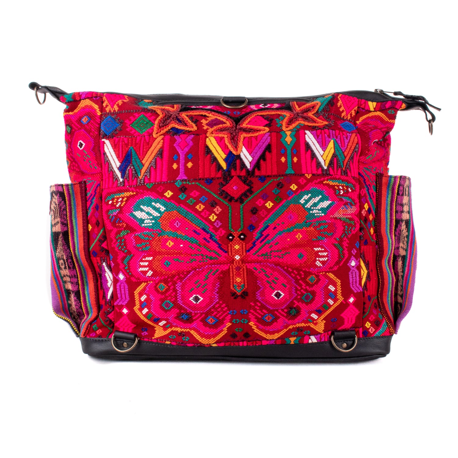 Many unique Maya symbols can be found in our One of a Kind Collection. The fabric we use for this collection is made from upcycled vintage huipiles (traditional attire worn by women in Guatemala) that were handwoven by Artisans up to 10 years ago, and they have lived a full life before being incorporated into your leather bag!