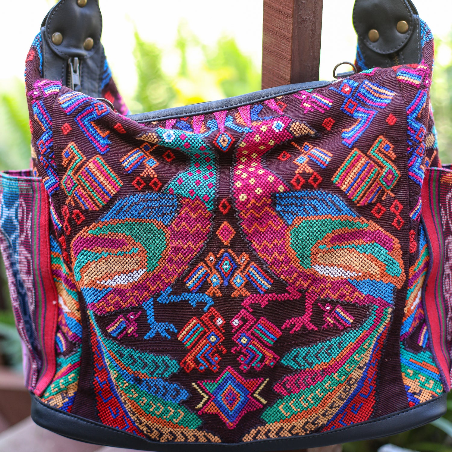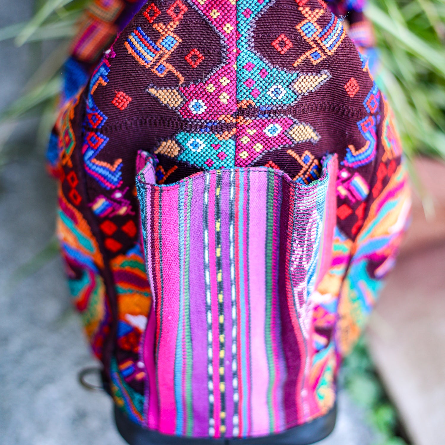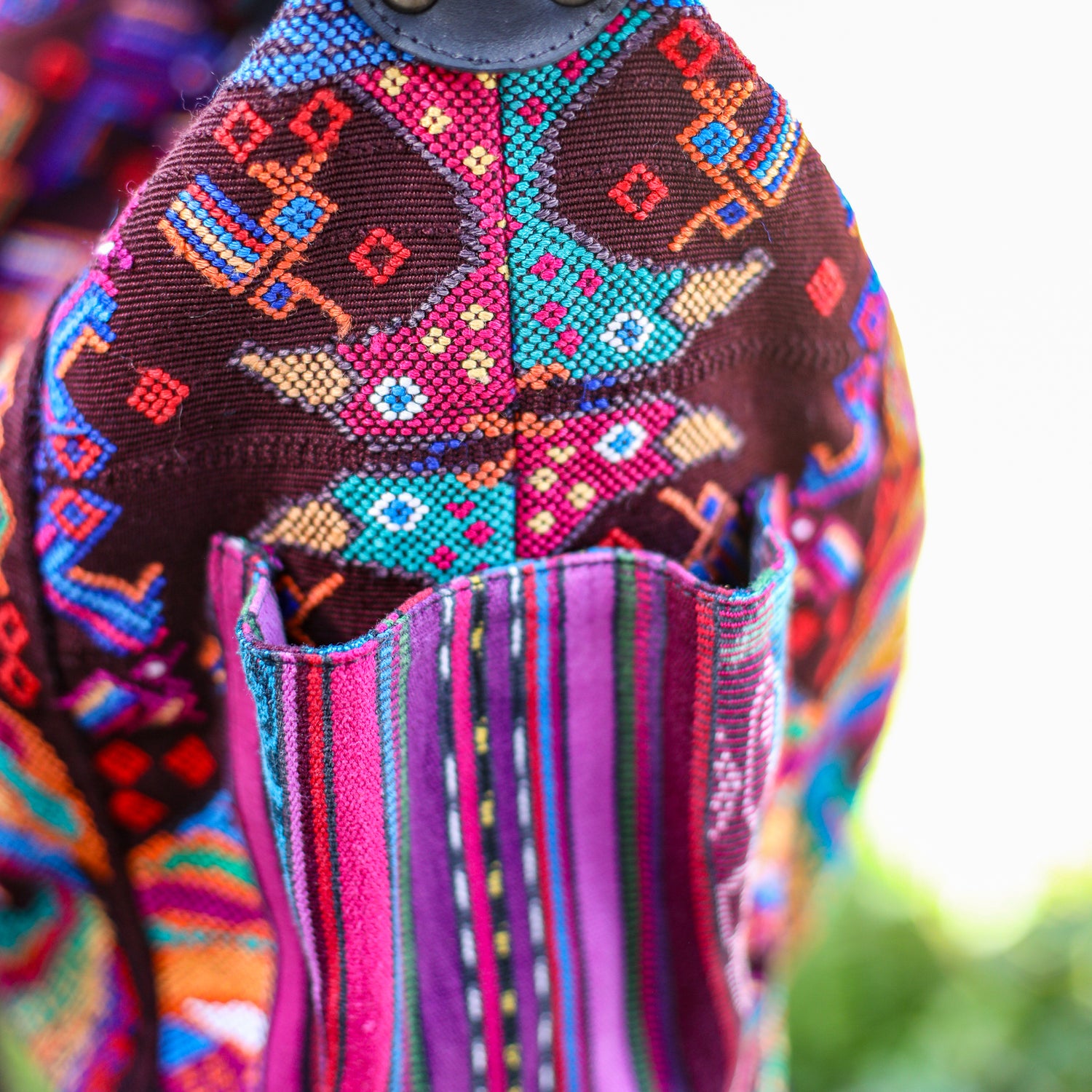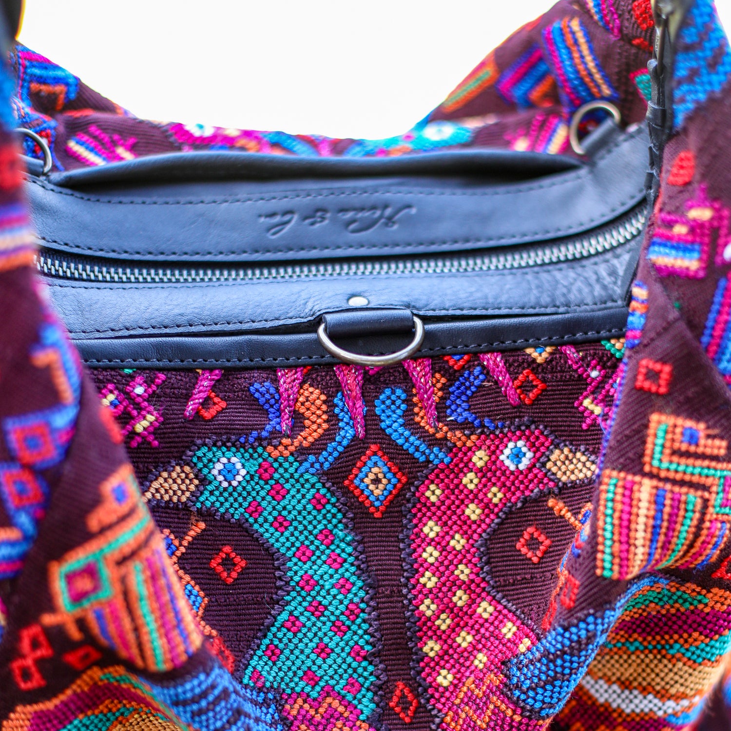 Many unique Maya symbols can be found in our One of a Kind Collection. The fabric we use for this collection is made from upcycled vintage huipiles (traditional attire worn by women in Guatemala) that were handwoven by Artisans up to 10 years ago, and they have lived a full life before being incorporated into your leather bag!