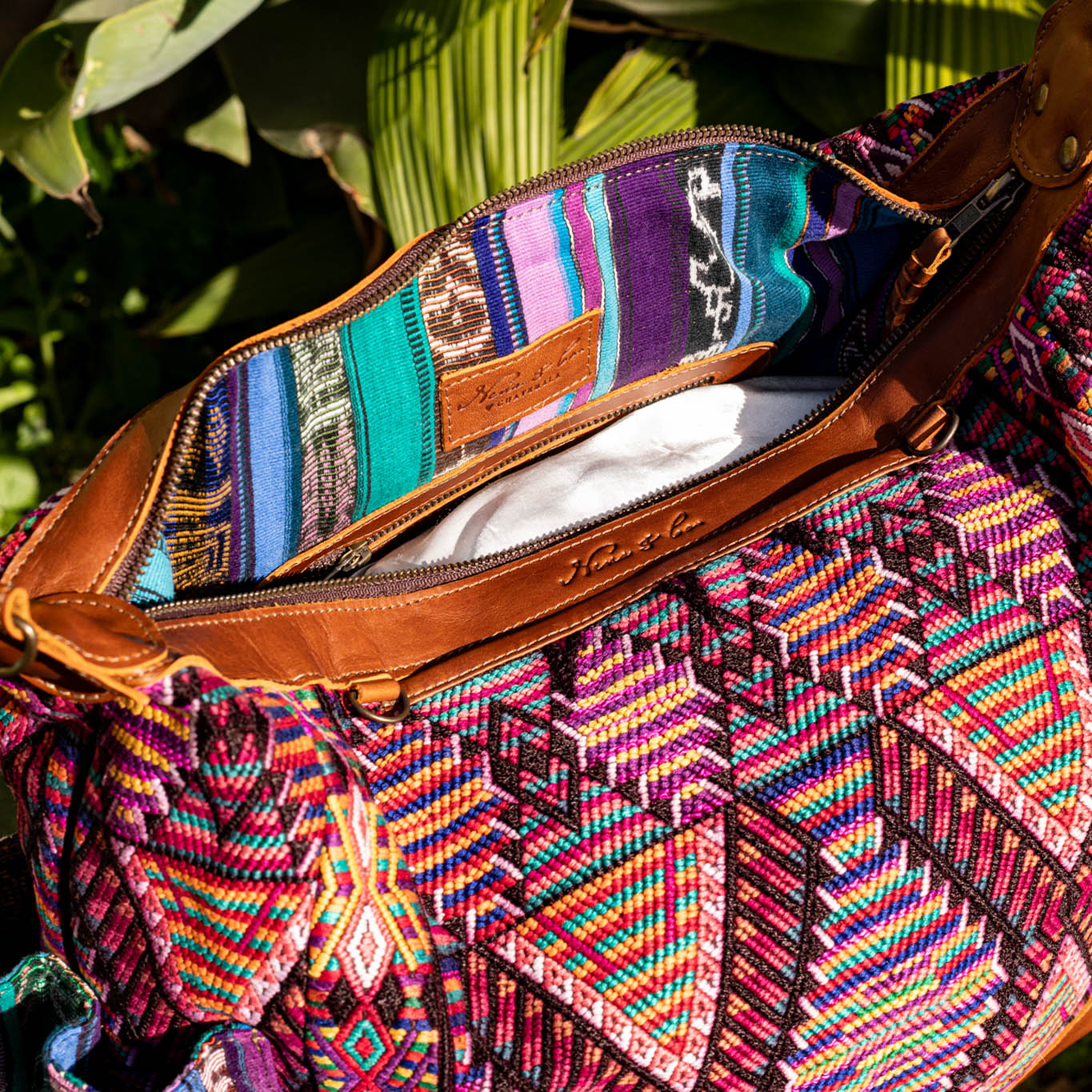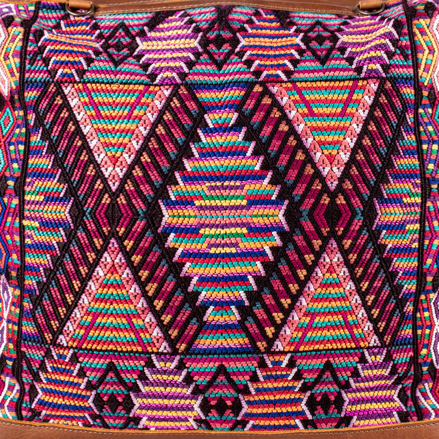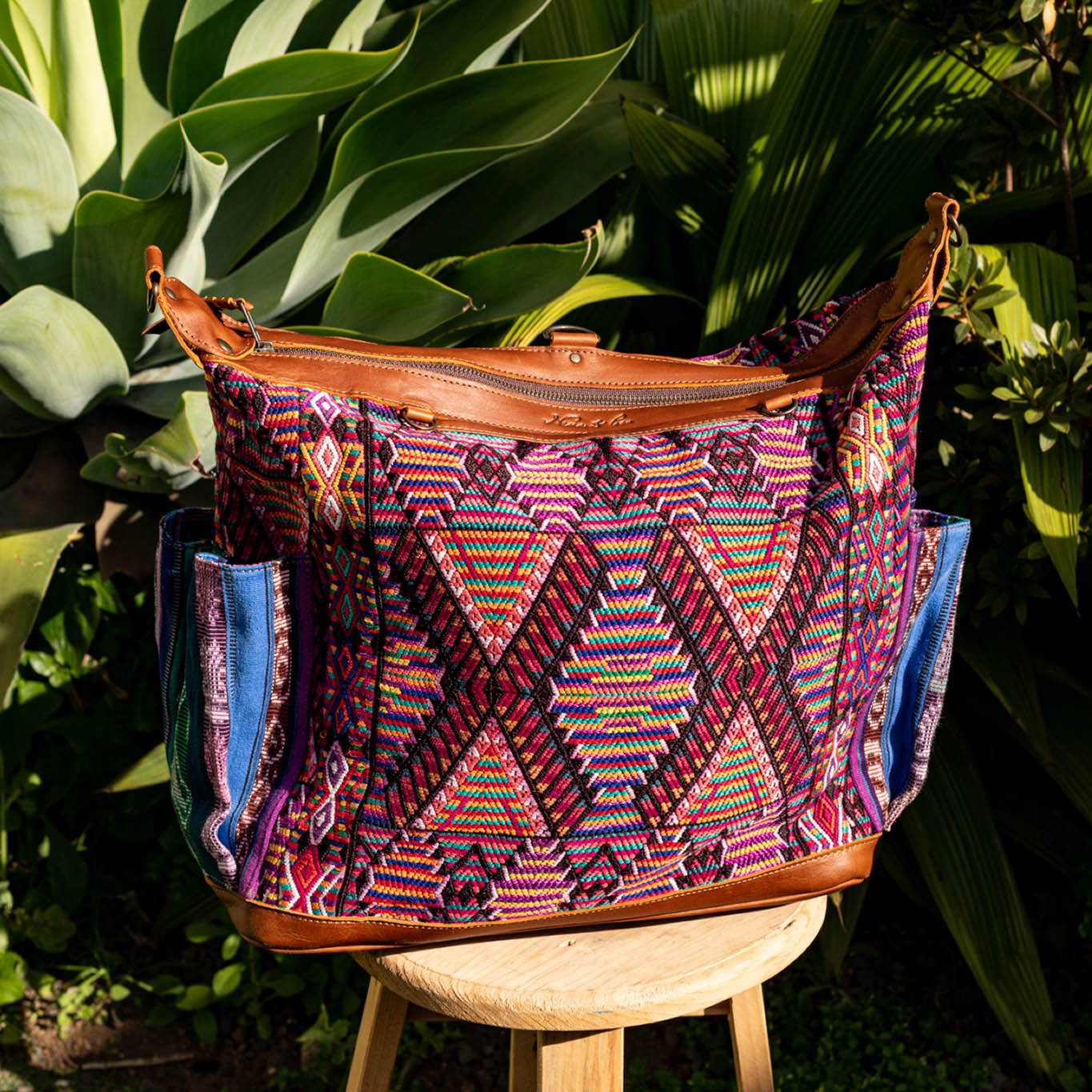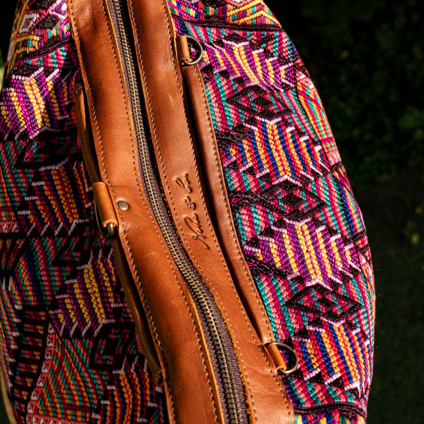 Many unique Maya symbols can be found in our One of a Kind Collection. The fabric we use for this collection is made from upcycled vintage huipiles (traditional attire worn by women in Guatemala) that were handwoven by Artisans up to 10 years ago, and they have lived a full life before being incorporated into your leather bag!