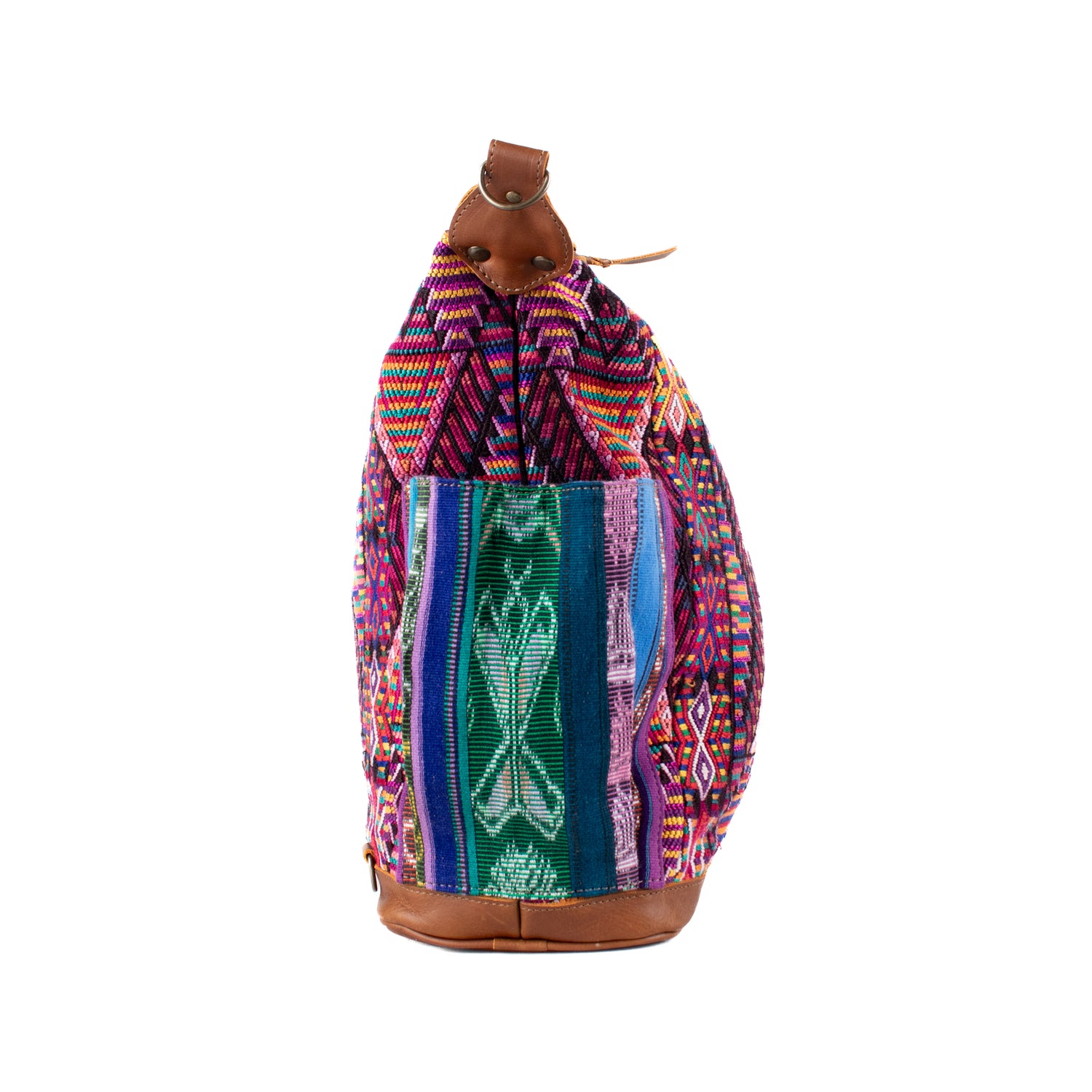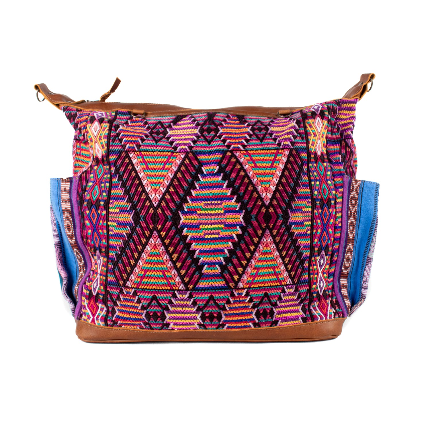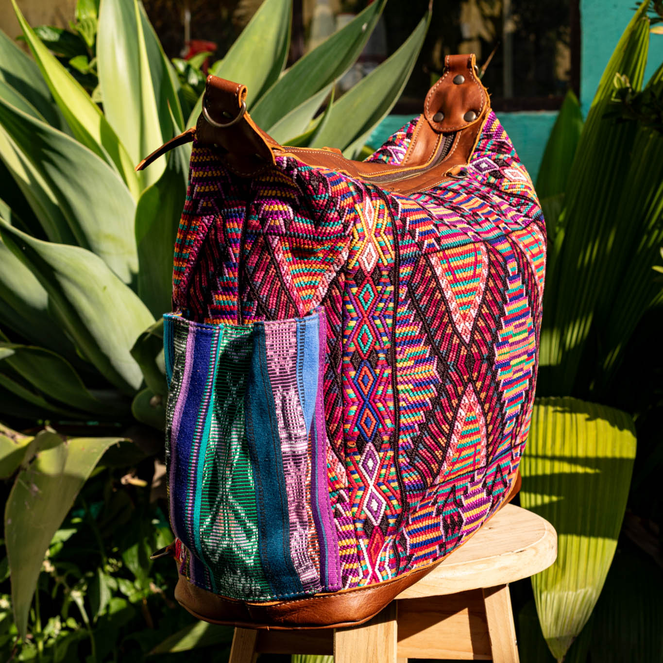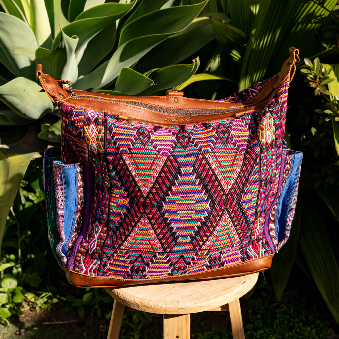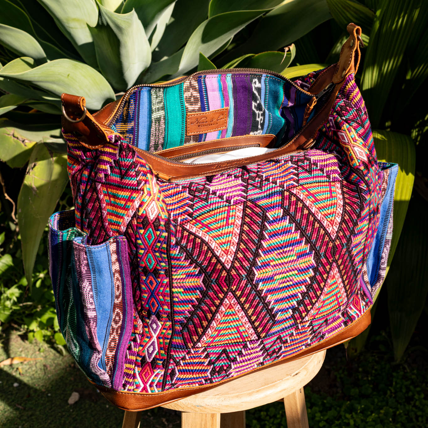 Many unique Maya symbols can be found in our One of a Kind Collection. The fabric we use for this collection is made from upcycled vintage huipiles (traditional attire worn by women in Guatemala) that were handwoven by Artisans up to 10 years ago, and they have lived a full life before being incorporated into your leather bag!