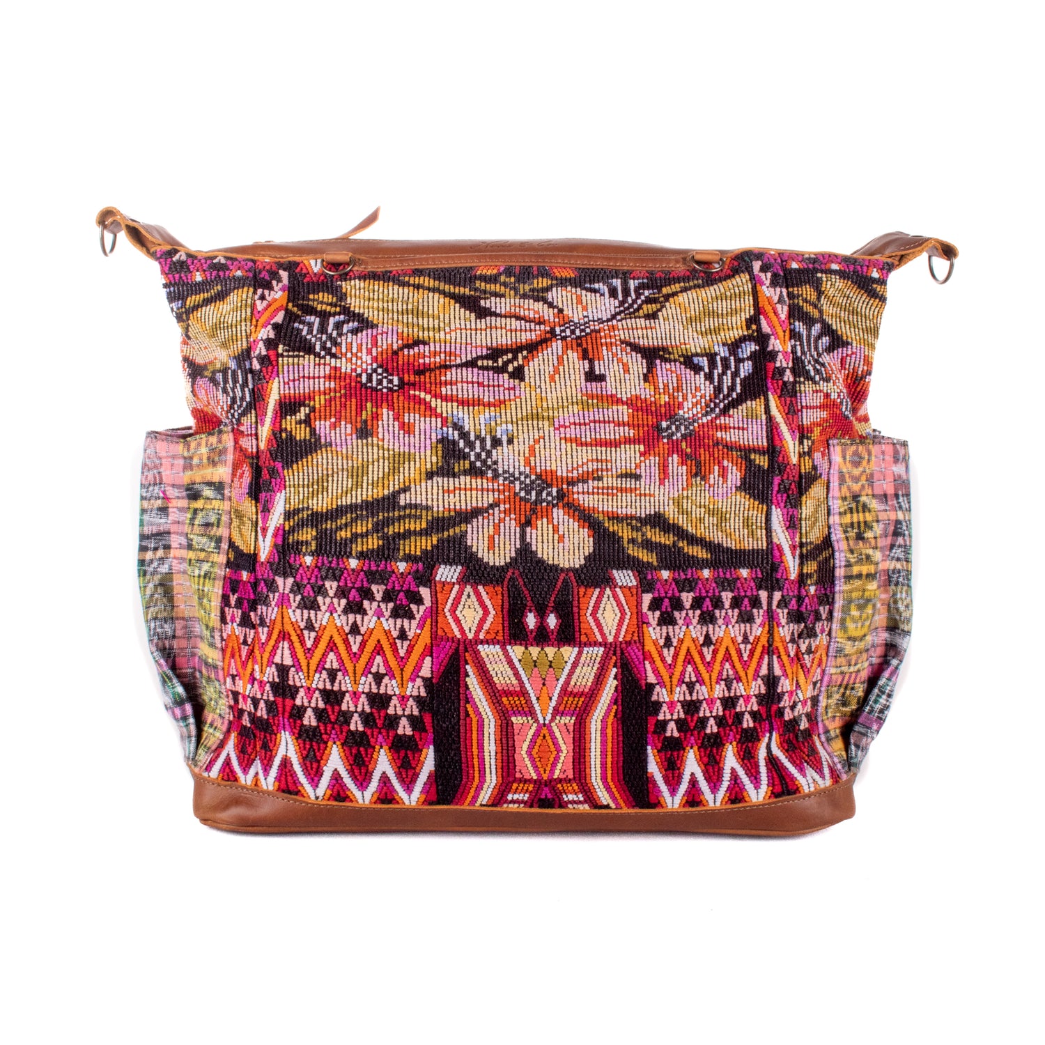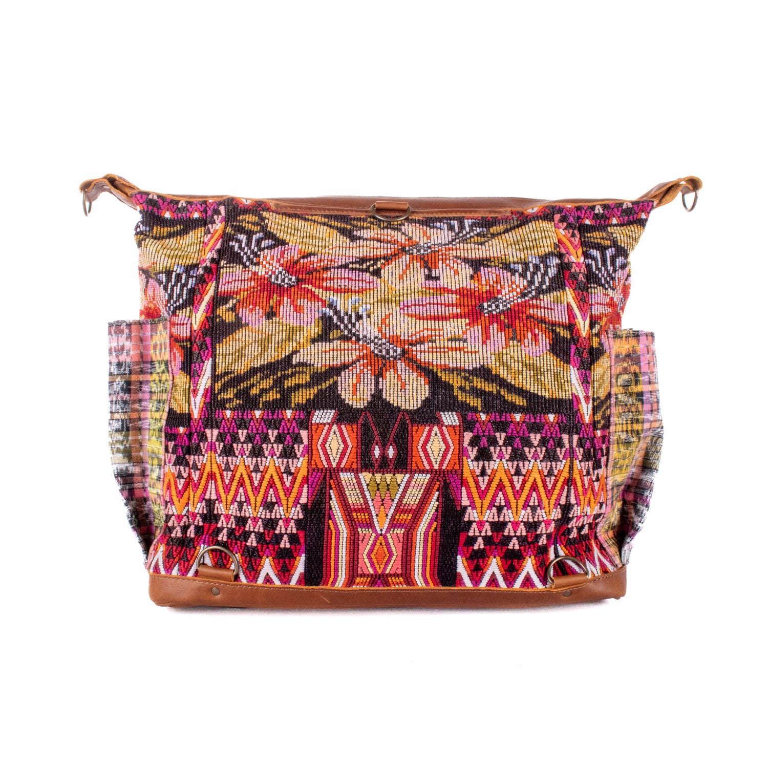 Many unique Maya symbols can be found in our One of a Kind Collection. The fabric we use for this collection is made from upcycled vintage huipiles (traditional attire worn by women in Guatemala) that were handwoven by Artisans up to 10 years ago, and they have lived a full life before being incorporated into your leather bag!