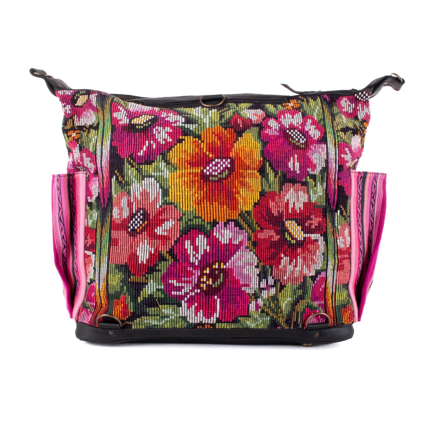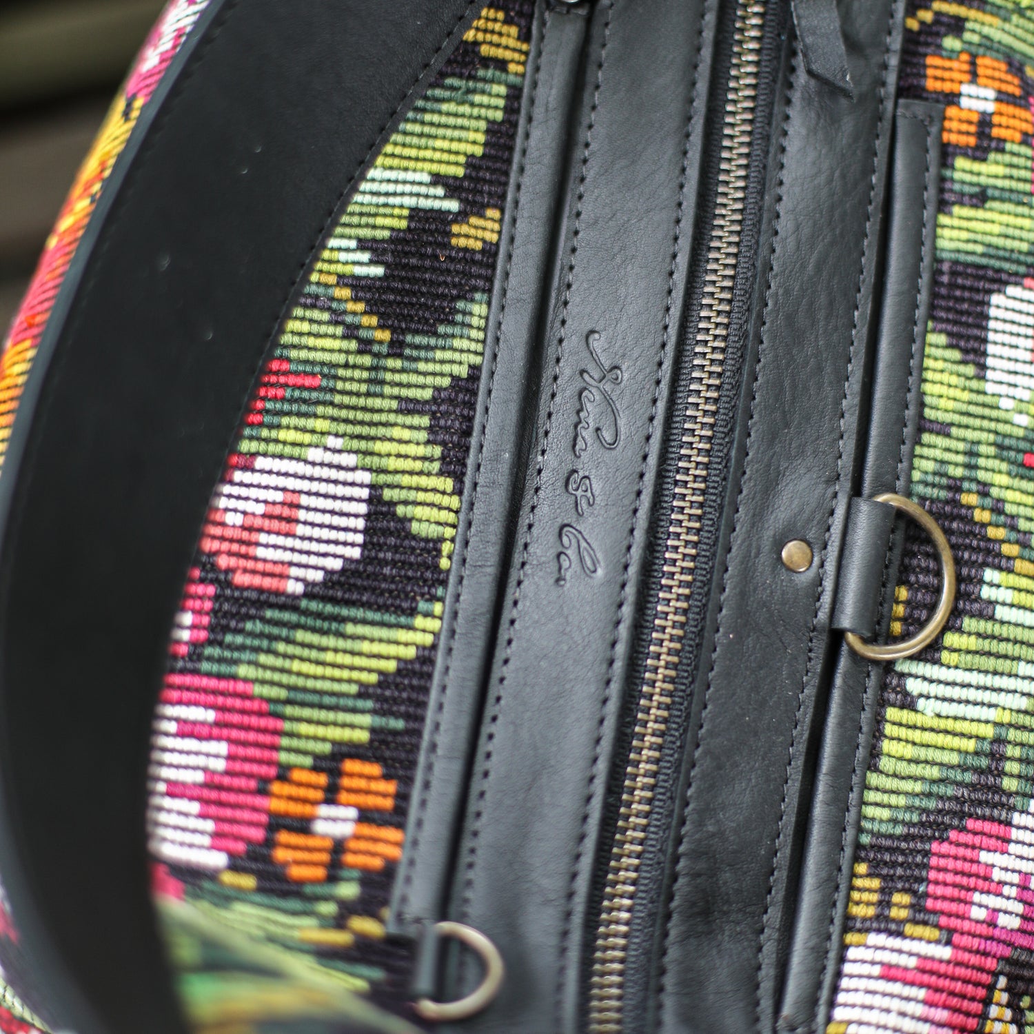 Many unique Maya symbols can be found in our One of a Kind Collection. The fabric we use for this collection is made from upcycled vintage huipiles (traditional attire worn by women in Guatemala) that were handwoven by Artisans up to 10 years ago, and they have lived a full life before being incorporated into your leather bag!