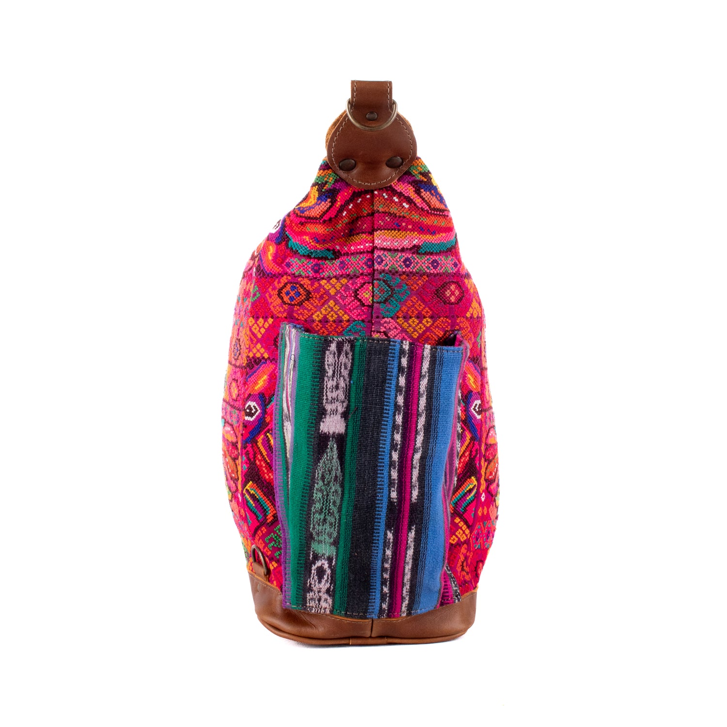 Many unique Maya symbols can be found in our One of a Kind Collection. The fabric we use for this collection is made from upcycled vintage huipiles (traditional attire worn by women in Guatemala) that were handwoven by Artisans up to 10 years ago, and they have lived a full life before being incorporated into your leather bag!