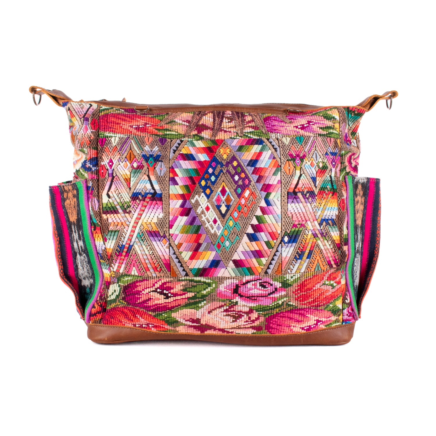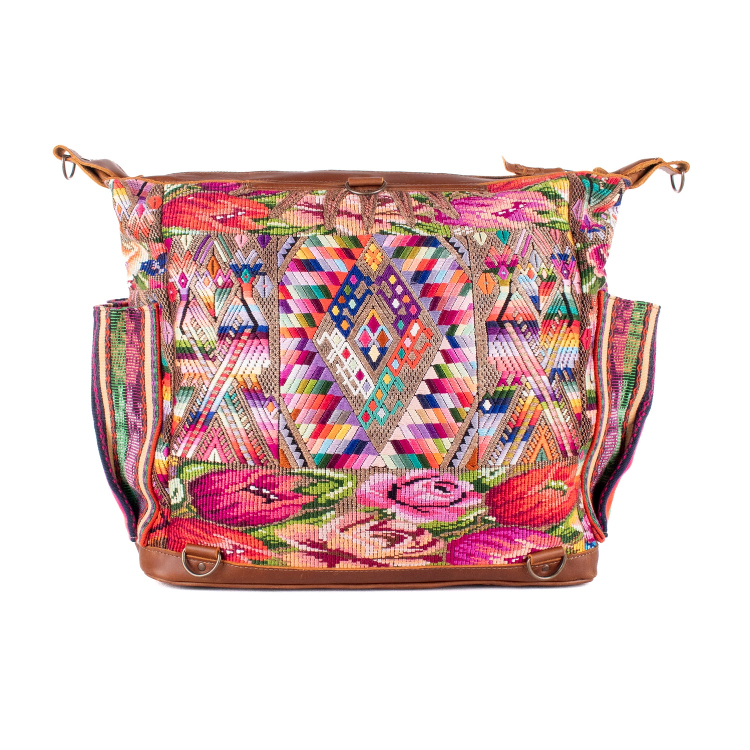 Many unique Maya symbols can be found in our One of a Kind Collection. The fabric we use for this collection is made from upcycled vintage huipiles (traditional attire worn by women in Guatemala) that were handwoven by Artisans up to 10 years ago, and they have lived a full life before being incorporated into your leather bag!