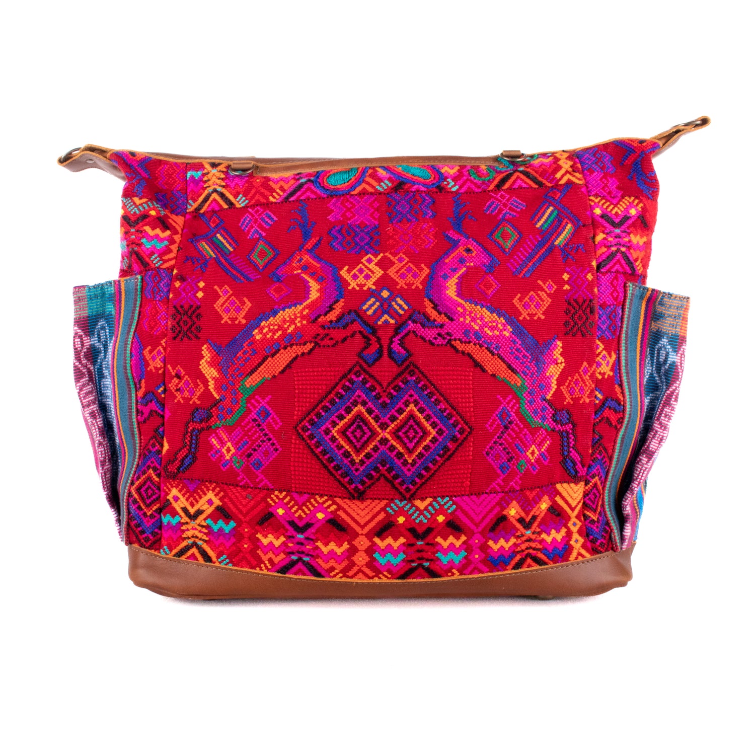 Many unique Maya symbols can be found in our One of a Kind Collection. The fabric we use for this collection is made from upcycled vintage huipiles (traditional attire worn by women in Guatemala) that were handwoven by Artisans up to 10 years ago, and they have lived a full life before being incorporated into your leather bag!