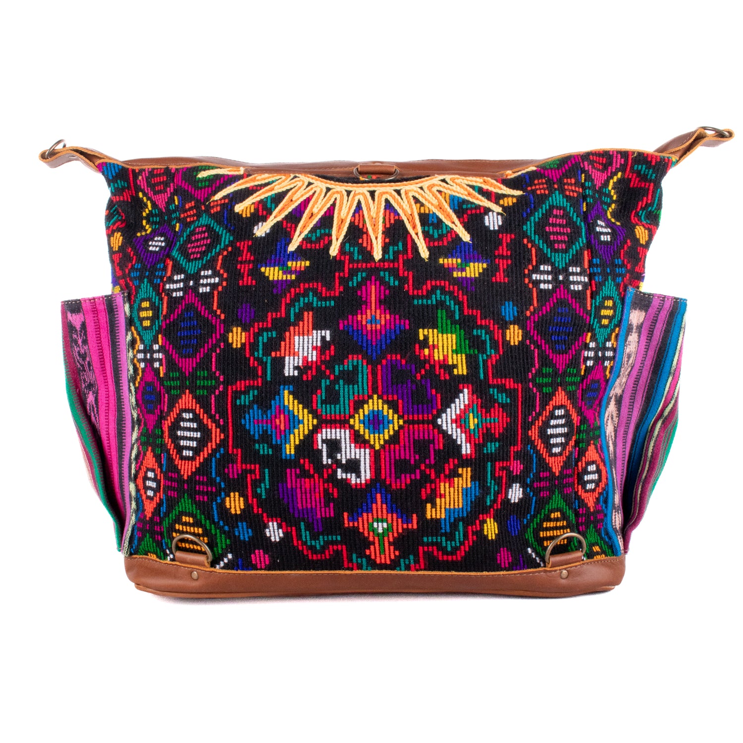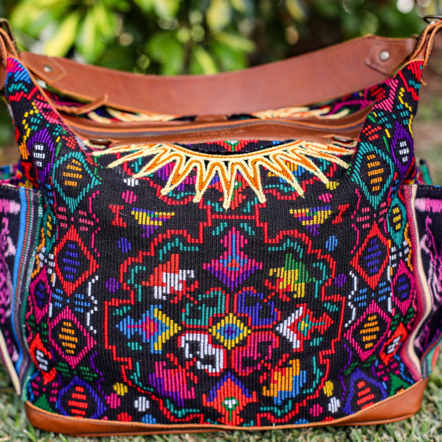 Many unique Maya symbols can be found in our One of a Kind Collection. The fabric we use for this collection is made from upcycled vintage huipiles (traditional attire worn by women in Guatemala) that were handwoven by Artisans up to 10 years ago, and they have lived a full life before being incorporated into your leather bag!