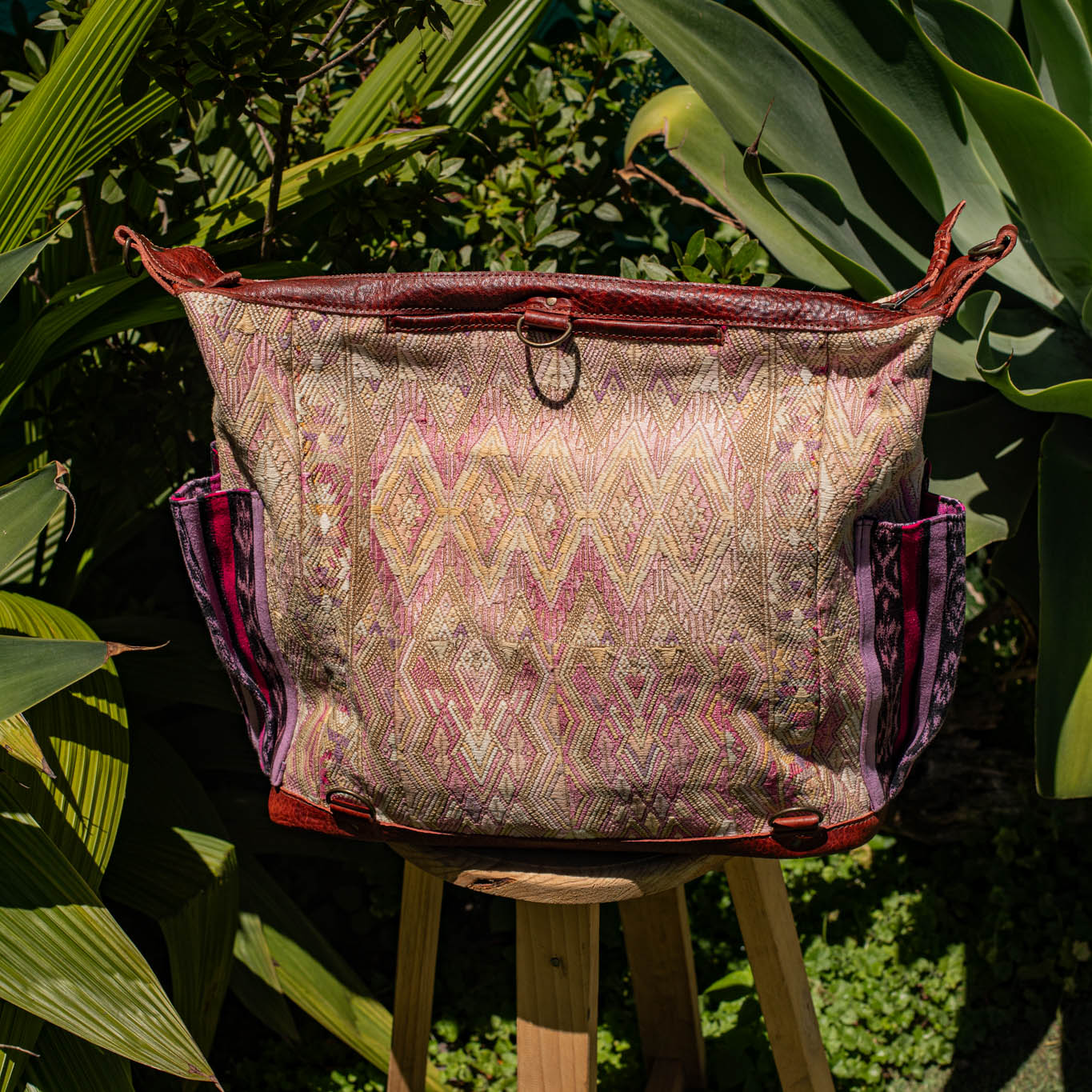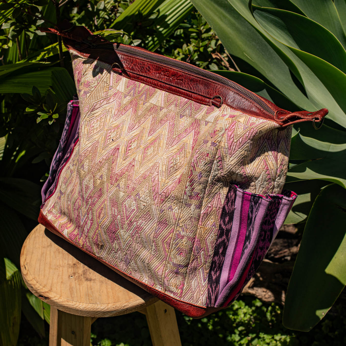 Many unique Maya symbols can be found in our One of a Kind Collection. The fabric we use for this collection is made from upcycled vintage huipiles (traditional attire worn by women in Guatemala) that were handwoven by Artisans up to 10 years ago, and they have lived a full life before being incorporated into your leather bag!