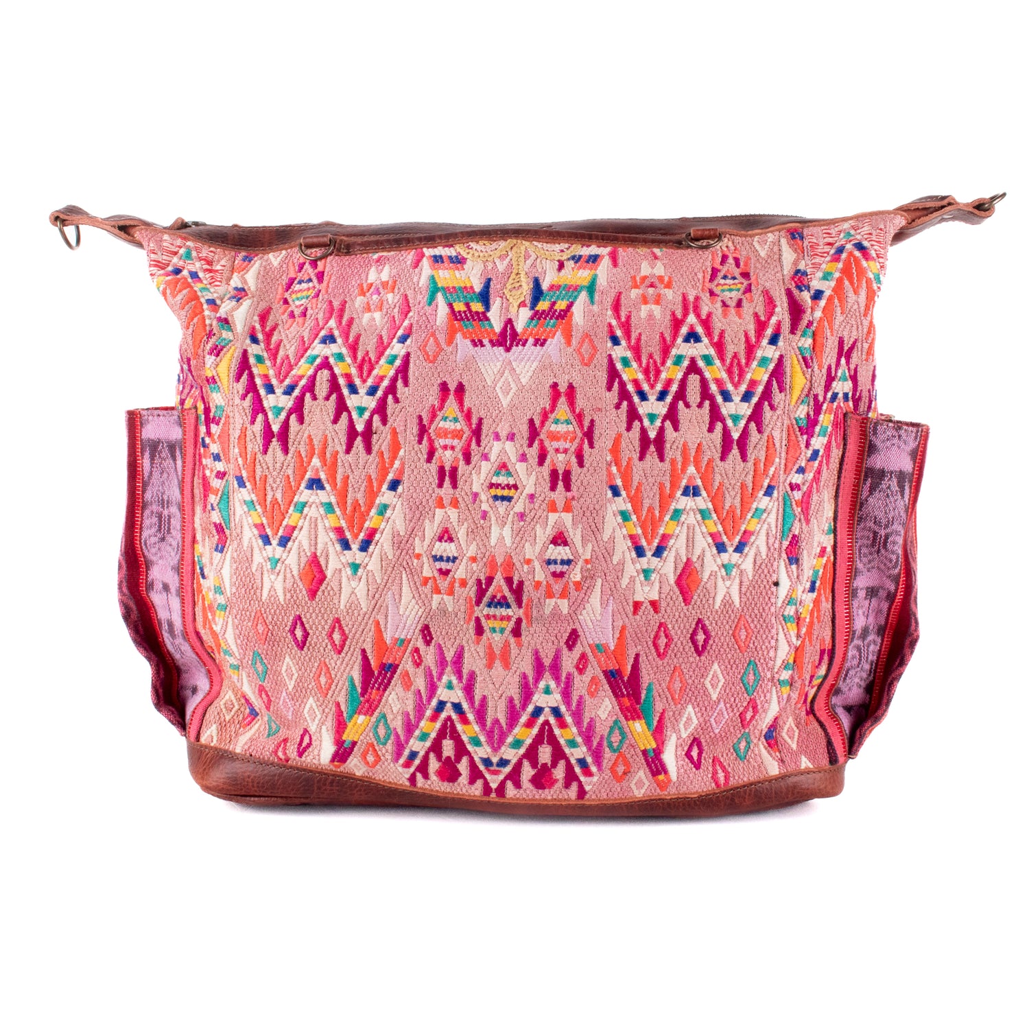 Many unique Maya symbols can be found in our One of a Kind Collection. The fabric we use for this collection is made from upcycled vintage huipiles (traditional attire worn by women in Guatemala) that were handwoven by Artisans up to 10 years ago, and they have lived a full life before being incorporated into your leather bag!