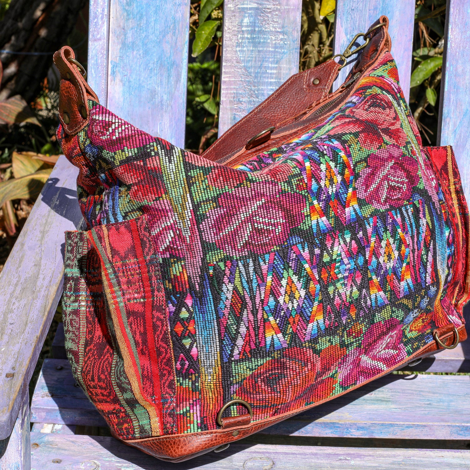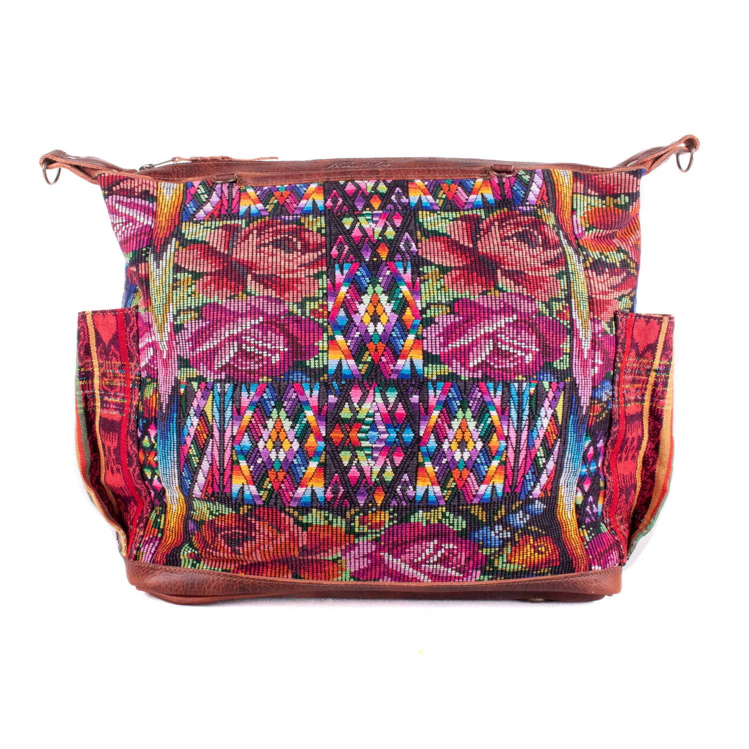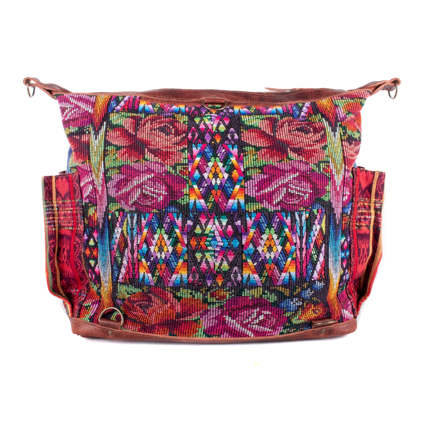 Many unique Maya symbols can be found in our One of a Kind Collection. The fabric we use for this collection is made from upcycled vintage huipiles (traditional attire worn by women in Guatemala) that were handwoven by Artisans up to 10 years ago, and they have lived a full life before being incorporated into your leather bag!