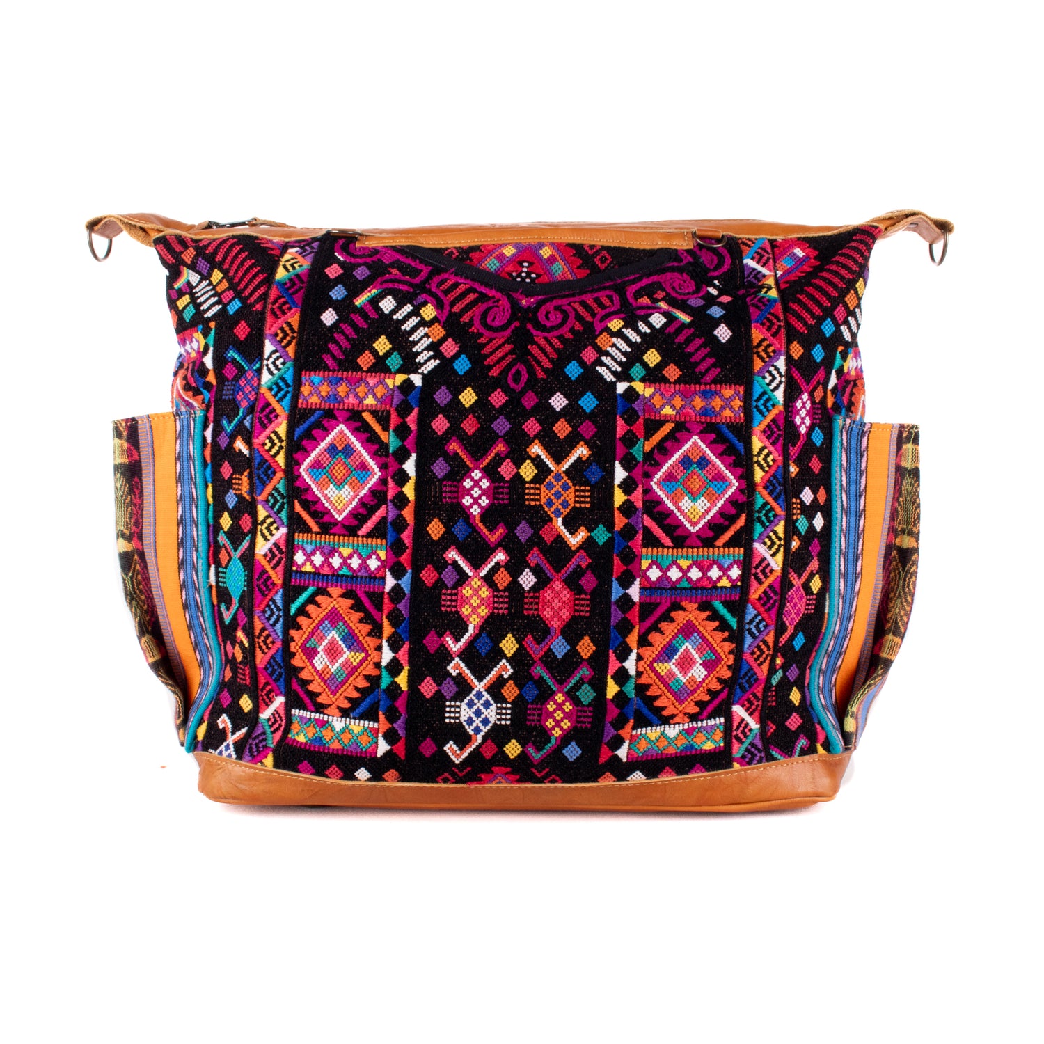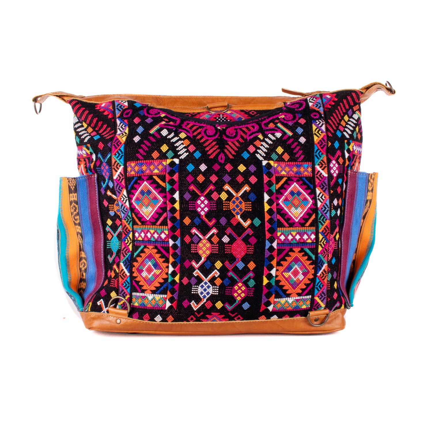 Many unique Maya symbols can be found in our One of a Kind Collection. The fabric we use for this collection is made from upcycled vintage huipiles (traditional attire worn by women in Guatemala) that were handwoven by Artisans up to 10 years ago, and they have lived a full life before being incorporated into your leather bag!