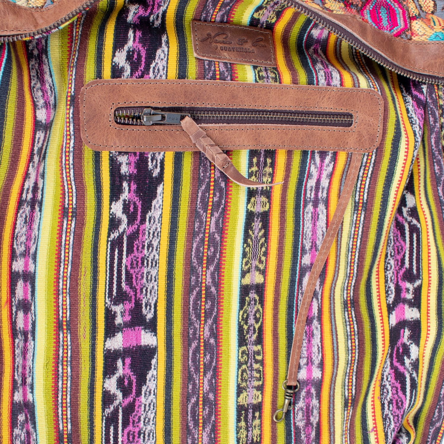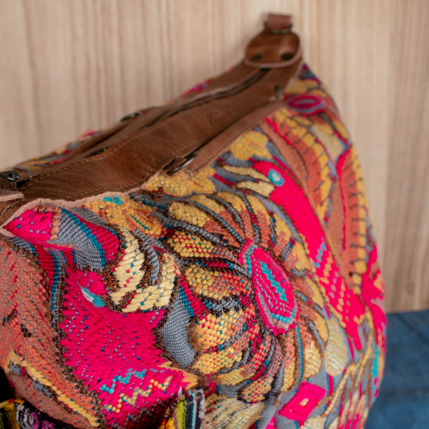 Many unique Maya symbols can be found in our One of a Kind Collection. The fabric we use for this collection is made from upcycled vintage huipiles (traditional attire worn by women in Guatemala) that were handwoven by Artisans up to 10 years ago, and they have lived a full life before being incorporated into your leather bag!