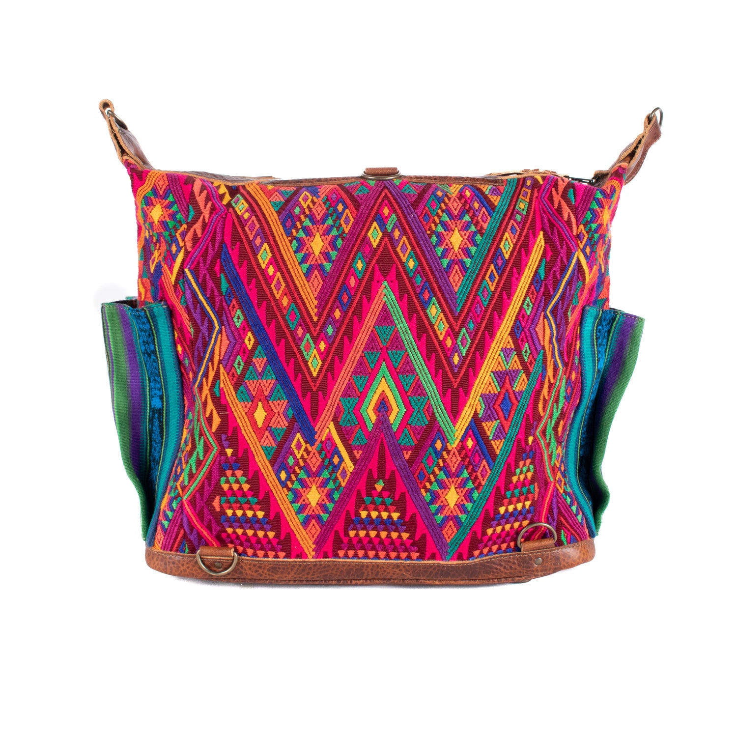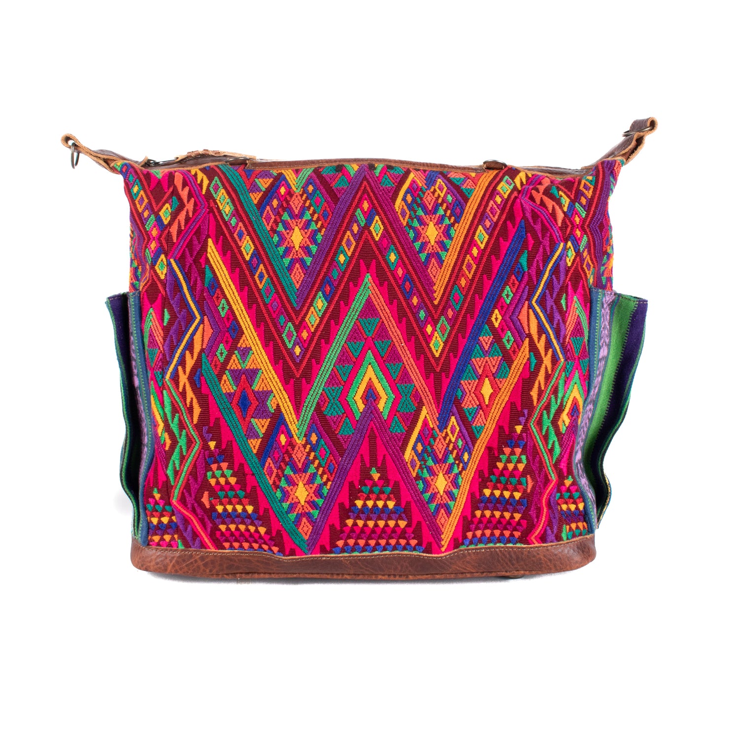 Many unique Maya symbols can be found in our One of a Kind Collection. The fabric we use for this collection is made from upcycled vintage huipiles (traditional attire worn by women in Guatemala) that were handwoven by Artisans up to 10 years ago, and they have lived a full life before being incorporated into your leather bag!