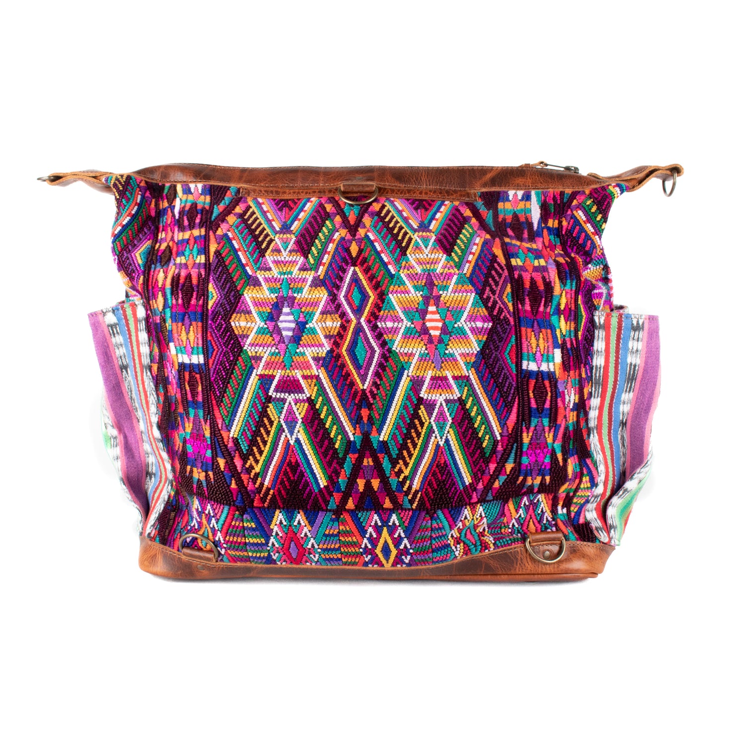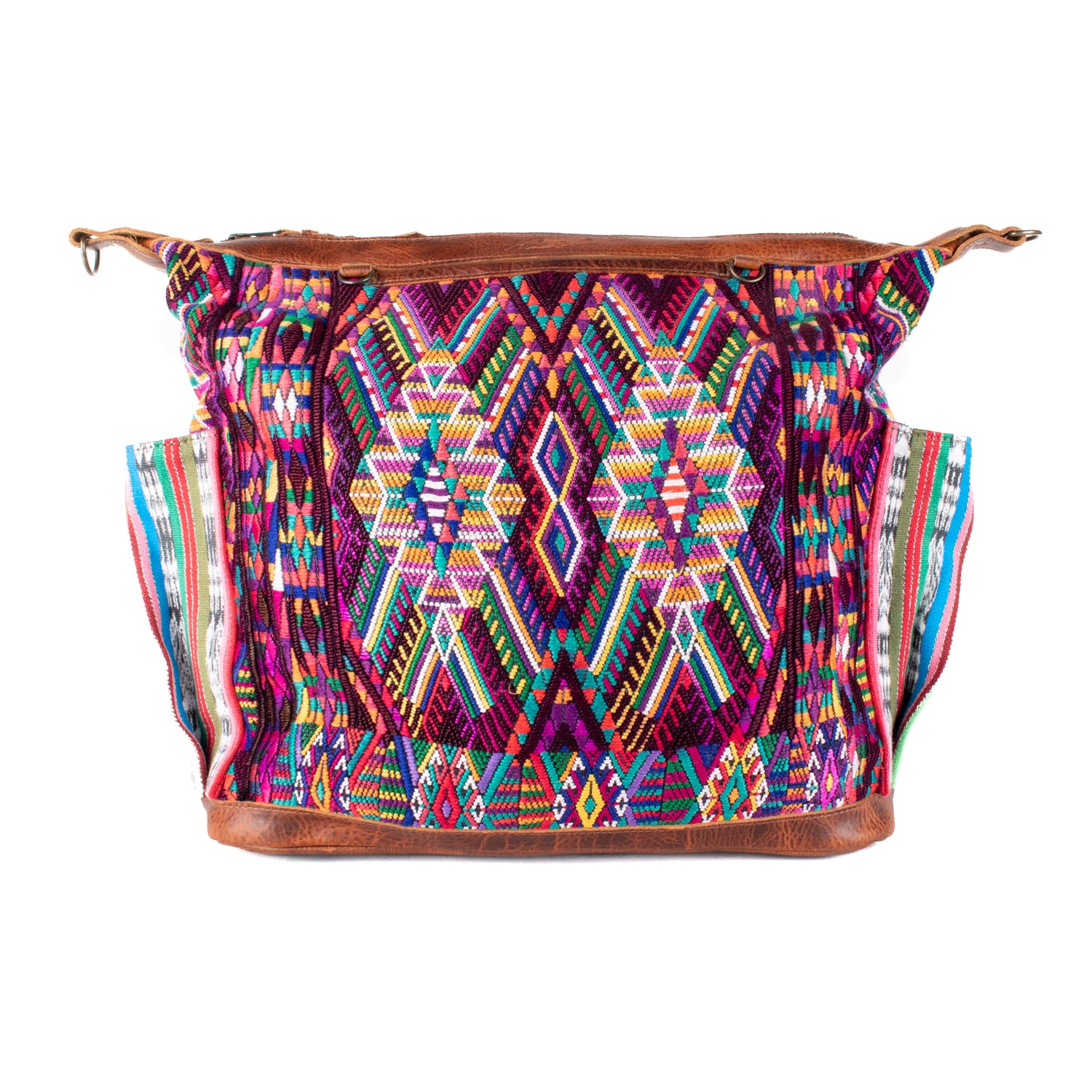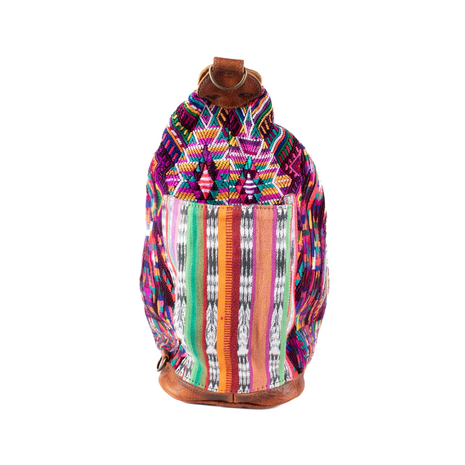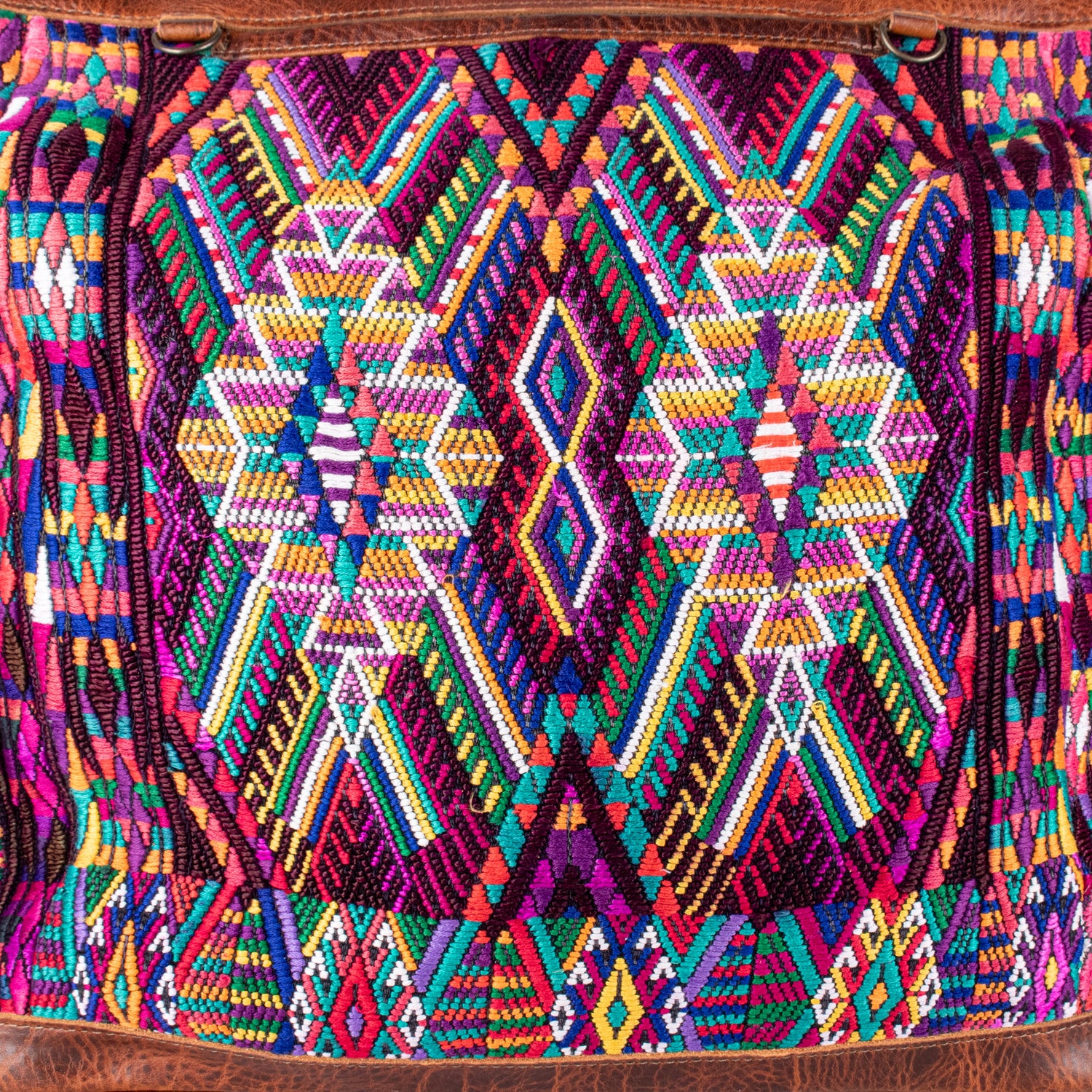 Many unique Maya symbols can be found in our One of a Kind Collection. The fabric we use for this collection is made from upcycled vintage huipiles (traditional attire worn by women in Guatemala) that were handwoven by Artisans up to 10 years ago, and they have lived a full life before being incorporated into your leather bag!