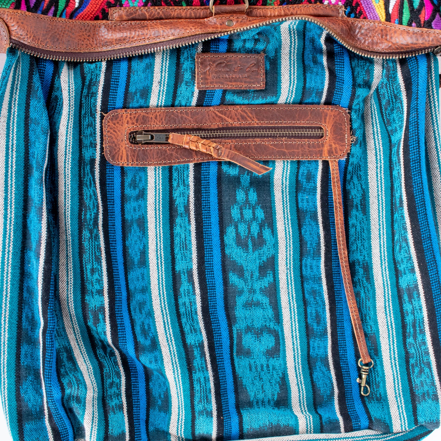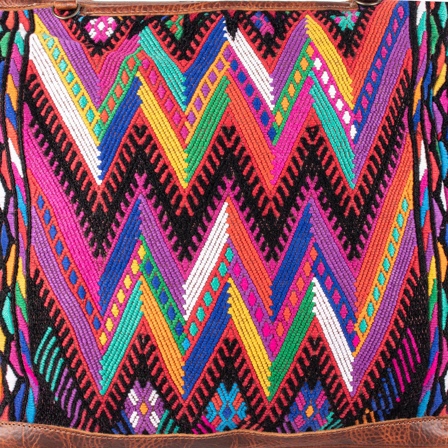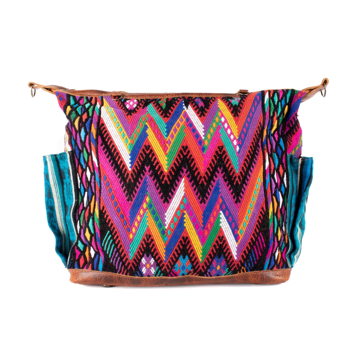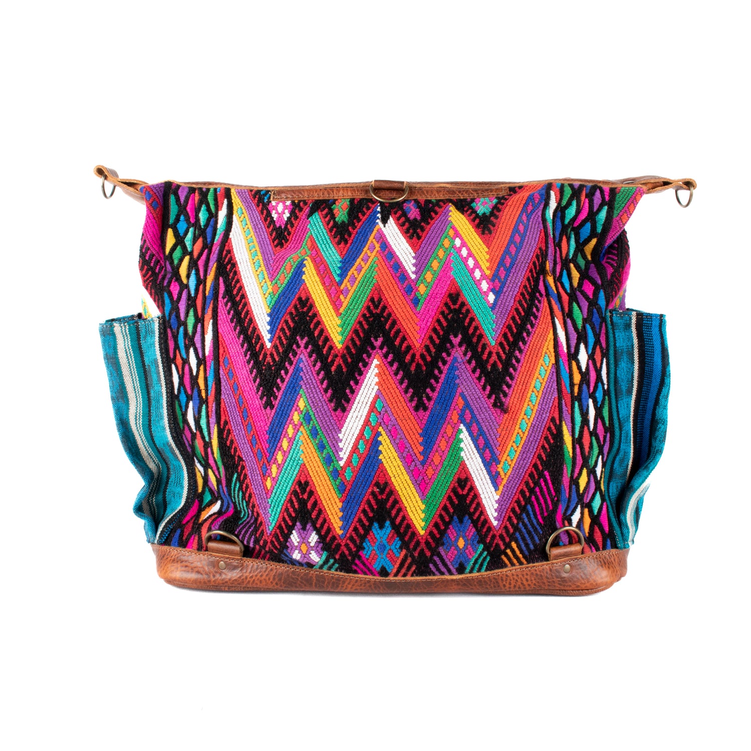 Many unique Maya symbols can be found in our One of a Kind Collection. The fabric we use for this collection is made from upcycled vintage huipiles (traditional attire worn by women in Guatemala) that were handwoven by Artisans up to 10 years ago, and they have lived a full life before being incorporated into your leather bag!