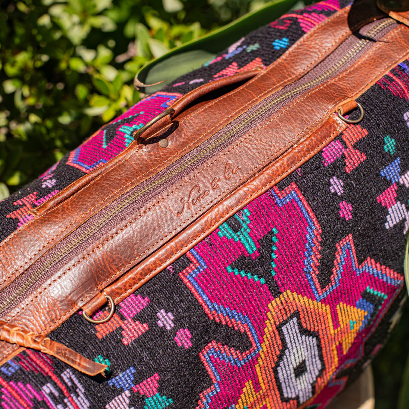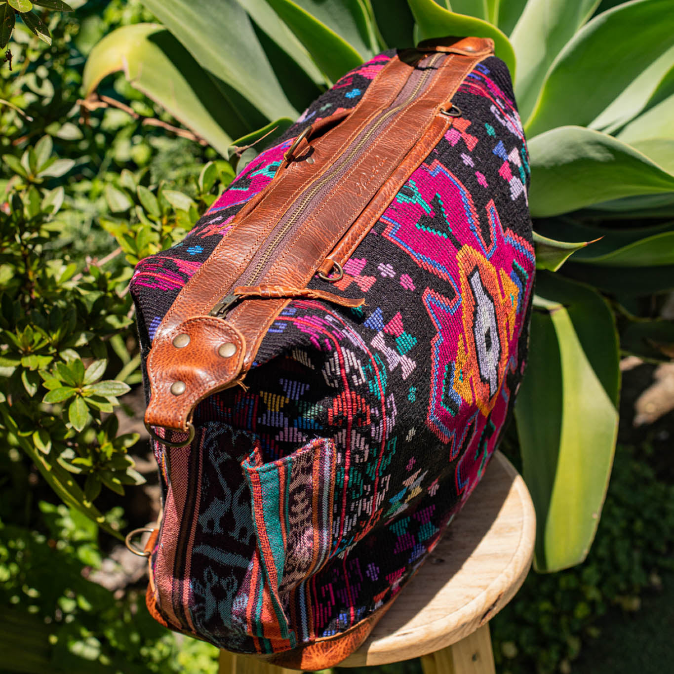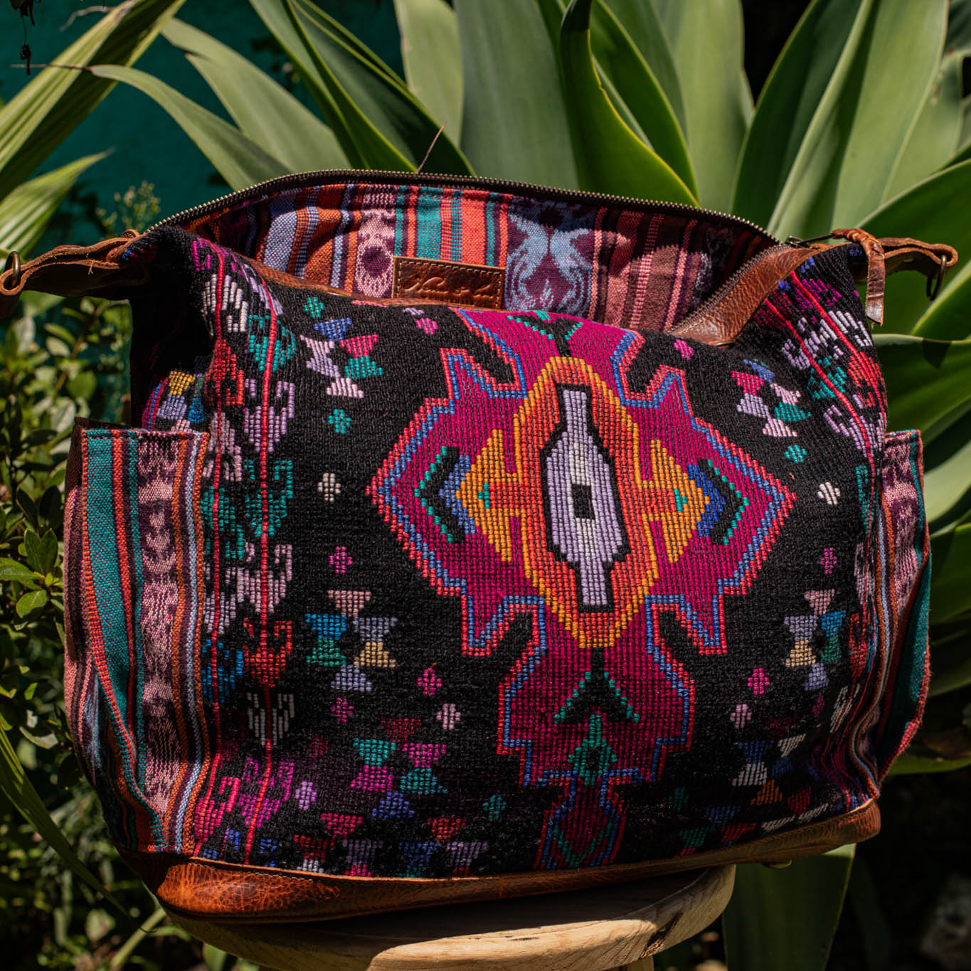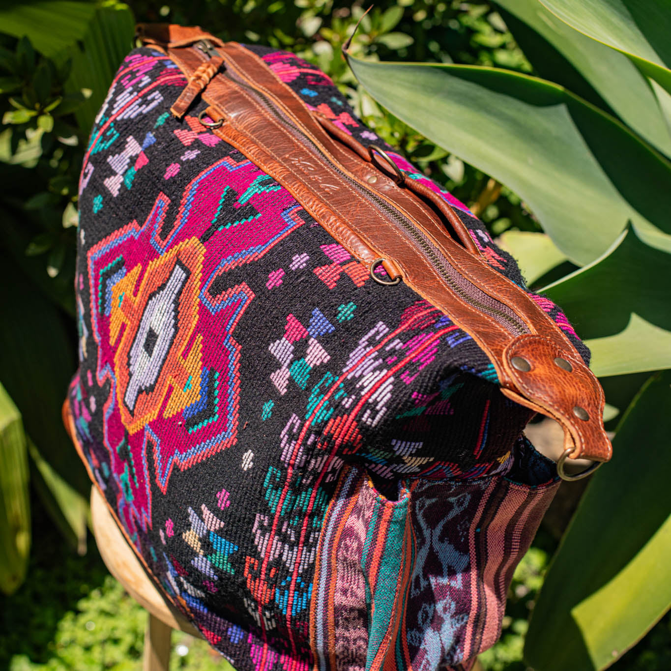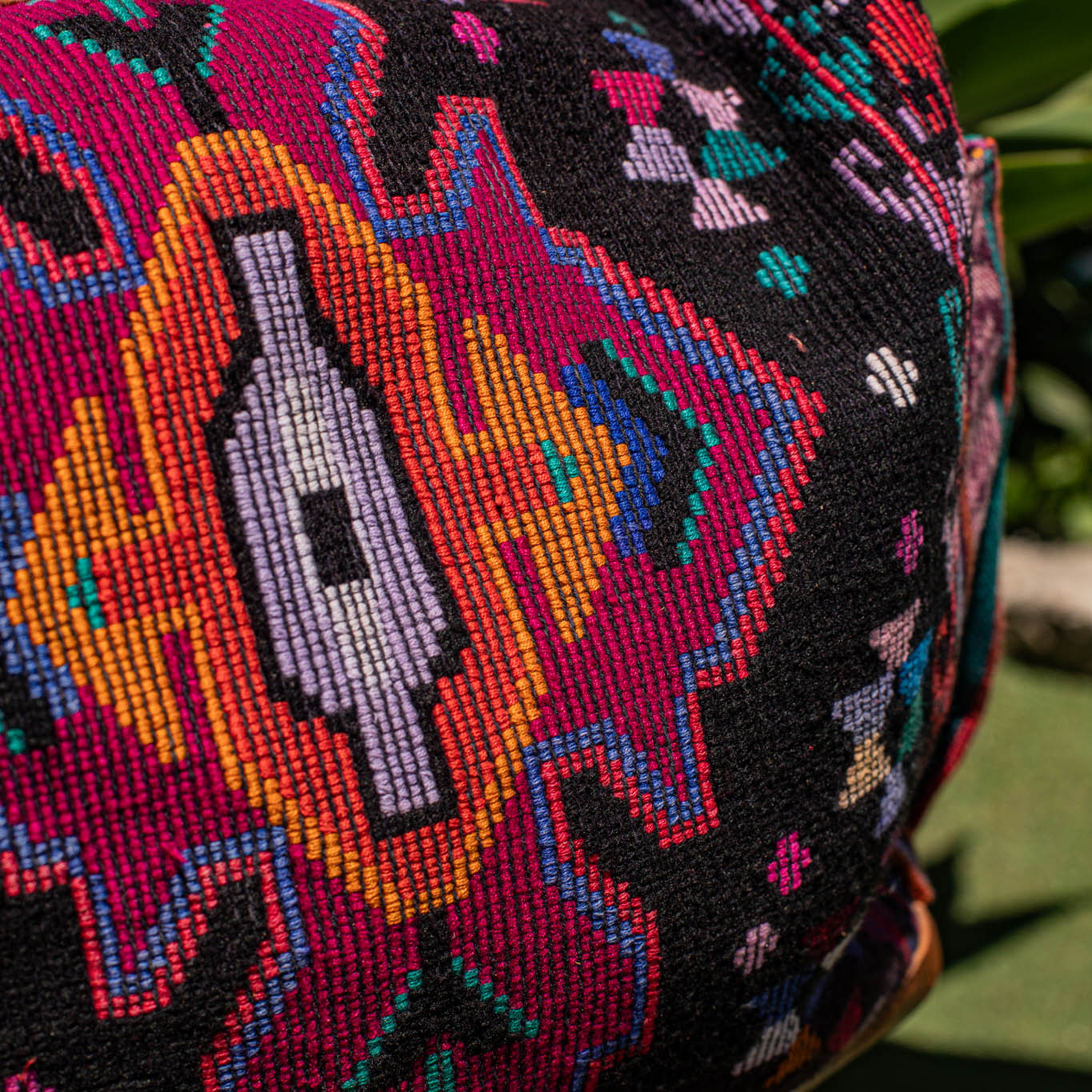 Many unique Maya symbols can be found in our One of a Kind Collection. The fabric we use for this collection is made from upcycled vintage huipiles (traditional attire worn by women in Guatemala) that were handwoven by Artisans up to 10 years ago, and they have lived a full life before being incorporated into your leather bag!
