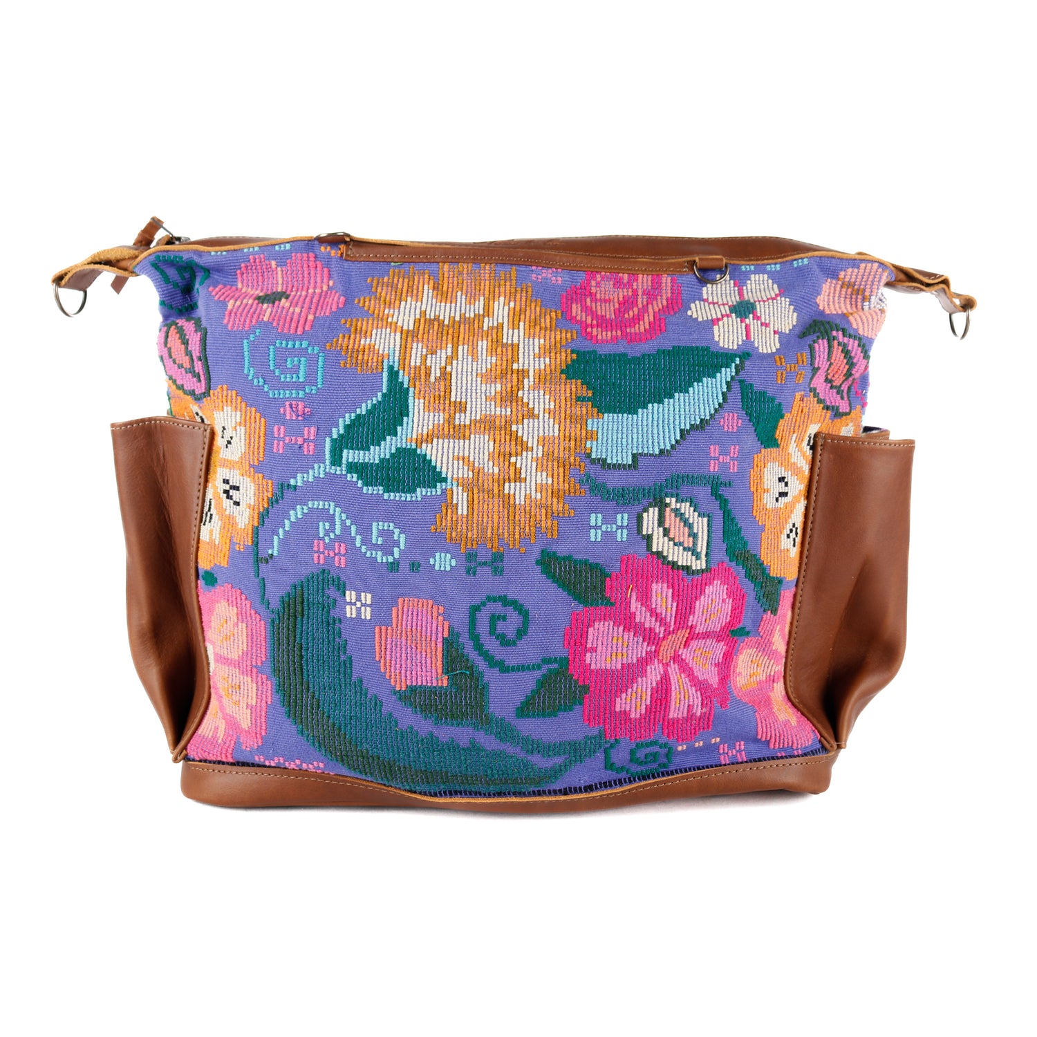 Many unique Maya symbols can be found in our One of a Kind Collection. The fabric we use for this collection is made from upcycled vintage huipiles (traditional attire worn by women in Guatemala) that were handwoven by Artisans up to 10 years ago, and they have lived a full life before being incorporated into your leather bag!