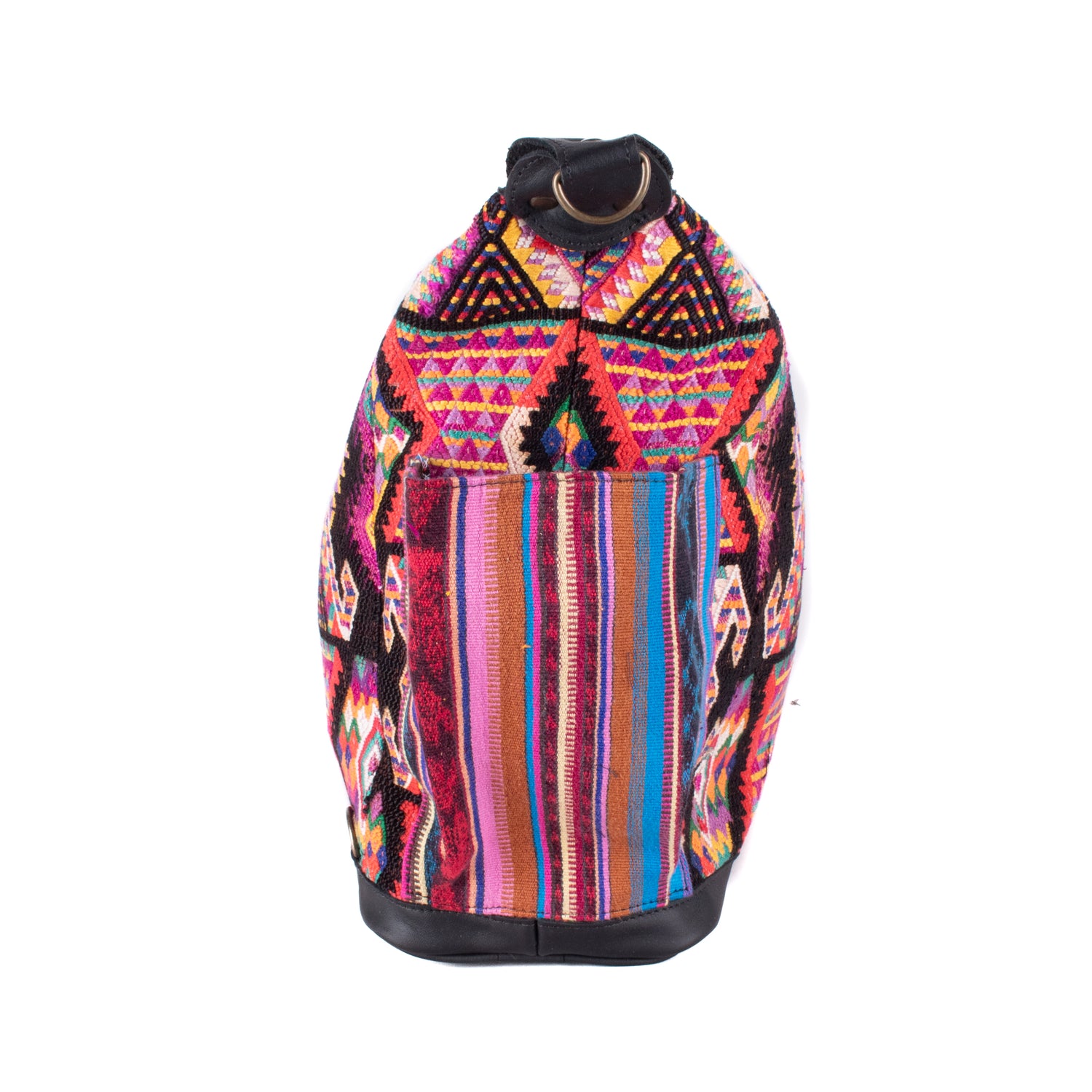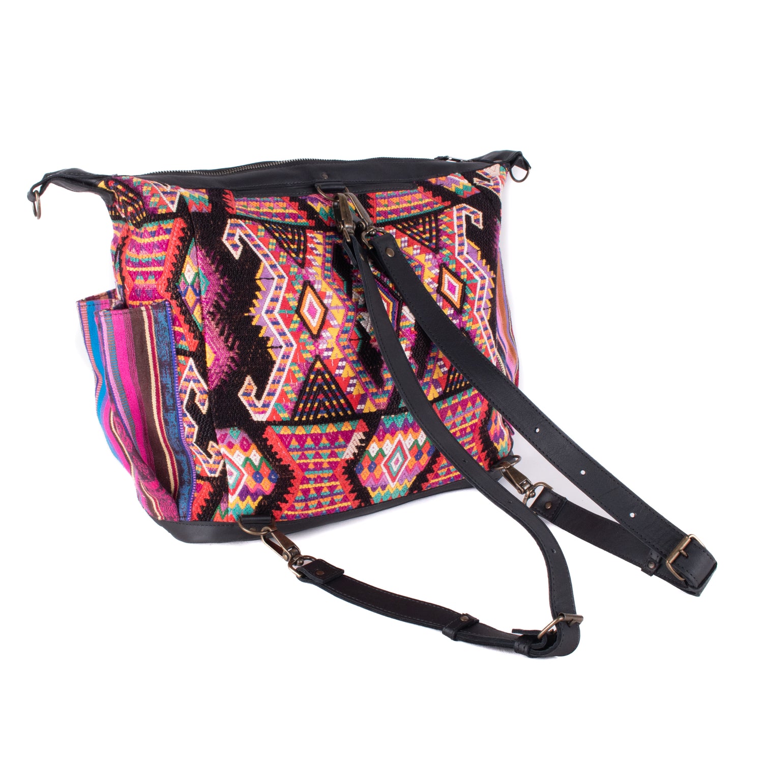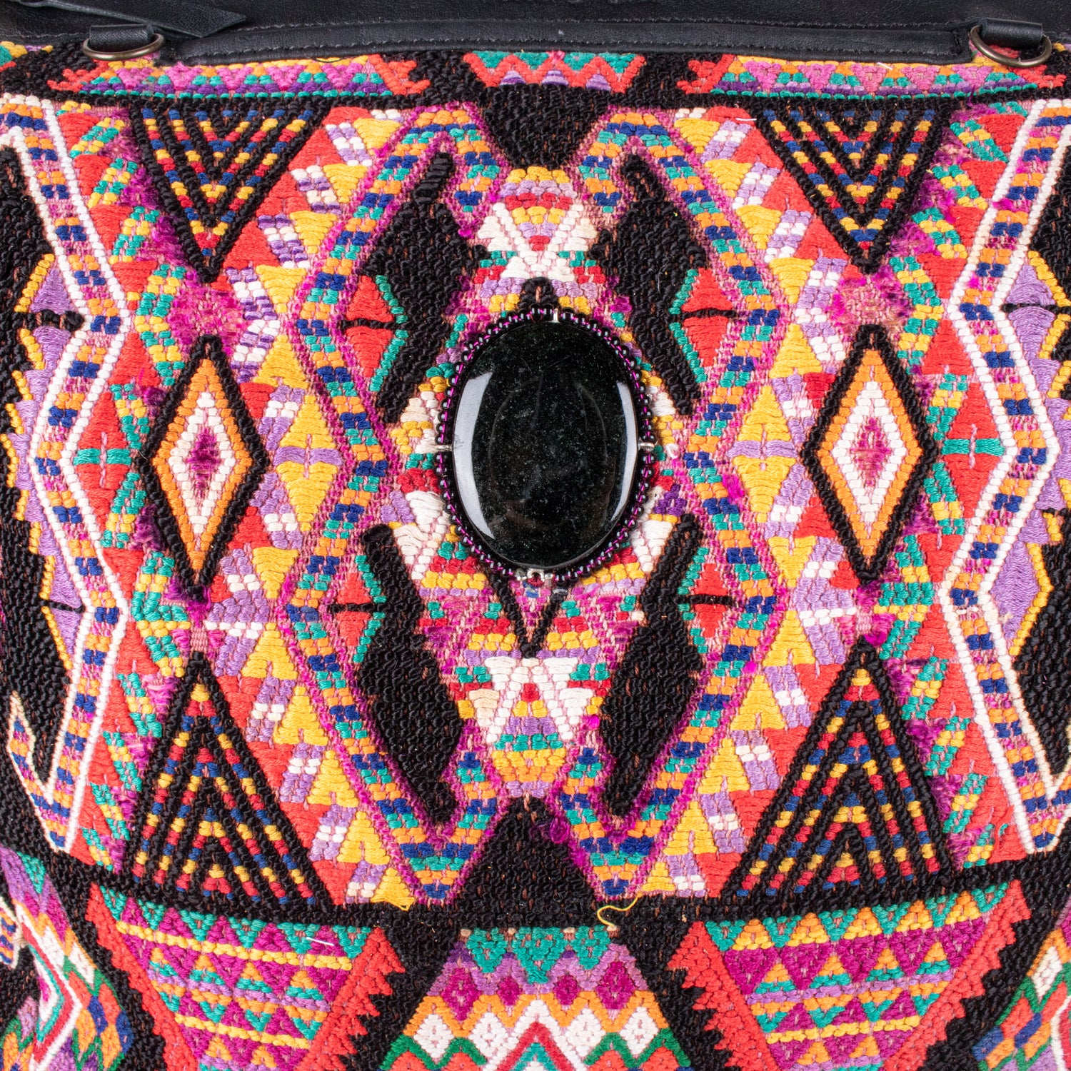 Many unique Maya symbols can be found in our One of a Kind Collection. The fabric we use for this collection is made from upcycled vintage huipiles (traditional attire worn by women in Guatemala) that were handwoven by Artisans up to 10 years ago, and they have lived a full life before being incorporated into your leather bag!