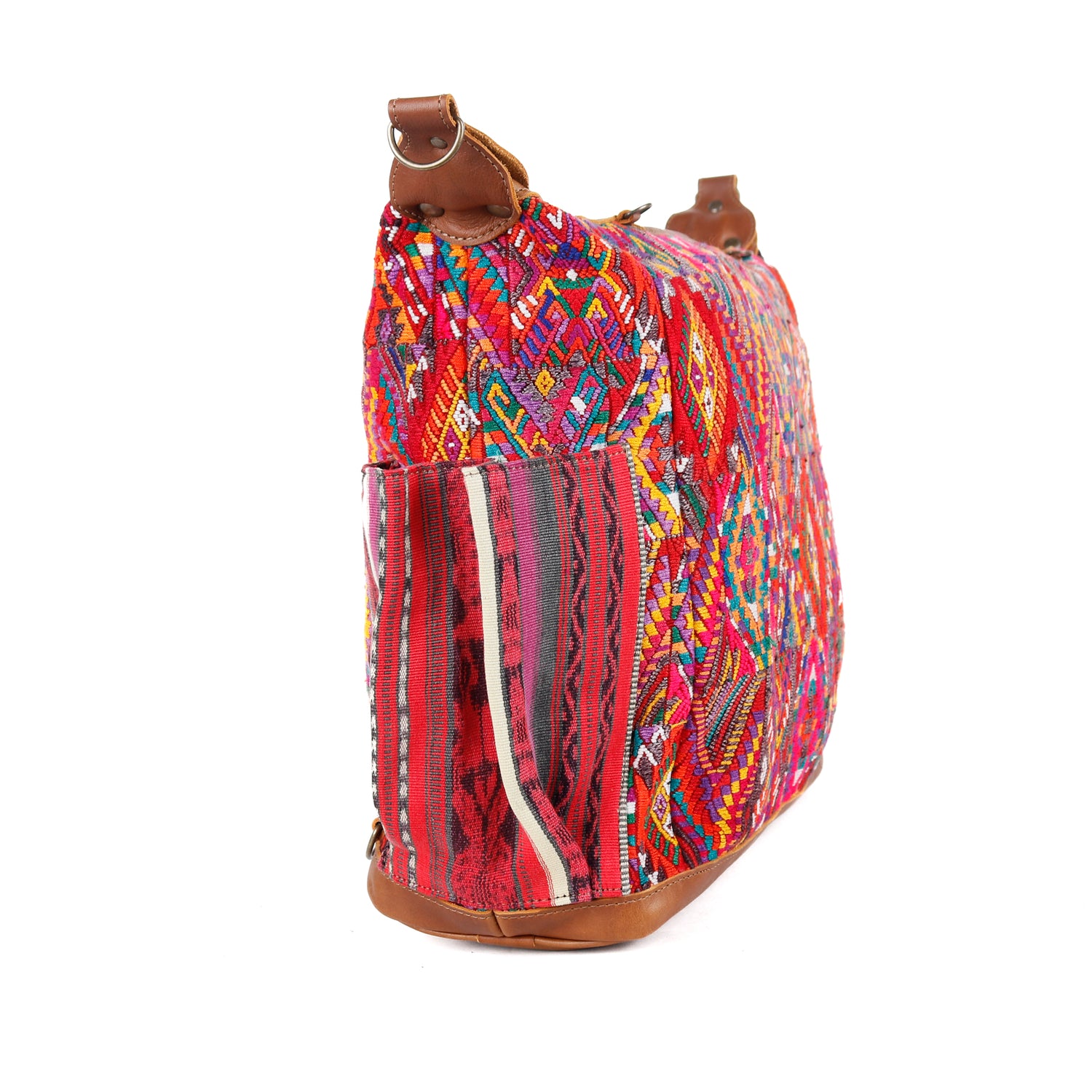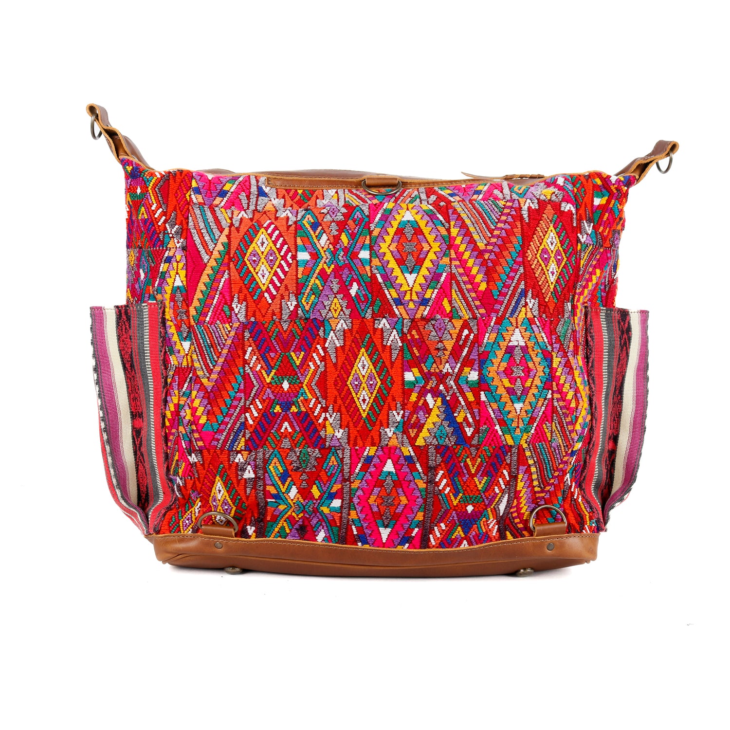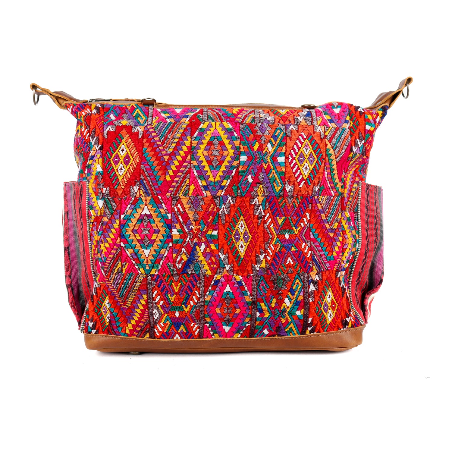 Many unique Maya symbols can be found in our One of a Kind Collection. The fabric we use for this collection is made from upcycled vintage huipiles (traditional attire worn by women in Guatemala) that were handwoven by Artisans up to 10 years ago, and they have lived a full life before being incorporated into your leather bag!