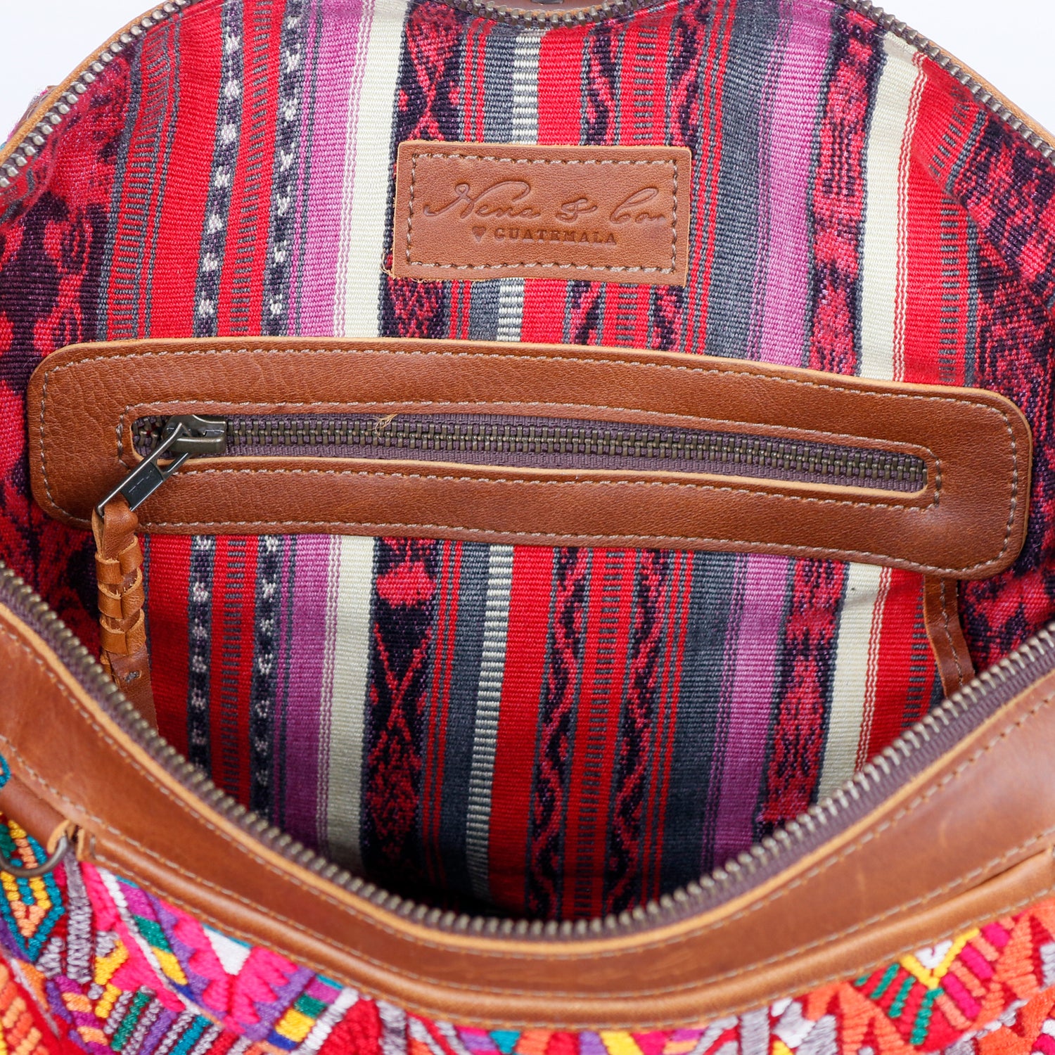 We make every effort to provide our customers with the best-handcrafted and high-quality bags. Please note that all our processes to make the bags are done by hand, from curing, cutting, and treating the leather to using up-cycled huipils. Our bags have natural characteristics and qualities that should not be considered as flaws or as damage because they do not interfere with the functionality of the bag. We up-cycle vintage Maya clothing to make beautiful one-of-a-kind products. Many times you will find snags in the pattern. This is normal. Should your patterned huipil snag you can snip the loose threads with scissors. Do not pull them.