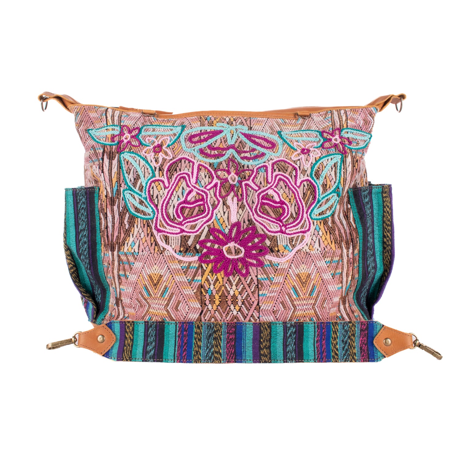 Many unique Maya symbols can be found in our One of a Kind Collection. The fabric we use for this collection is made from upcycled vintage huipiles (traditional attire worn by women in Guatemala) that were handwoven by Artisans up to 10 years ago, and they have lived a full life before being incorporated into your leather bag!