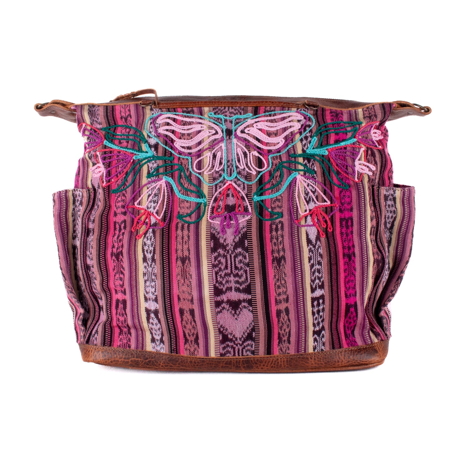 Many unique Maya symbols can be found in our One of a Kind Collection. The fabric we use for this collection is made from upcycled vintage huipiles (traditional attire worn by women in Guatemala) that were handwoven by Artisans up to 10 years ago, and they have lived a full life before being incorporated into your leather bag!