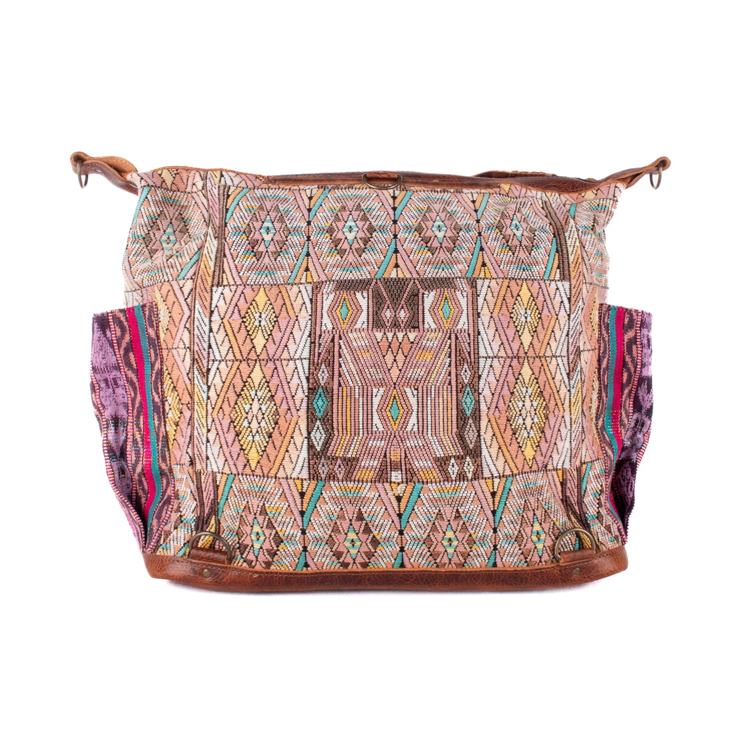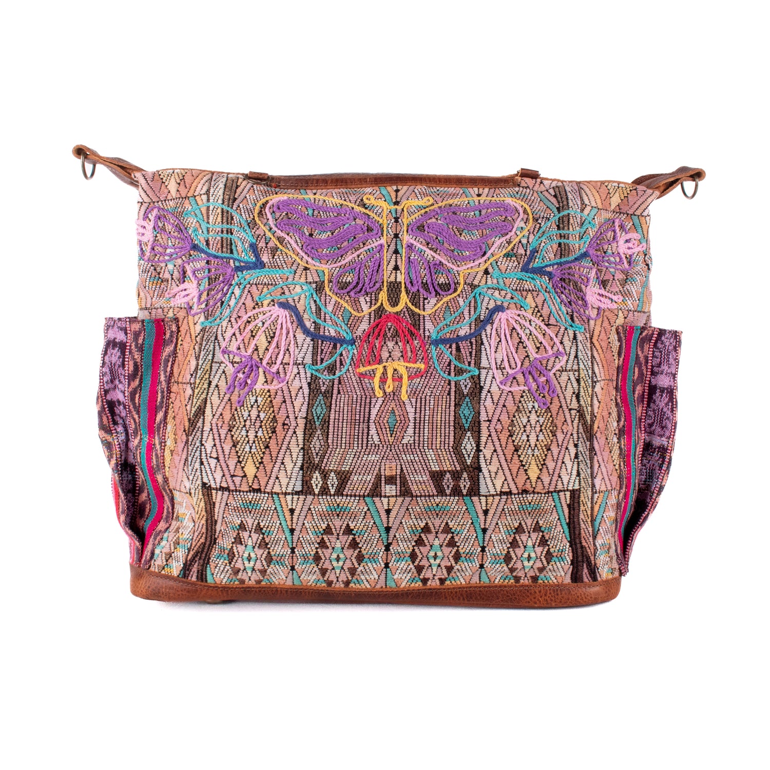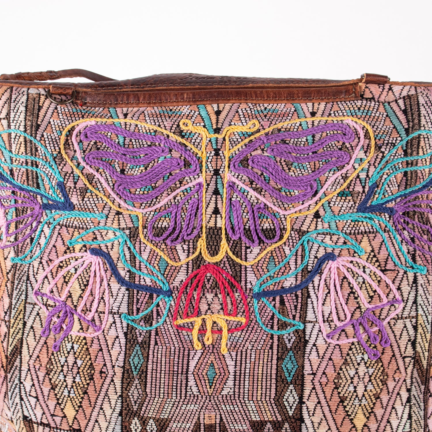 Many unique Maya symbols can be found in our One of a Kind Collection. The fabric we use for this collection is made from upcycled vintage huipiles (traditional attire worn by women in Guatemala) that were handwoven by Artisans up to 10 years ago, and they have lived a full life before being incorporated into your leather bag!