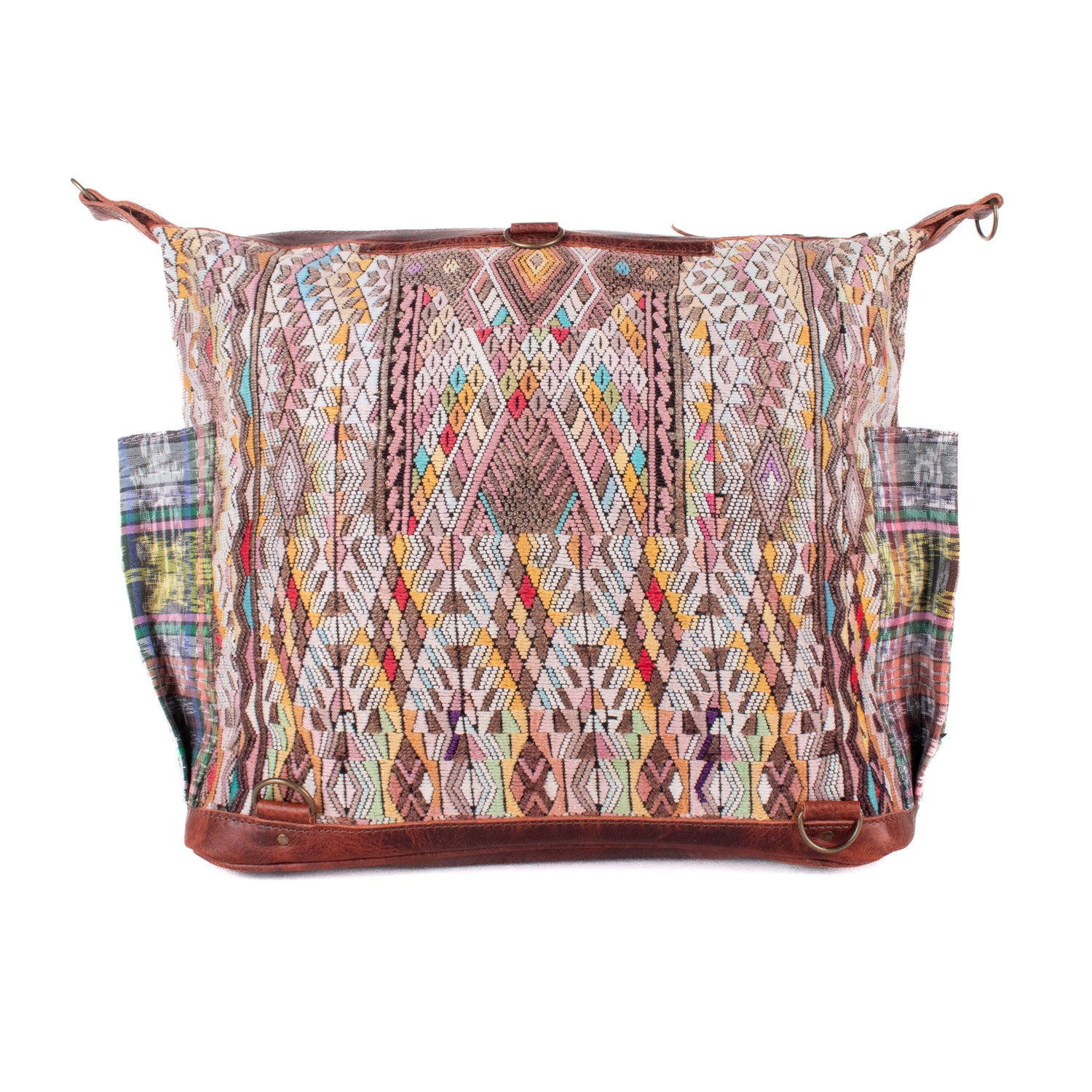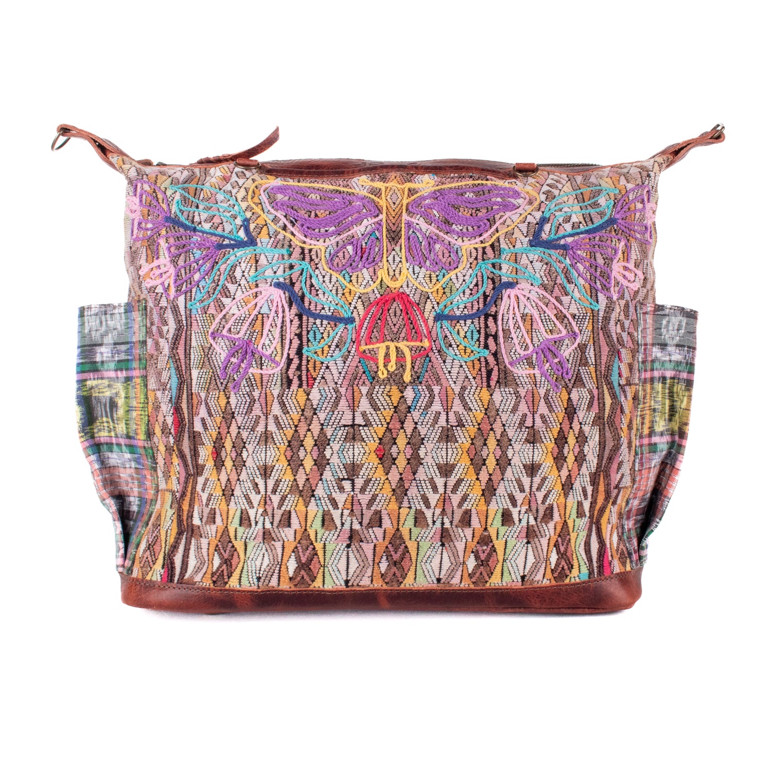 Many unique Maya symbols can be found in our One of a Kind Collection. The fabric we use for this collection is made from upcycled vintage huipiles (traditional attire worn by women in Guatemala) that were handwoven by Artisans up to 10 years ago, and they have lived a full life before being incorporated into your leather bag!