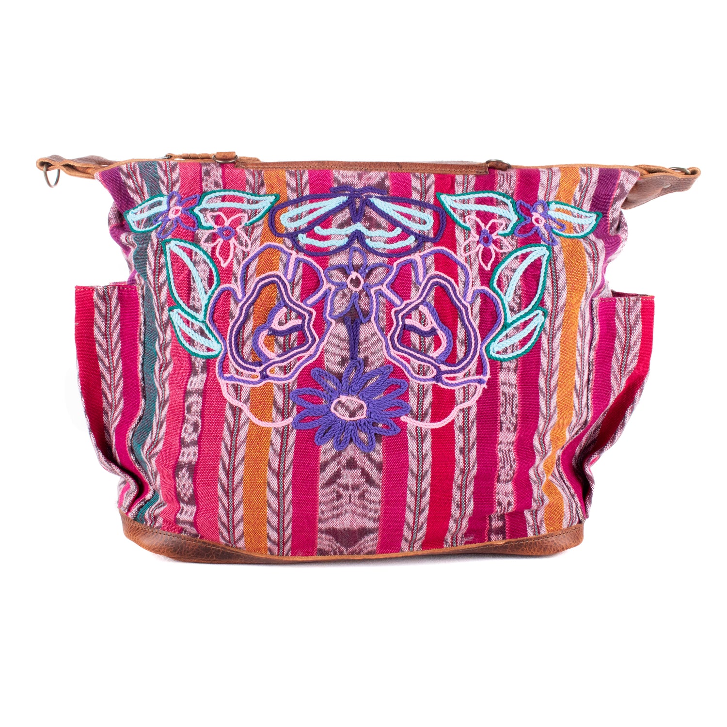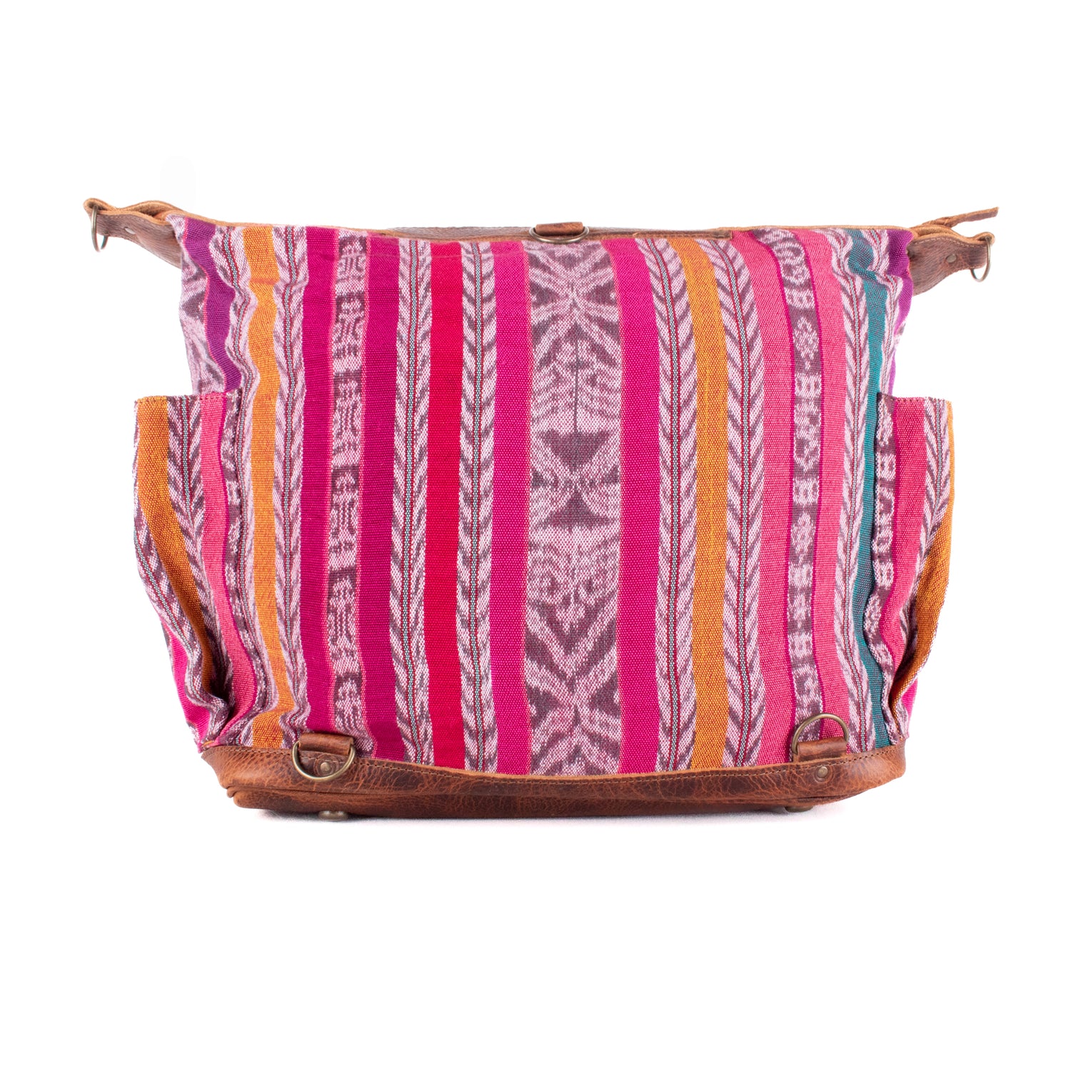 Many unique Maya symbols can be found in our One of a Kind Collection. The fabric we use for this collection is made from upcycled vintage huipiles (traditional attire worn by women in Guatemala) that were handwoven by Artisans up to 10 years ago, and they have lived a full life before being incorporated into your leather bag!