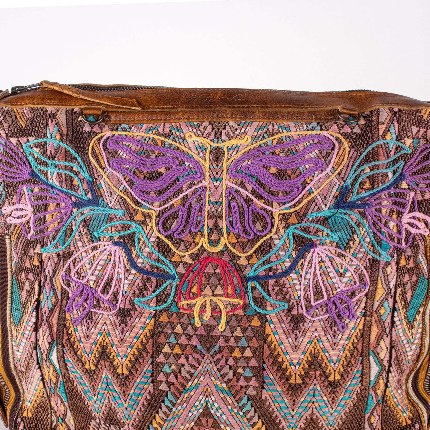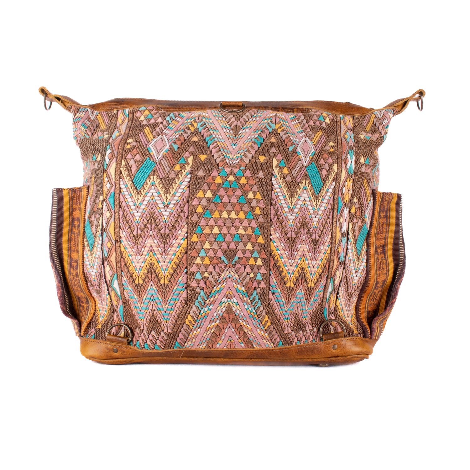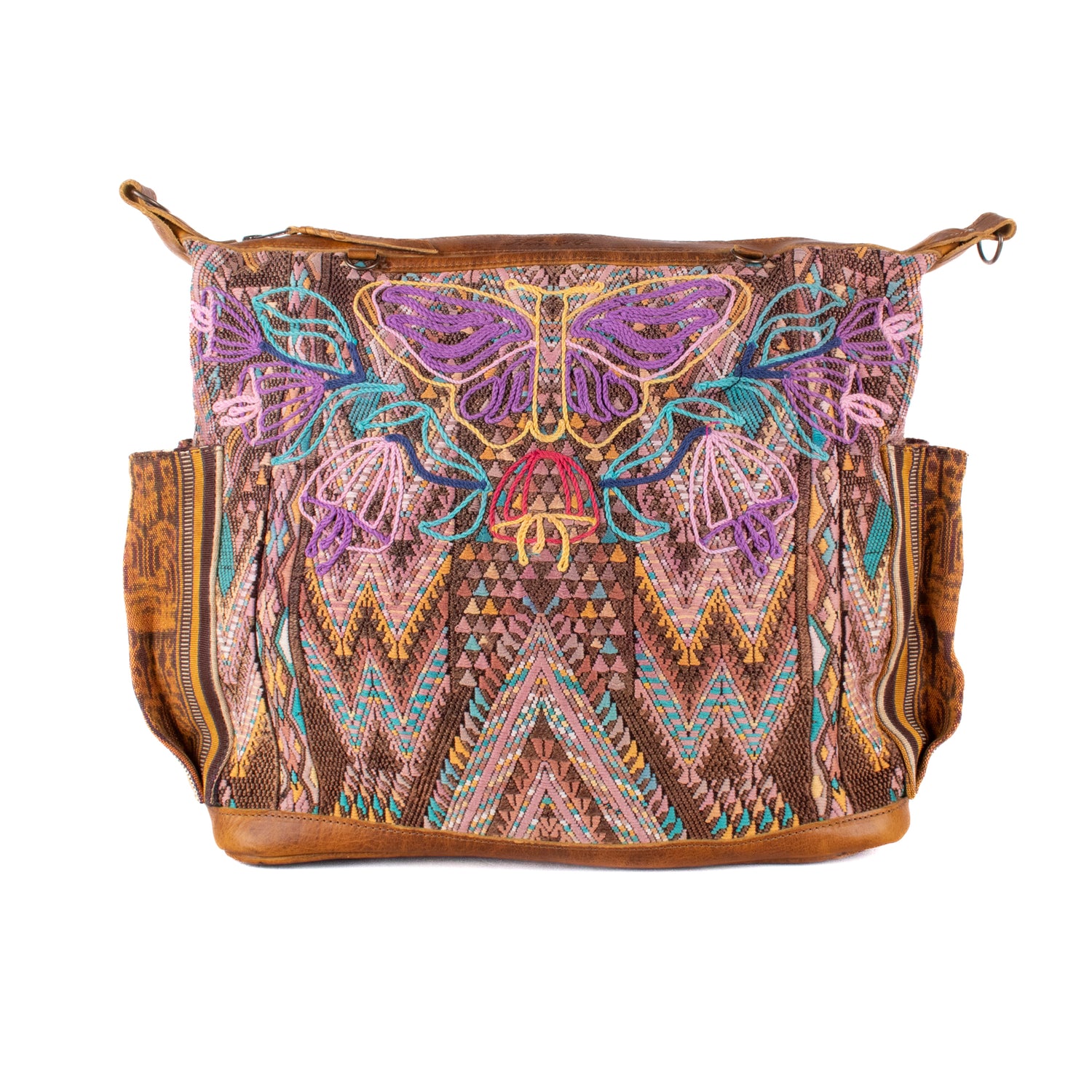 Many unique Maya symbols can be found in our One of a Kind Collection. The fabric we use for this collection is made from upcycled vintage huipiles (traditional attire worn by women in Guatemala) that were handwoven by Artisans up to 10 years ago, and they have lived a full life before being incorporated into your leather bag!