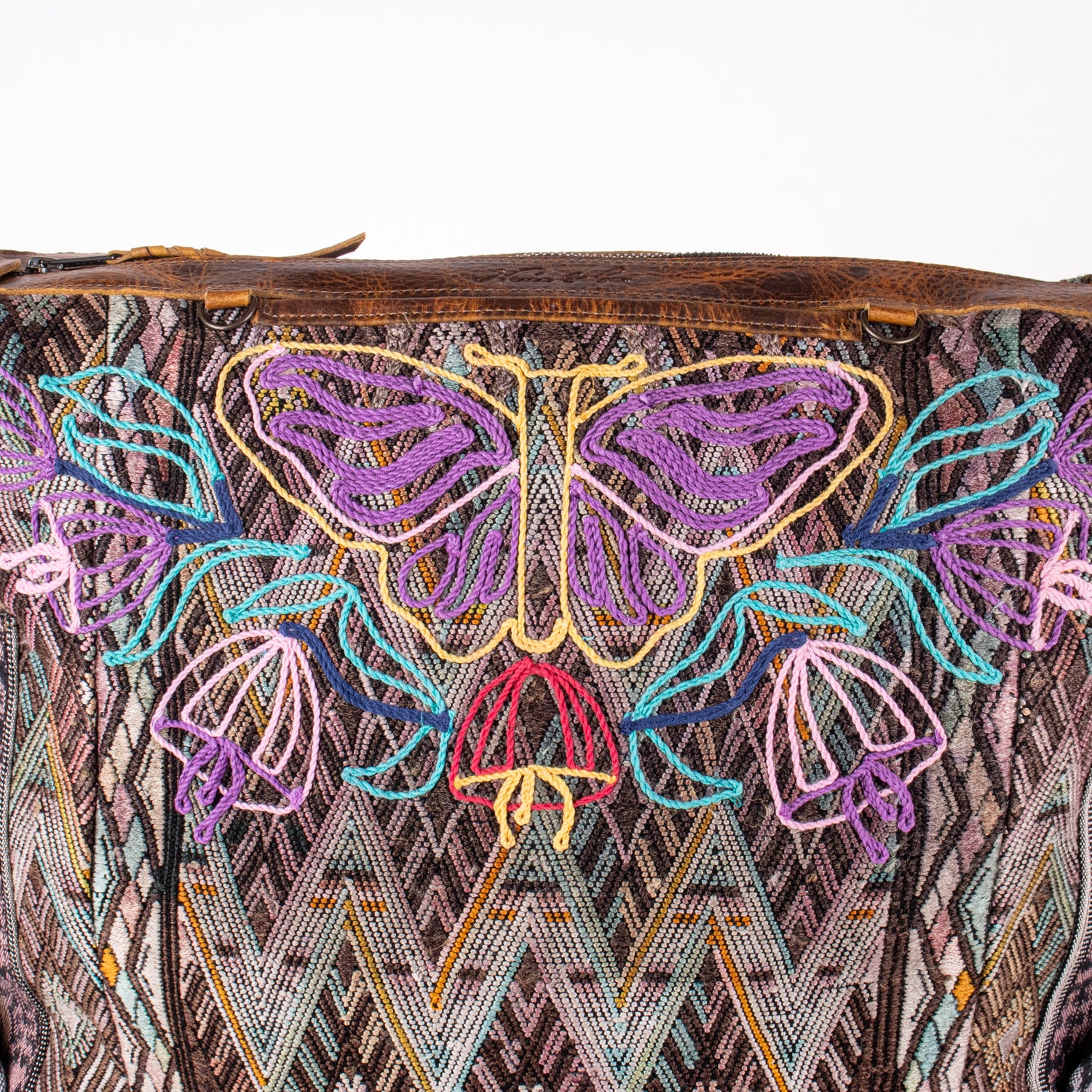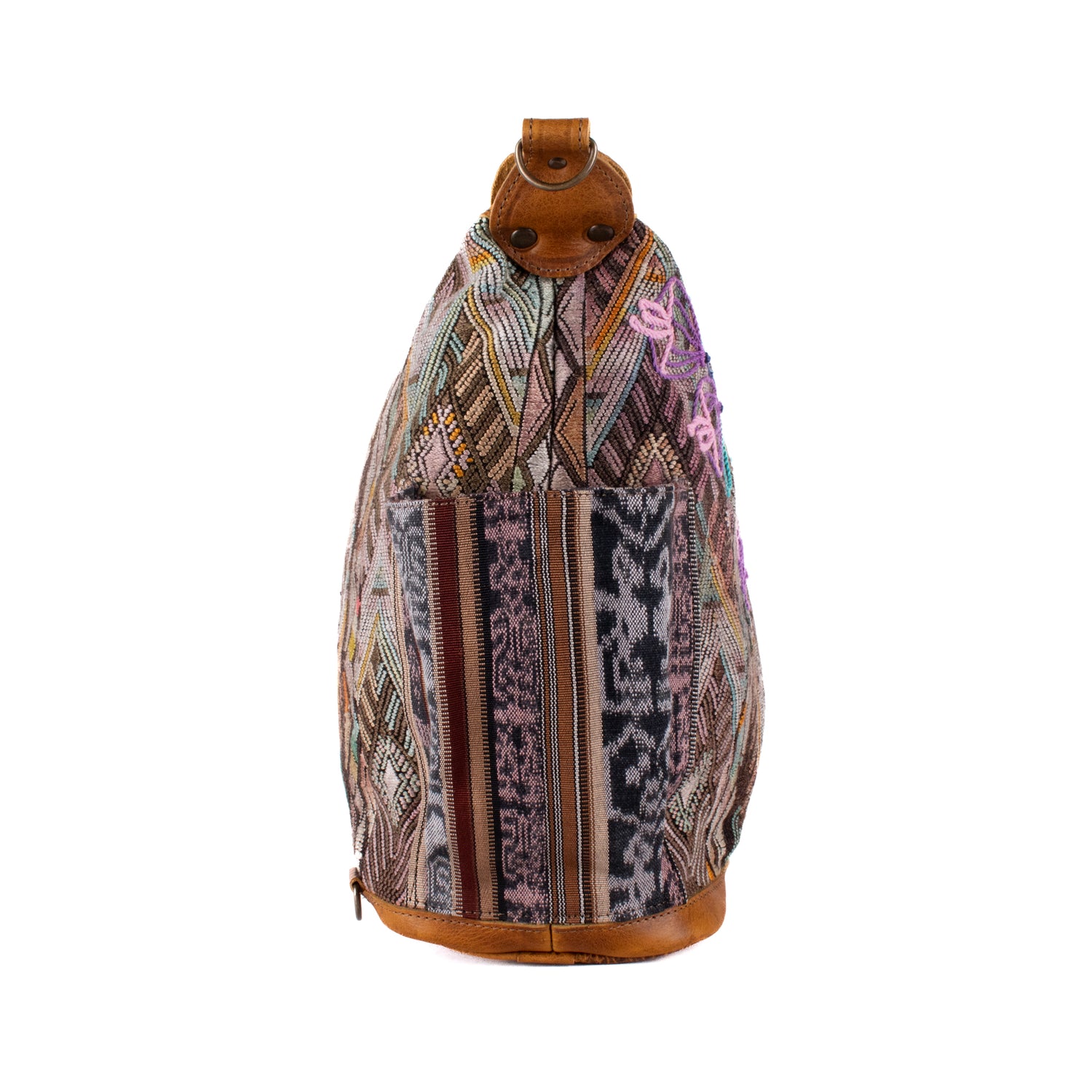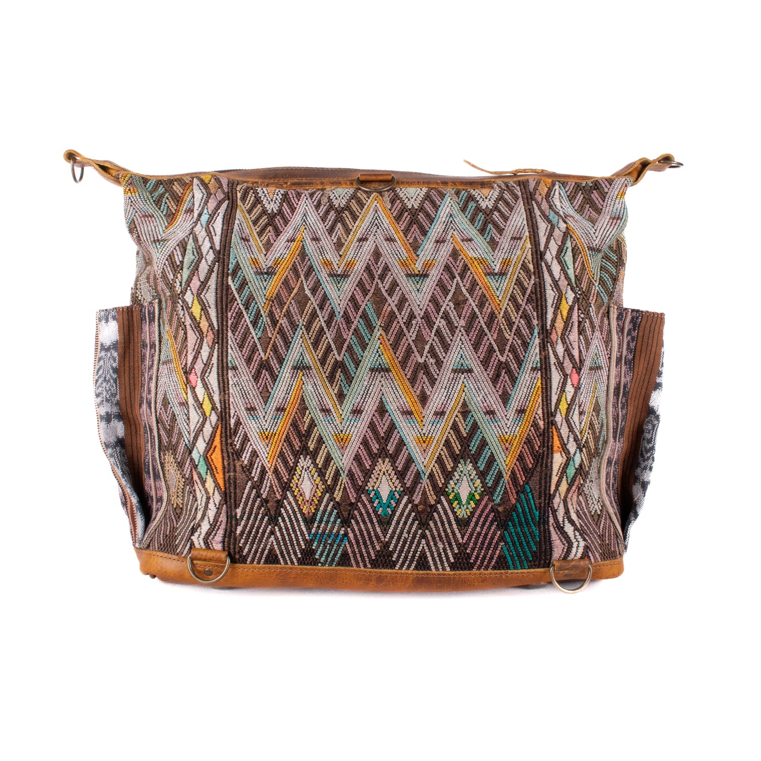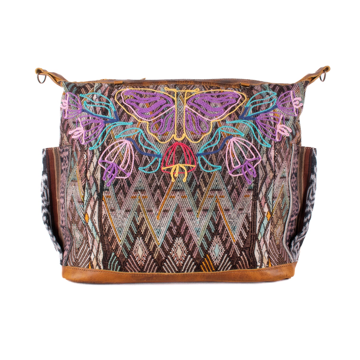 Many unique Maya symbols can be found in our One of a Kind Collection. The fabric we use for this collection is made from upcycled vintage huipiles (traditional attire worn by women in Guatemala) that were handwoven by Artisans up to 10 years ago, and they have lived a full life before being incorporated into your leather bag!
