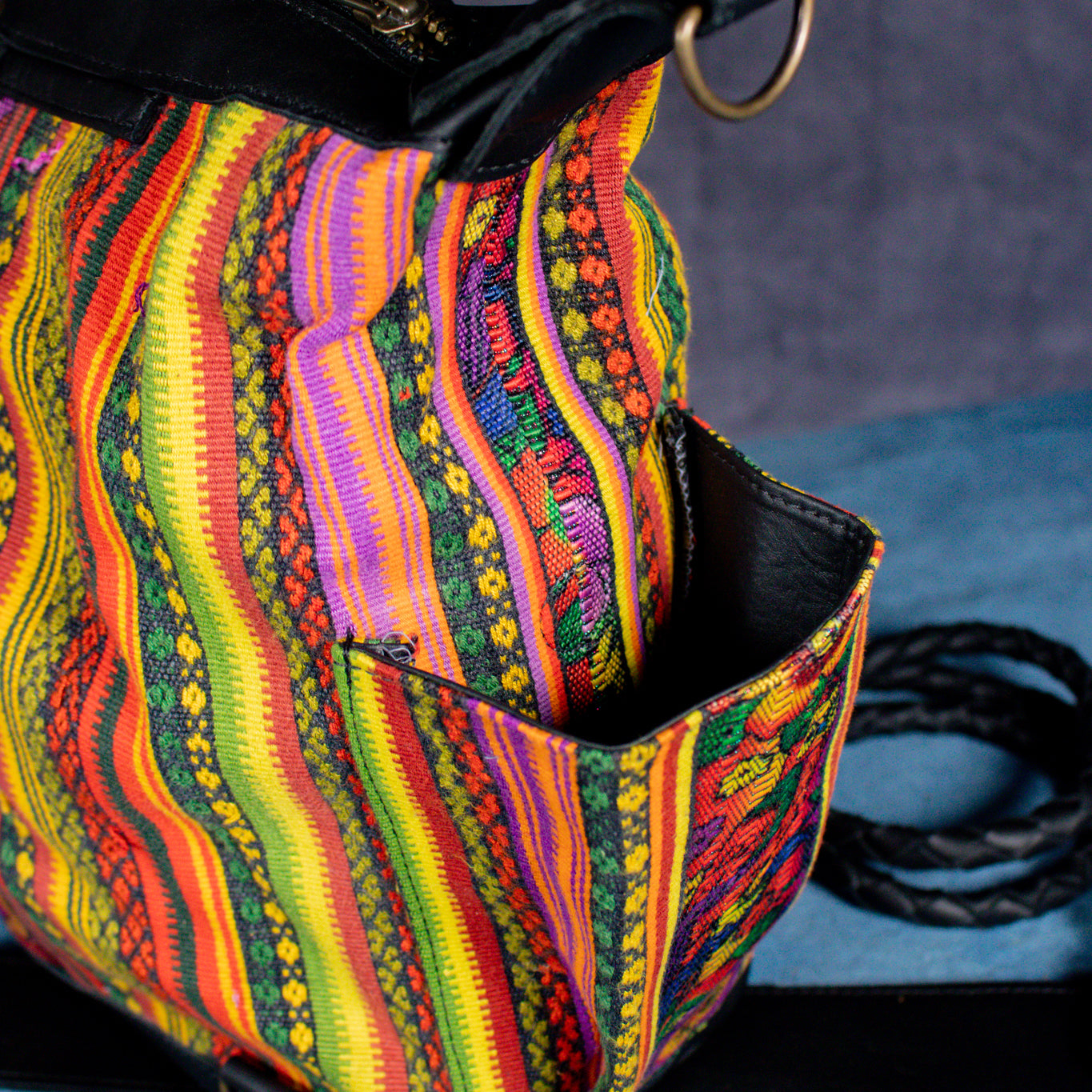Many unique Maya symbols can be found in our One of a Kind Collection. The fabric we use for this collection is made from upcycled vintage huipiles (traditional attire worn by women in Guatemala) that were handwoven by Artisans up to 10 years ago, and they have lived a full life before being incorporated into your leather bag!