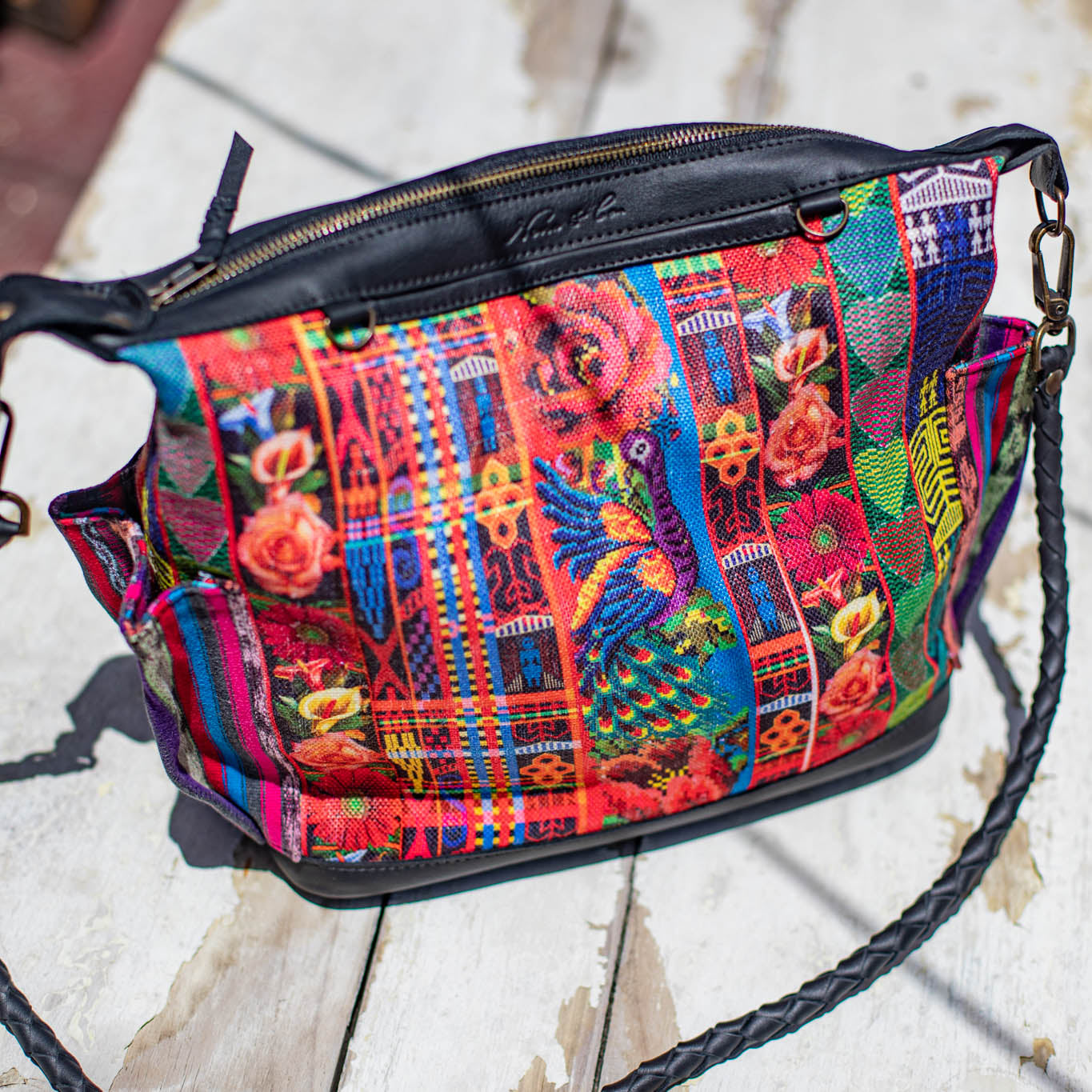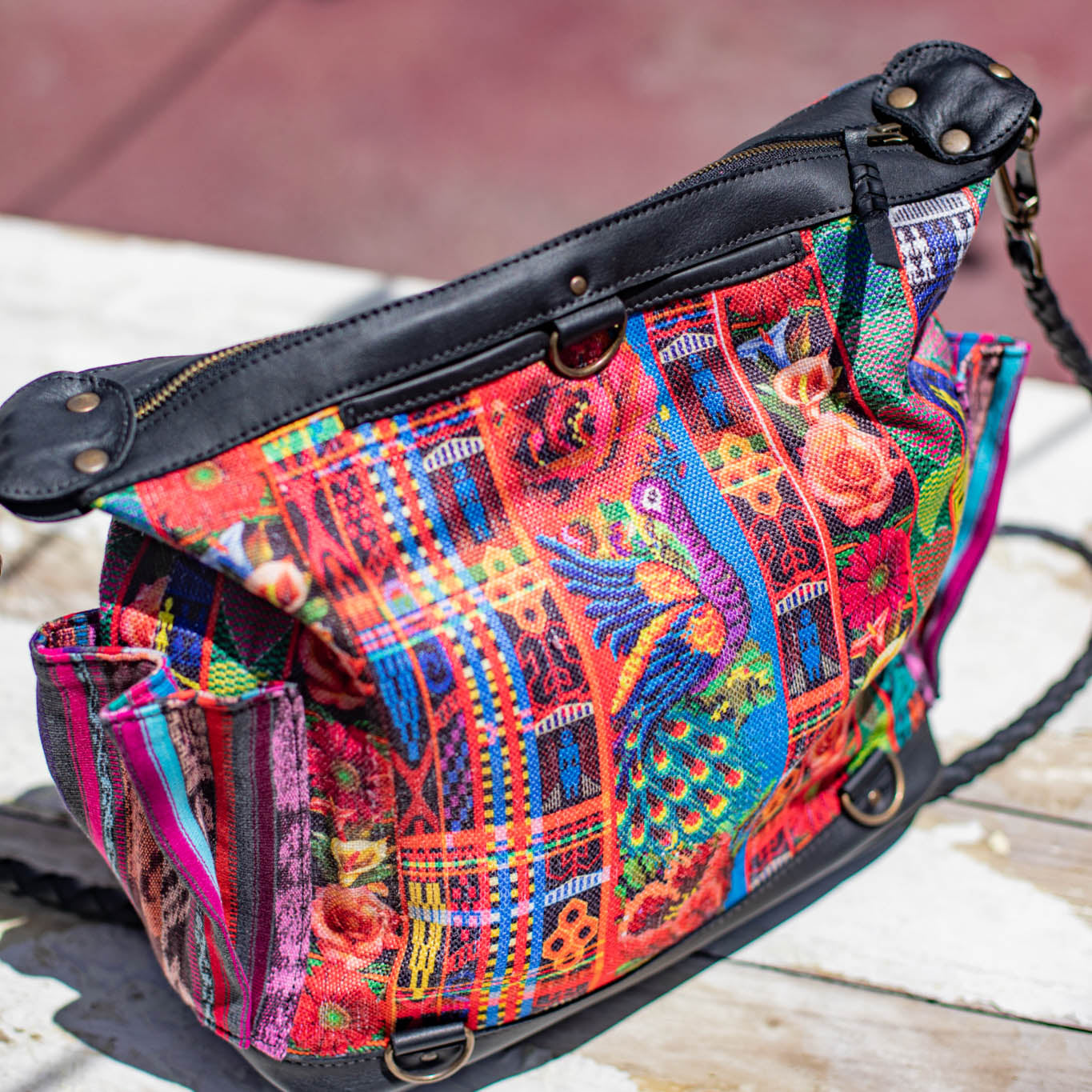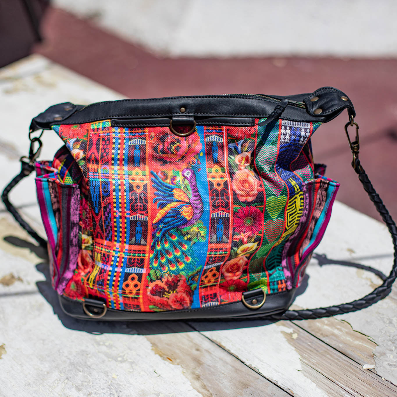 Many unique Maya symbols can be found in our One of a Kind Collection. The fabric we use for this collection is made from upcycled vintage huipiles (traditional attire worn by women in Guatemala) that were handwoven by Artisans up to 10 years ago, and they have lived a full life before being incorporated into your leather bag!