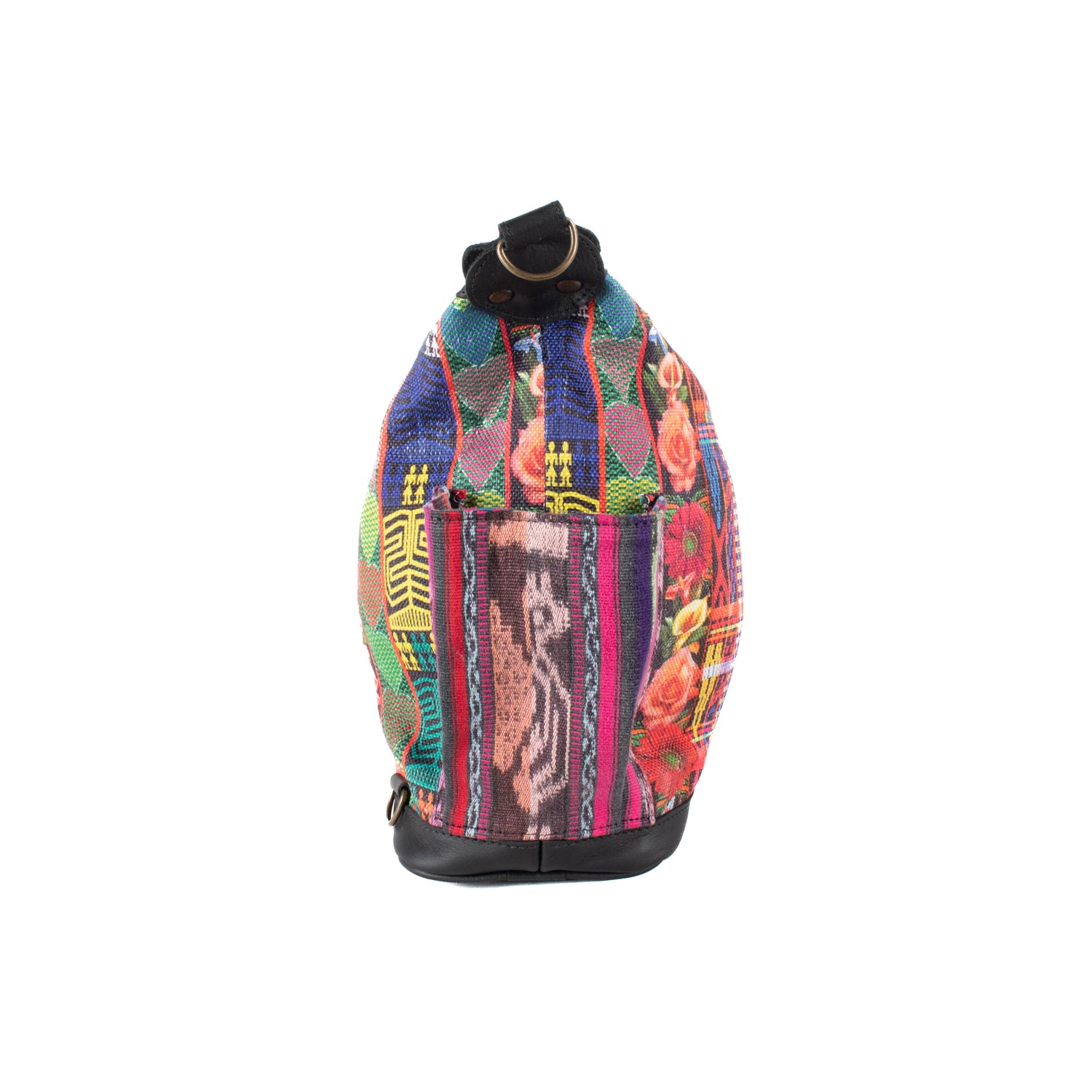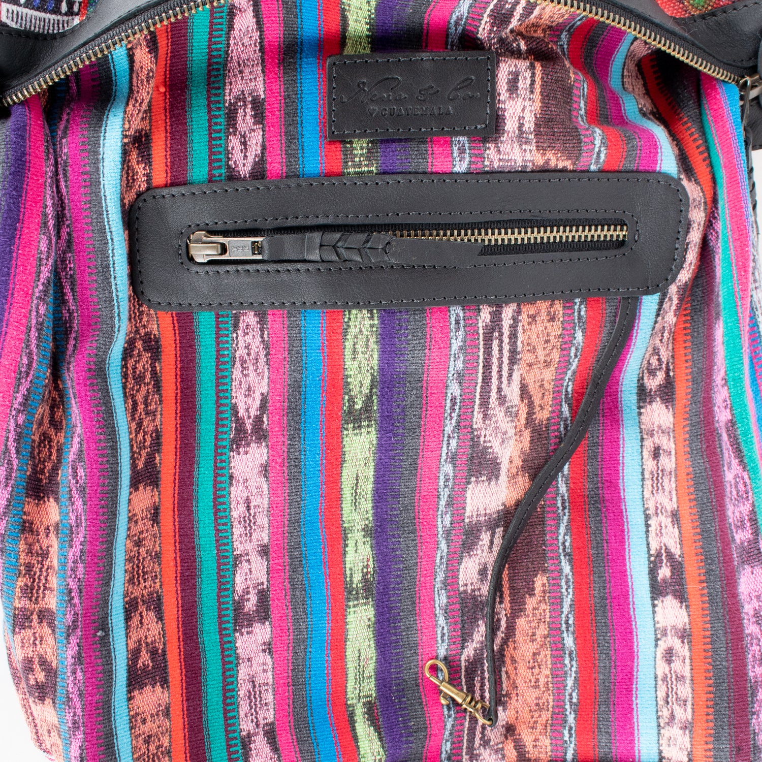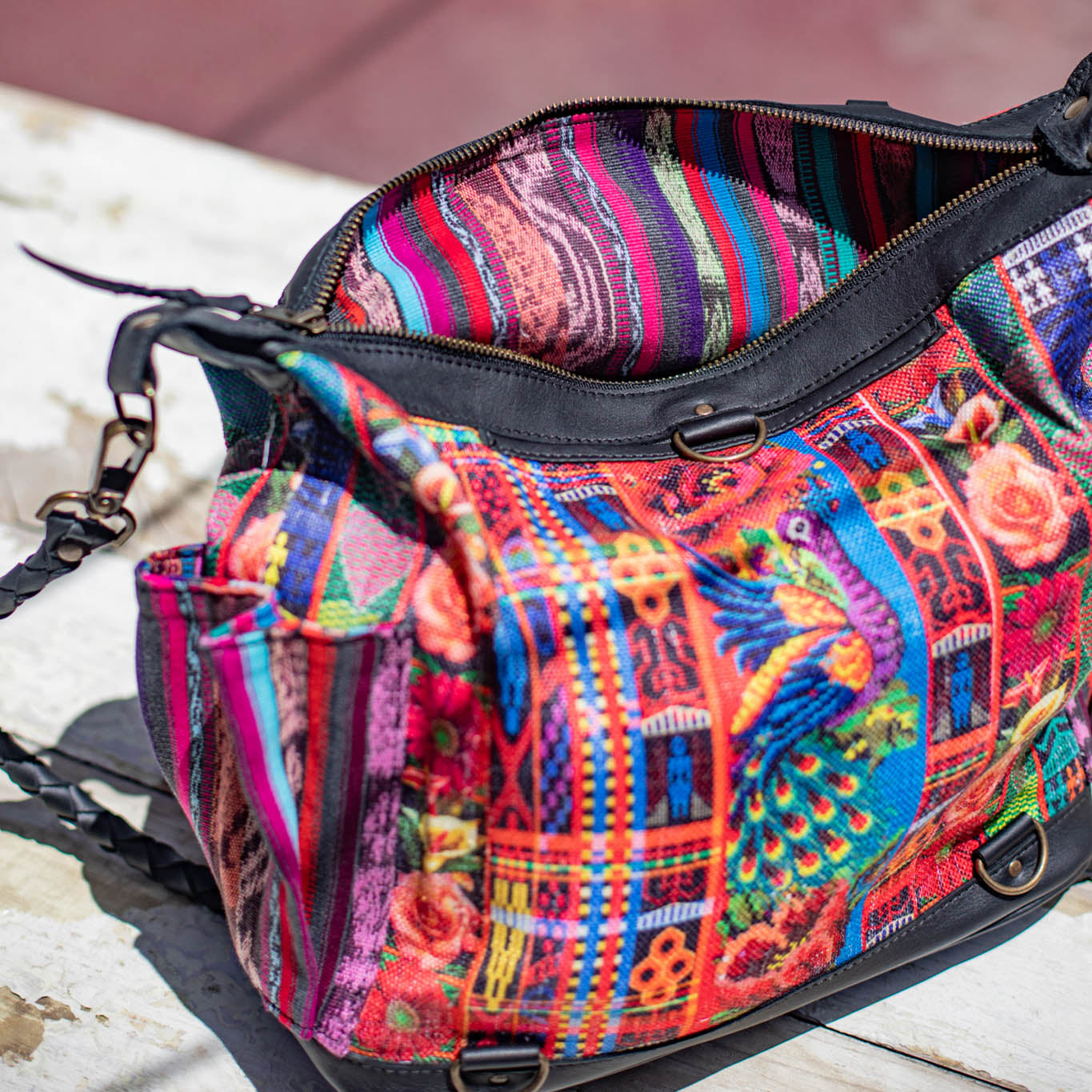 Many unique Maya symbols can be found in our One of a Kind Collection. The fabric we use for this collection is made from upcycled vintage huipiles (traditional attire worn by women in Guatemala) that were handwoven by Artisans up to 10 years ago, and they have lived a full life before being incorporated into your leather bag!
