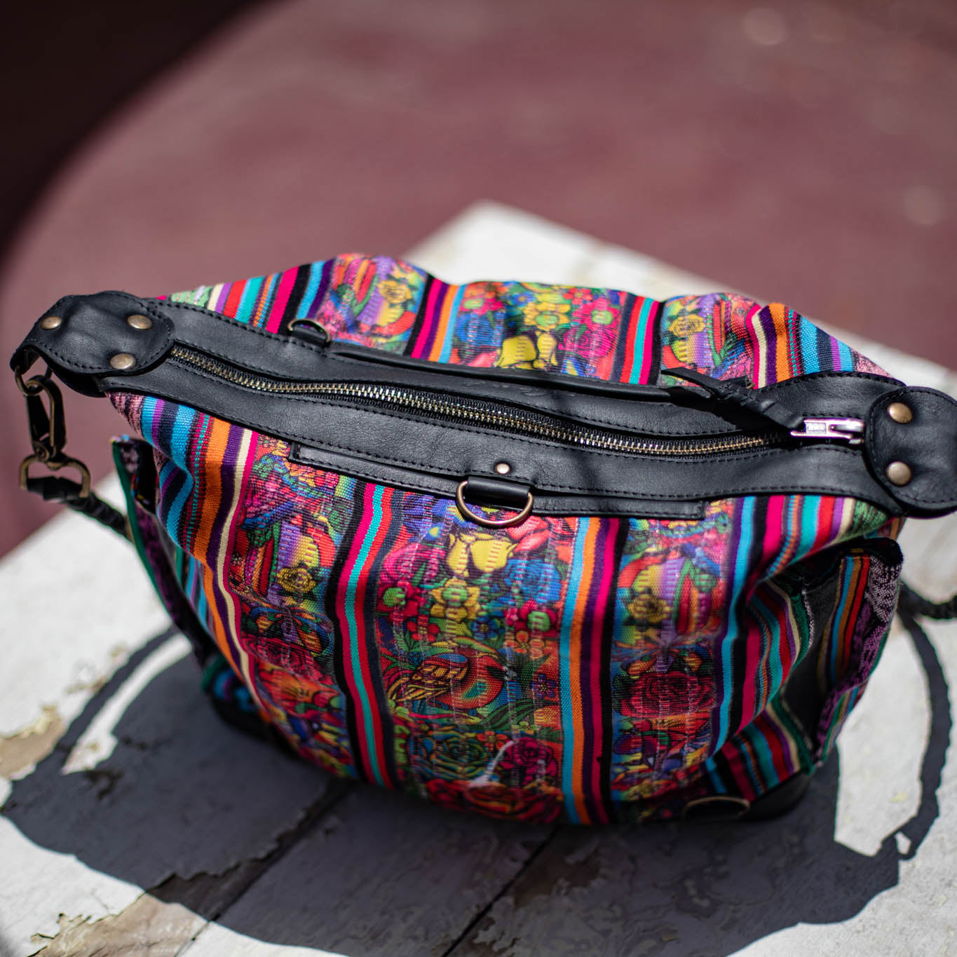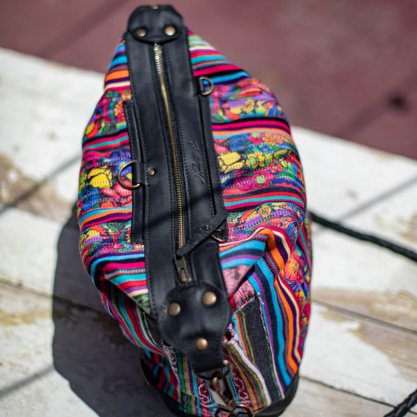 Many unique Maya symbols can be found in our One of a Kind Collection. The fabric we use for this collection is made from upcycled vintage huipiles (traditional attire worn by women in Guatemala) that were handwoven by Artisans up to 10 years ago, and they have lived a full life before being incorporated into your leather bag!