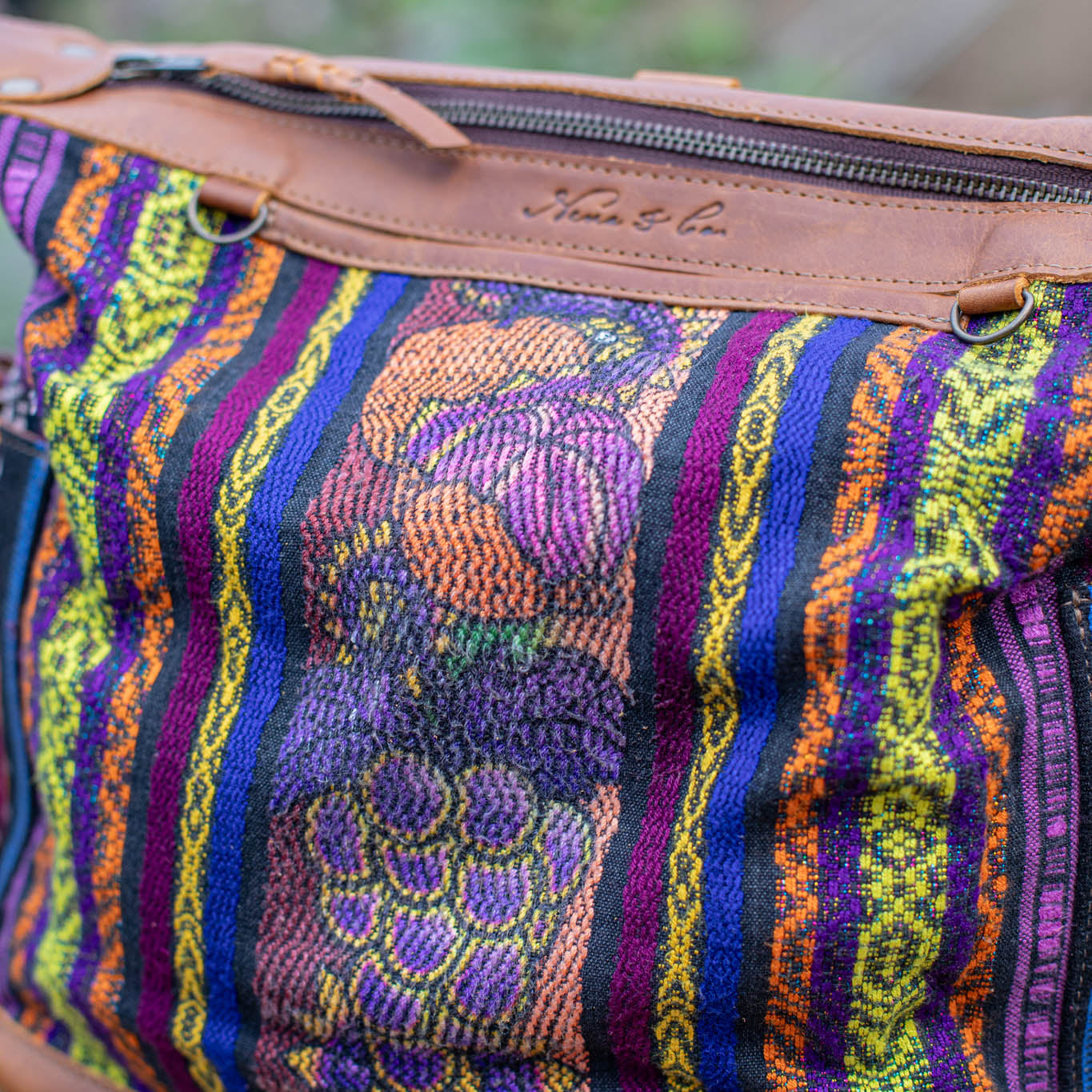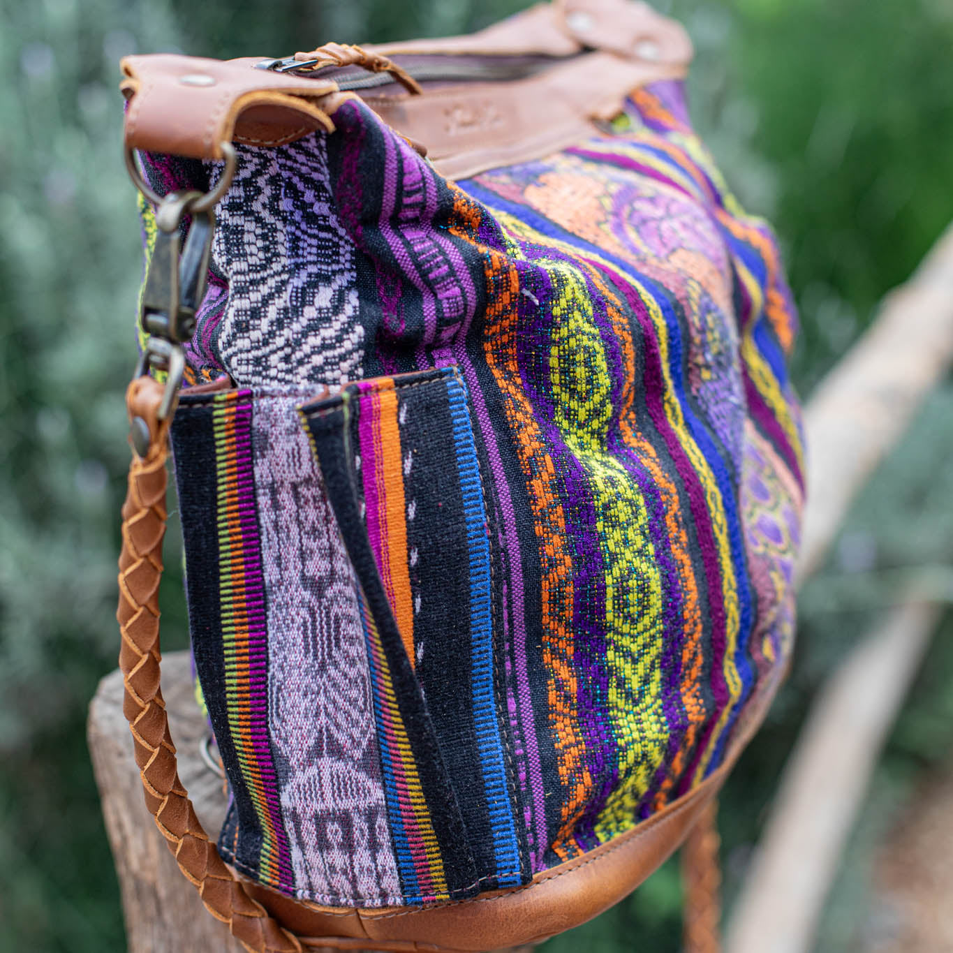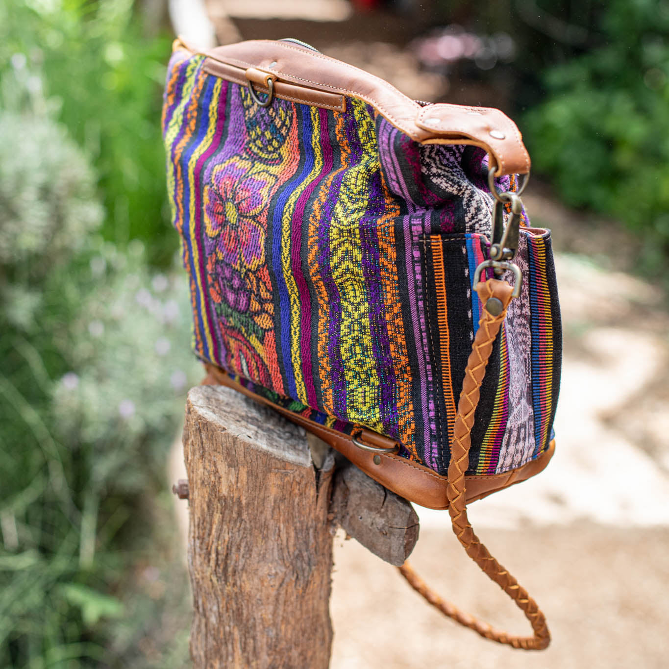 Many unique Maya symbols can be found in our One of a Kind Collection. The fabric we use for this collection is made from upcycled vintage huipiles (traditional attire worn by women in Guatemala) that were handwoven by Artisans up to 10 years ago, and they have lived a full life before being incorporated into your leather bag!
